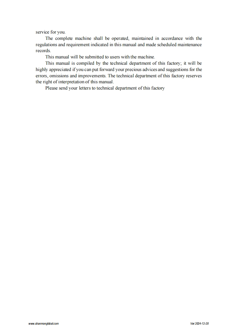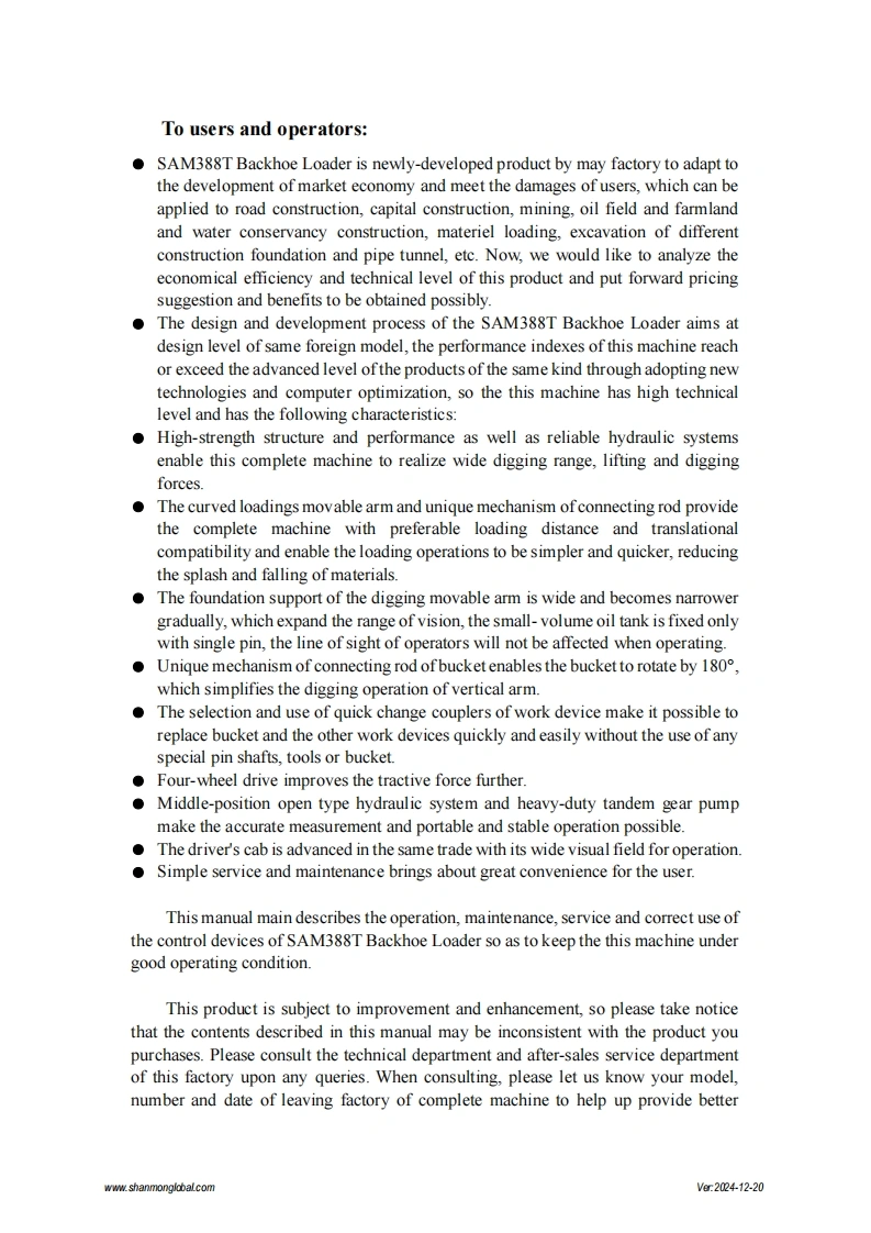 SHANMON388T Backhoe LoaderOperation and Maintenance ManualShandong Weimeng Machinery Technology Co.,Ltdwww.shanmonglobal.comVer2024-12-20Shandong Weimeng Machinery Technology Co.,LtdAddress:No.9567,Nanhuan Road,Qingzhou City,Shandong Province,China