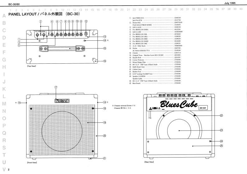 July 1996BC-30V60日-日▣/6▣SERVICE NOTESSPECIFICATIONS/仕樣【ec-3lFirst Edition1BC-0e1BluesCube01LL1了厚F平P44:am0Wa-0T竹s●22C门卡D=44-++++++4+1HA月I了hM00LAL ChaeelTABLE OF CONTENTS目次Page8KT 8otck5山CC围-dNnW/西GENERAL VIEWMD儿uEWOLLDIERAGESPECIFICATIONS仕横…1BGKT SeichLEAl ChimdlPANEL LAYOUT/バ礻外硬回(C30)2程OuE1OSTWHIN0EXPLODED VIEW分解回(B0-30》…3FE VLUVEPARTS LIST/t-y少入卜(BC-30以4POT VOILLVE48CIRCUIT BOARD基板回(BC.30)5V月tAEBTn山CIRCUIT DIAGRAM回路☒〈PCB/BC-3D6比NASTEIGendVUCKKLRAKIPANEL LAYOUT)《来儿外领冈《BC60》4…7PrWEI Susch3040523电7有-…tNTAEXPLODED VIEW分第☒《日C创)4·CRANKELSELECTYRo Sea:tPARTS LIST-y)又卜BC6的)…V120 00/IcbolHEEXCECIRCUIT BOARD基板回(BC0)…104181u求hCIRCUIT DIAGRAM回路☒(PAE/BC60)…11ee作/3a夕奥一==一…-一:Tc垂/重里GHh目.T4WCIRCUIT BOARD基板圆(P0WEA/BC-80)…12T.DeBTRBTsotSekdi●ecda4/付国4=-==-10wn山=Jipaoete Ponoagen于1T手×力香ADJUSTMENT调整仕横(但C-0)412Dhwors )anakTngat)PV00806%6卡e到ethsCIRCUIT DIAGRAM回路☒(POWER/BCGD)13年3te件r制先及Rabad Pt08见5410D1451103桥1ux1FV1情重州重重44一12a42 Be Soe◆A2e4y州其4es34d线物%m相花大国Oweer's hlamal eah PMo-b0d06134年3w销光是GENERAL VIEW/概觀☒日C-30/日C-608C-30BC-60Rohnd。6l6.o6o6o6ō96g8-co000⊙6100·●06.0000000100▣Roland17059816Printed in Japan AFAO (DP)1