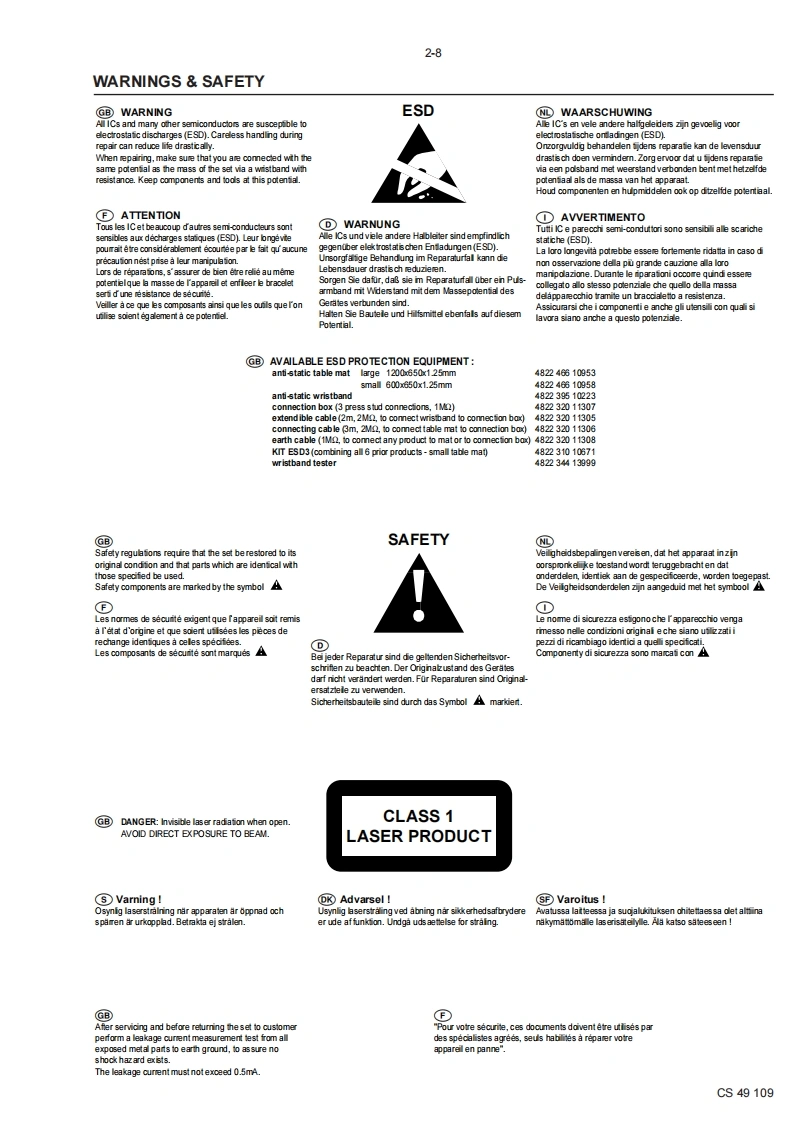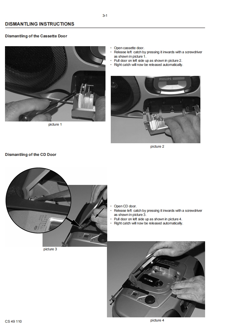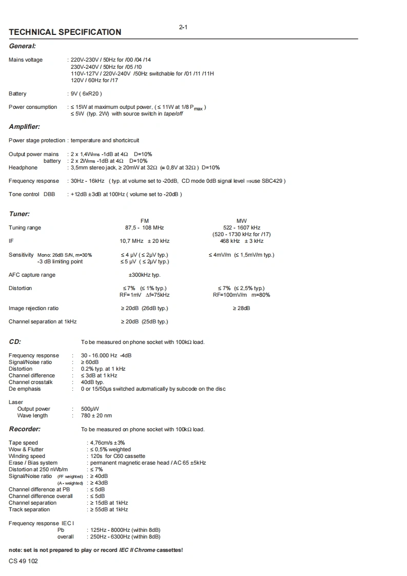 CD Stereo Radio RecorderAZ1009100105/17ServiceAZ101010010110405/10/11/11H/14/17ServiceServiceService IManualdiscDIGITAL AUDIOTABLE OF CONTENTSchapterchapterTechnical Specification…2.1FRONT BOARDMeasurement setup..2-2component layoutControls&Connections......……………237-1schematic diagram.7-2BriefOperating Instructions..................2-4 to 2-7Warnings Safety2-8COMBI BOARDcomponent layout ..7-1,7-4Dismantling Instructions3-1to3-3schematic diagram CD part..7-2Service hints.....3-4to3-6Recorder/Amplifier part............7-3CD-startup procedure.37Abbreviations CD-ICs.…3-8EXPLODED VIEWSService Test Program........3-10apparatus,drawing 18-1apparatus,drawing 2.….8-2BLOCK DIAGRAM..4-1tape transport.......8-3WIRING DIAGRAM5-1MECHANICAL PARTSLIST see Exploded viewsELECTRICAL PARTSLIST..9ffTUNER BOARDschematic diagram6-1component layout6-2adjustment table6-2CLASS 1Copyright 1997 Philips Consumer Electronics B.V.Eindhoven,The NetherlandsLASER PRODUCTAll rights reserved.No part of this publicafion may be reproduced,stored in a retrievalsystem or transmitted,in any form or by any means,electronic,mechanical,photocopying,or otherwise without the prior permission of Phillips.Published by MS 9741Service Audio Printed in The Netherlands Subject to modification画482272526015CS49101PHIUPSPHILIPS