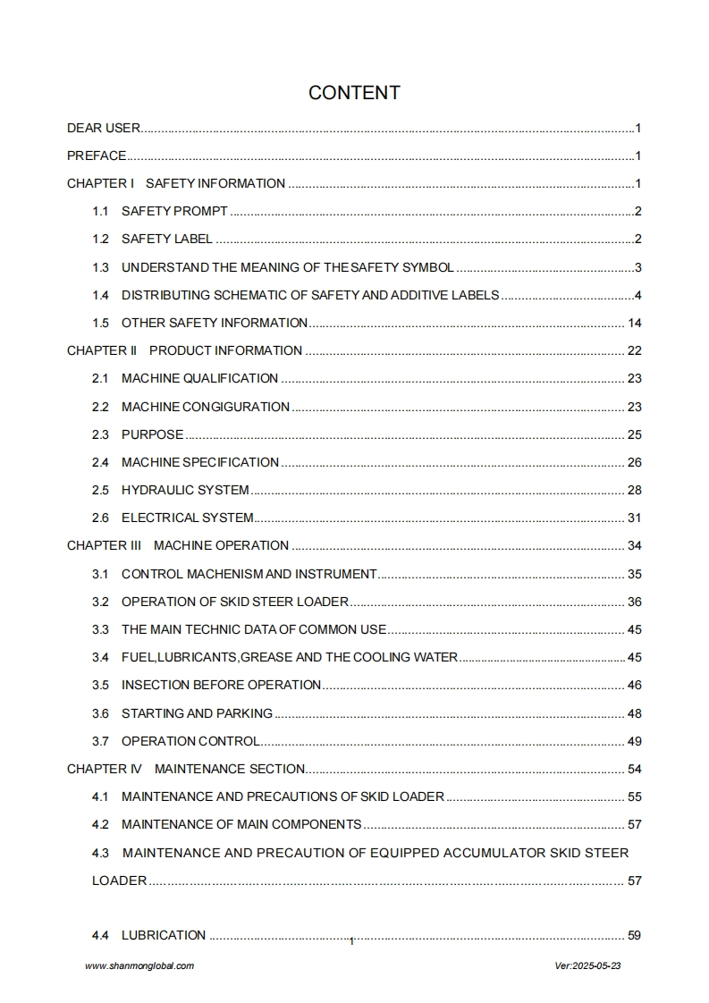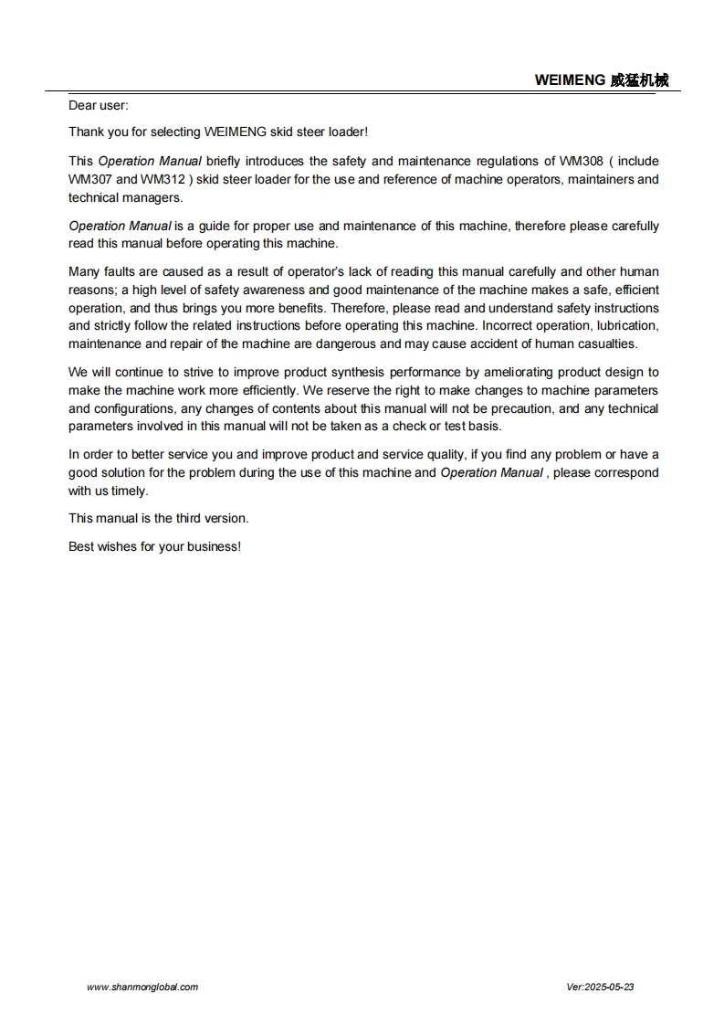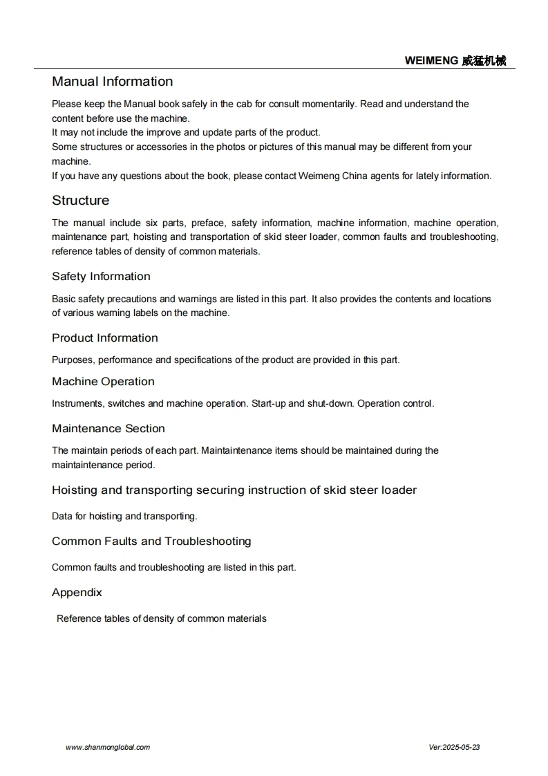 SHANMONSkid Steer loaderOperation and Maintenance ManualShandong Weimeng Machinery Technology Co.,Ltdwww.shanmonglobal.comSHANM NSHANMONM32Ver2025-05-23Shandong Weimeng Machinery Technology Co.,LtdAddress:No.9567,Nanhuan Road,Qingzhou City,Shandong Province,China