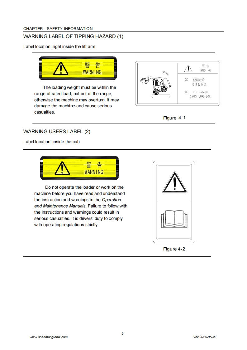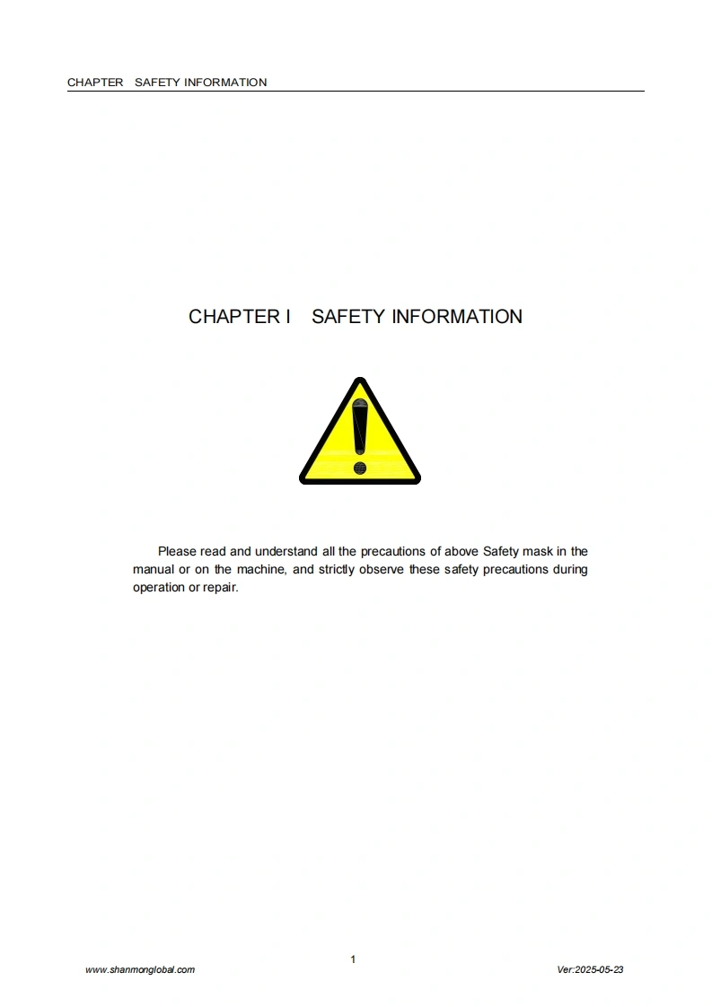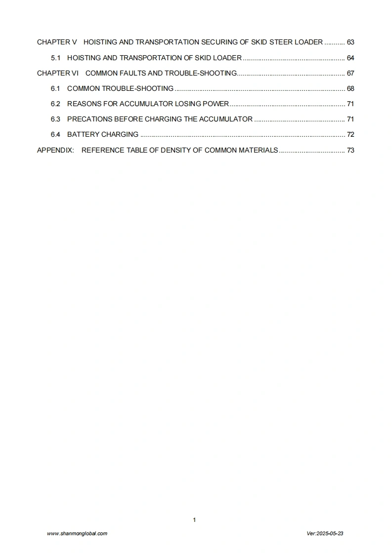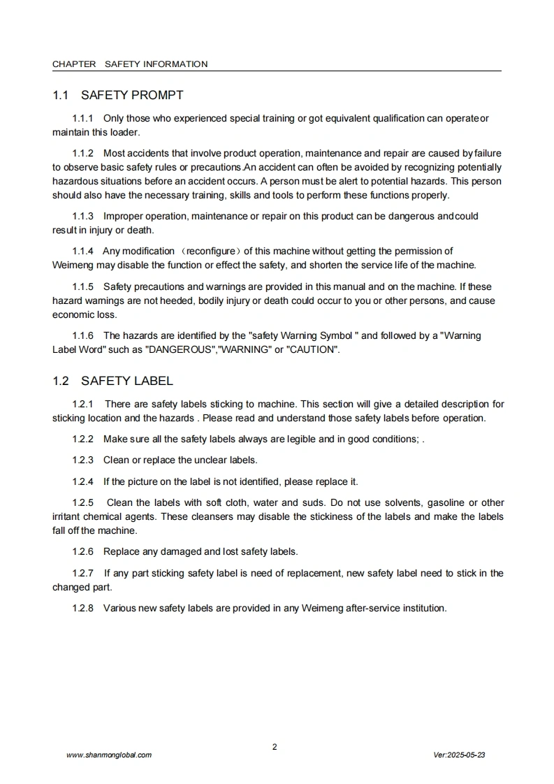SHANMONSkid Steer loaderOperation and Maintenance ManualShandong Weimeng Machinery Technology Co.,Ltdwww.shanmonglobal.comSHANM NSHANMONM32Ver2025-05-23Shandong Weimeng Machinery Technology Co.,LtdAddress:No.9567,Nanhuan Road,Qingzhou City,Shandong Province,China