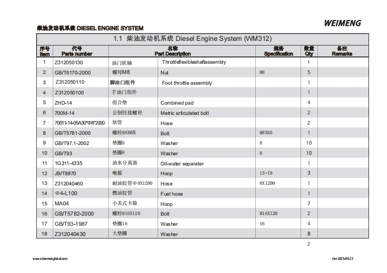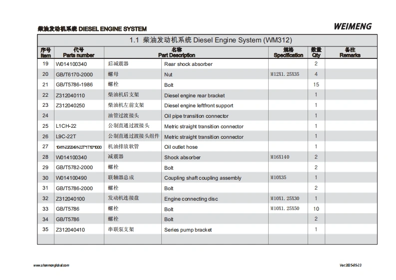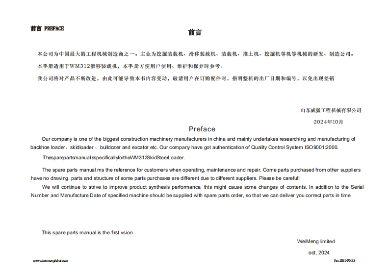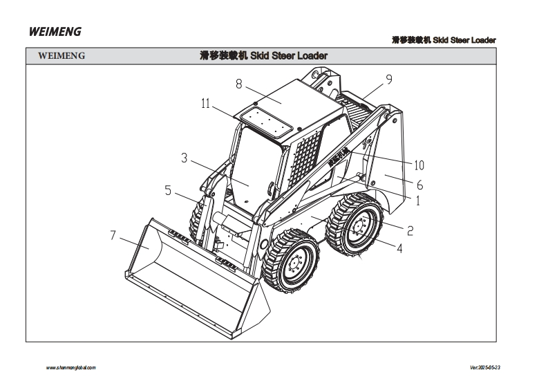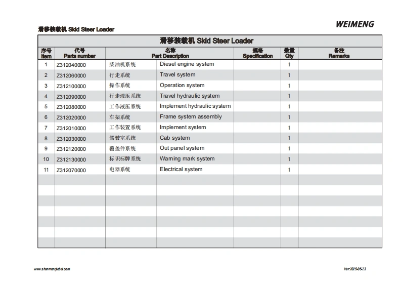 SHANMONWM 312 Skid Steer LoaderExploded DrawingShandong Weimeng Machinery Technology Co.,Ltdwww.shanmonglobal.comSHANMONer2025-05-23Shandong Weimeng Machinery Technology Co.,LtdAddress:No.9567,Nanhuan Road,Qingzhou City,Shandong Province,China