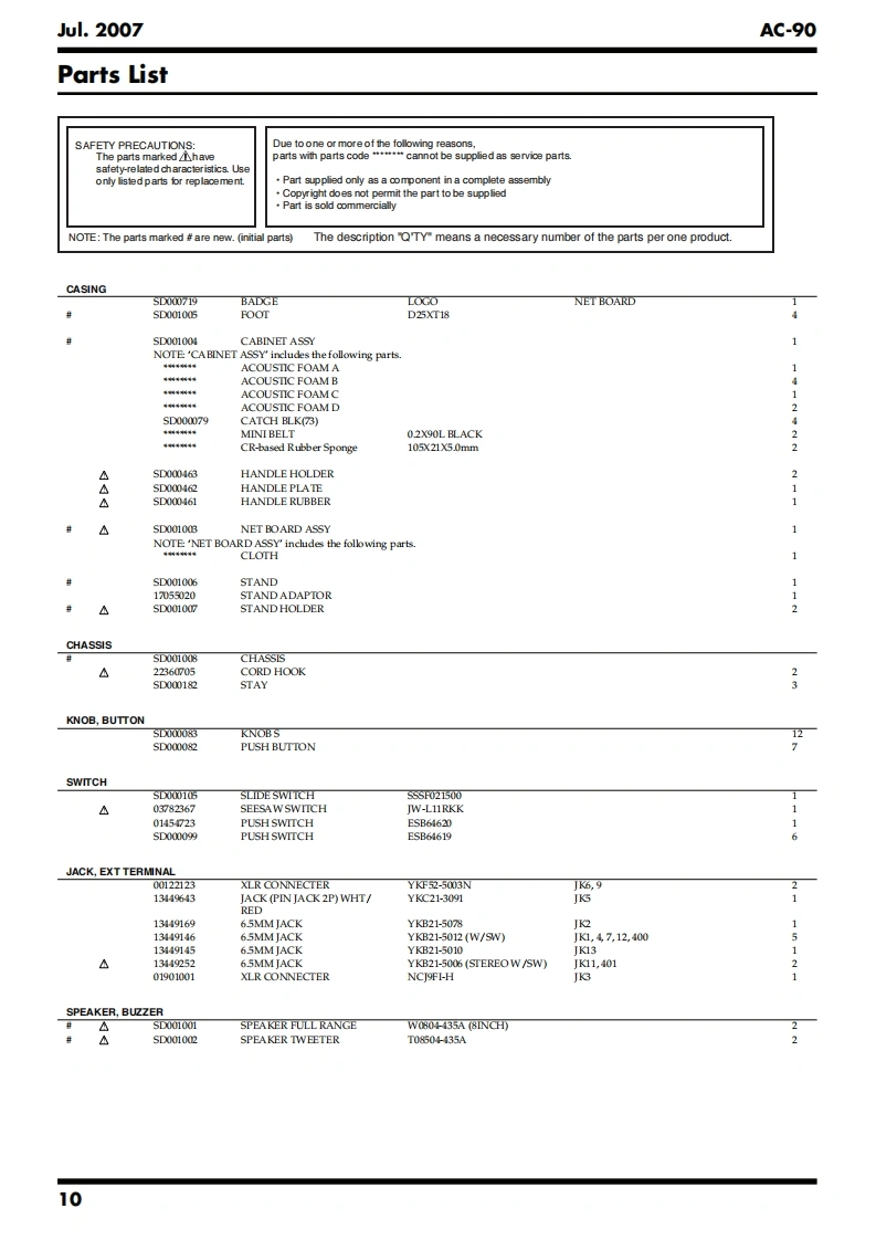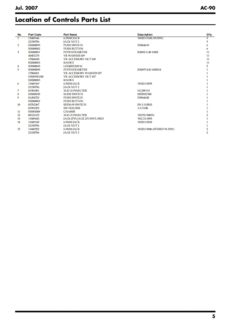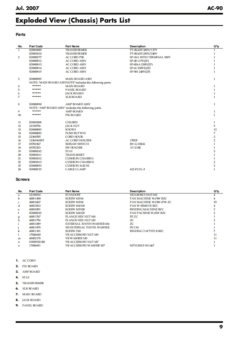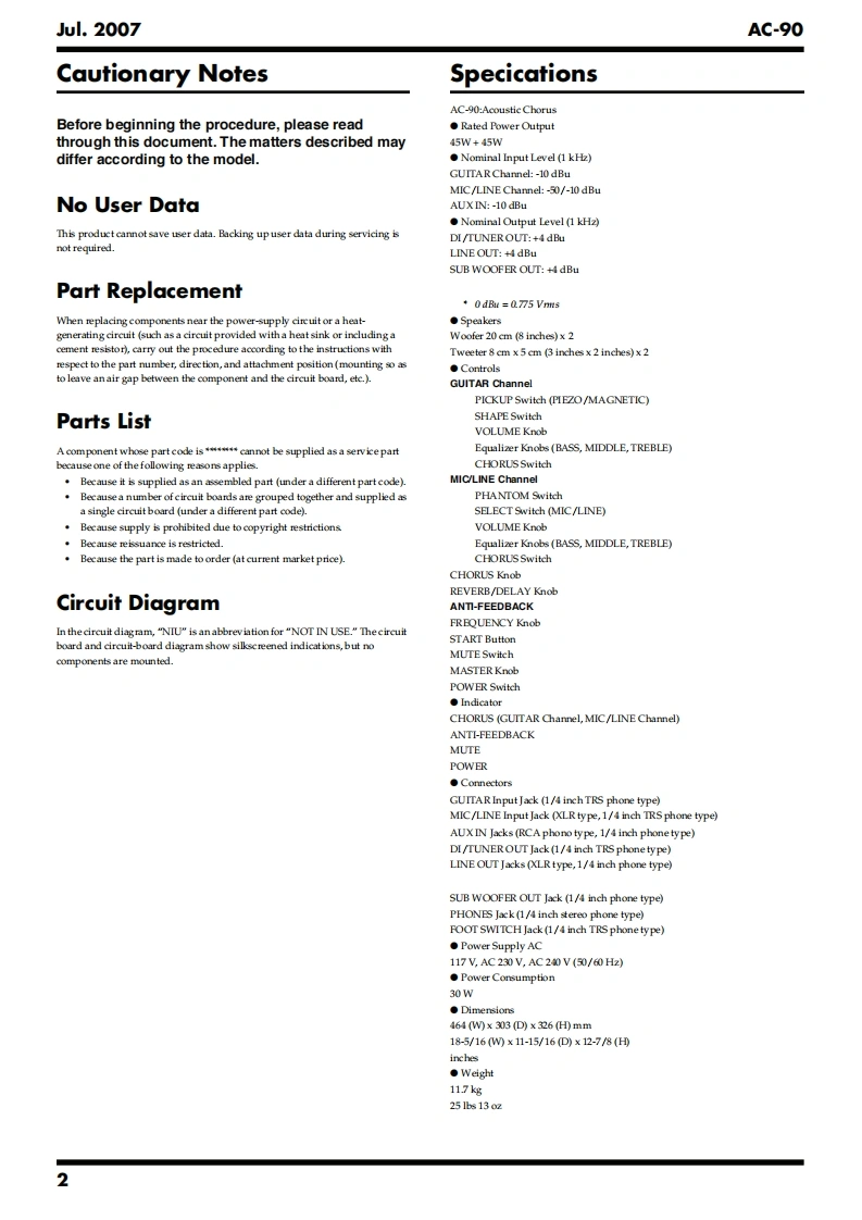 Jul.2007AC-90AC-90SERVICE NOTESIssued by RJAACOUSTIC CHORUSTable of ContentsCautionary Notes.....2Circuit Board(Main,XLR Board).......22SpecicationS.2Circuit Diagram (Main Board:Digital)......4Location of Controls..........4Circuit Diagram(Main Board:Analog,XLR Board)..26Location of Controls Parts List5Circuit Diagram (Main Board:Power Supply)......8Exploded View (Cabinet)..6Circuit Board (Jack Board)..30Exploded View (Cabinet)Parts List......7Circuit Diagram (Jack Board).32Exploded View (Chassis).8Circuit Board (Panel Board)...............34Exploded View (Chassis)Parts List.........9Circuit Diagram (Panel Board)...36PartS List10Circuit Board (PS1 Board).............38Verifying the Version Number....................................14Circuit Diagram (PS1 Board).39TestCircuit Board(Amp Board)......40Block Diagram/Wiring Diagram..20Circuit Diagram(Amp Board)..…42RolandCopyright 2007 ROLAND CORPORATIONAll rights reserved.No part of this publication may be reproduced in any form without the written permissionof ROLAND CORPORATION.Roland17058507E0Printed in Japan (0400)(SC-MZ)