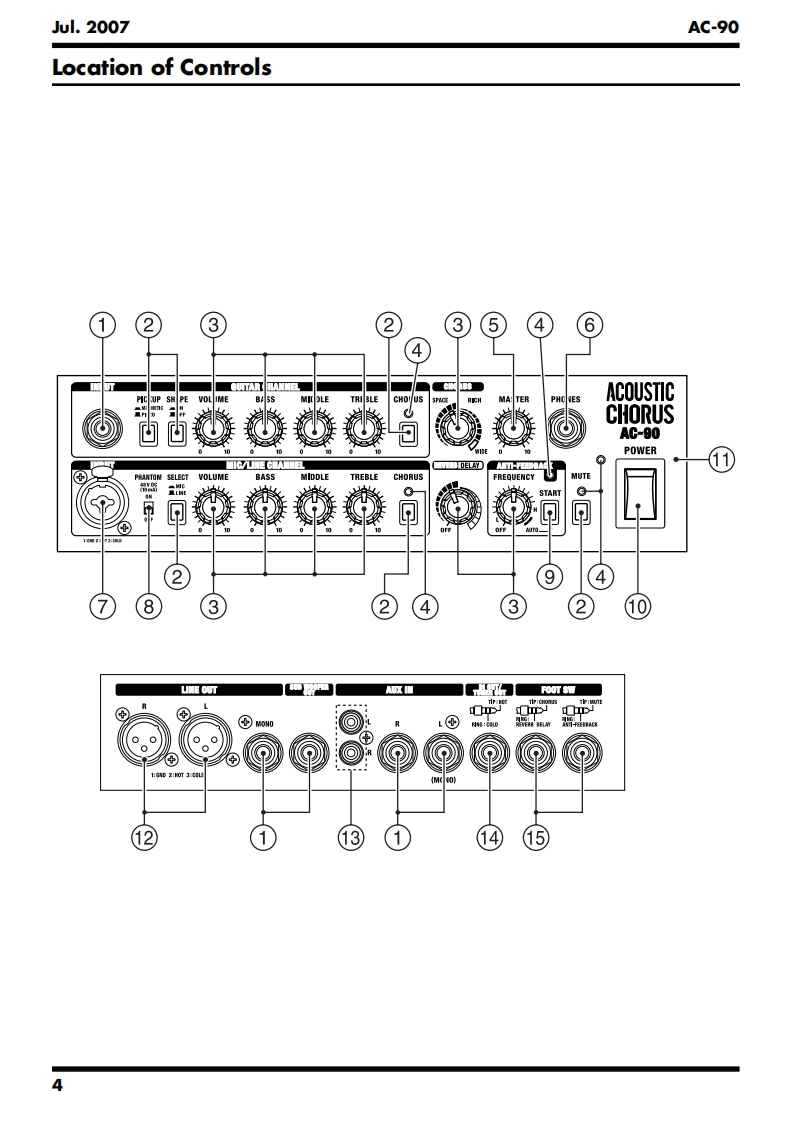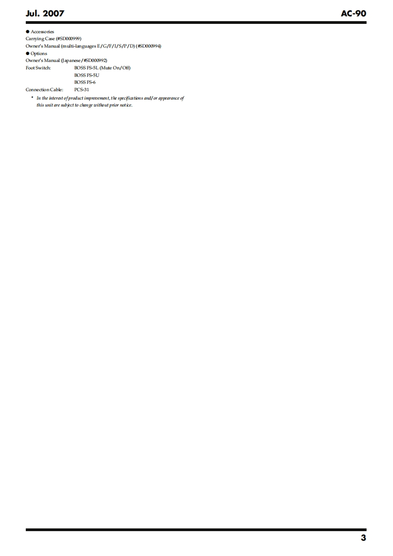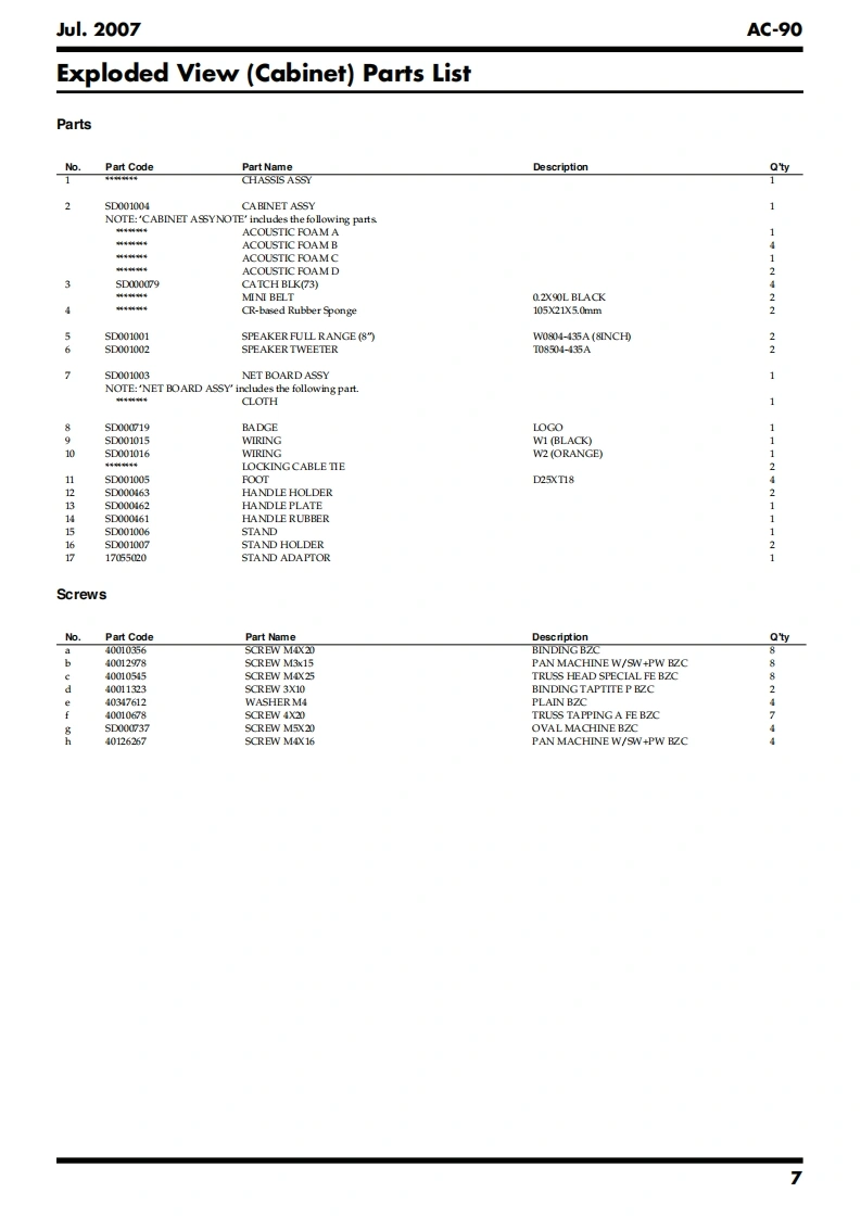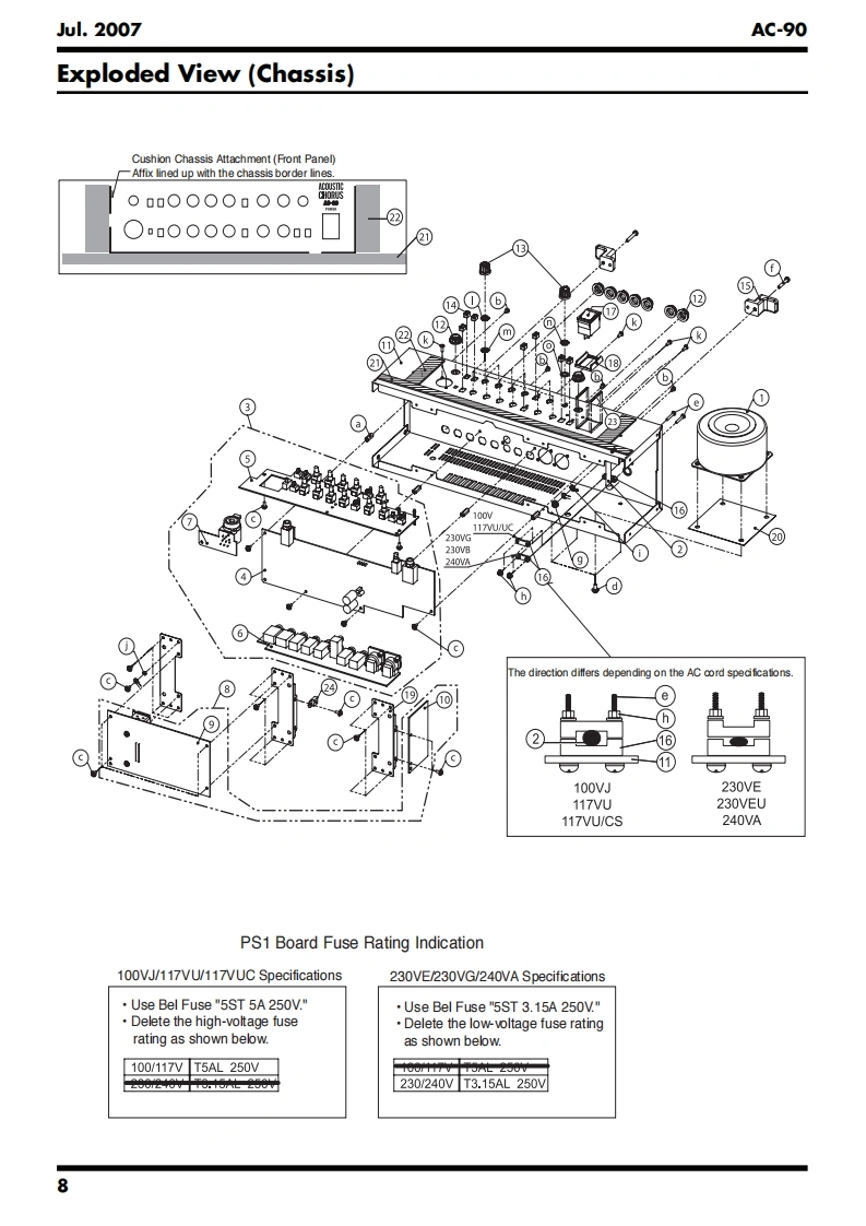 Jul.2007AC-90AC-90SERVICE NOTESIssued by RJAACOUSTIC CHORUSTable of ContentsCautionary Notes.....2Circuit Board(Main,XLR Board).......22SpecicationS.2Circuit Diagram (Main Board:Digital)......4Location of Controls..........4Circuit Diagram(Main Board:Analog,XLR Board)..26Location of Controls Parts List5Circuit Diagram (Main Board:Power Supply)......8Exploded View (Cabinet)..6Circuit Board (Jack Board)..30Exploded View (Cabinet)Parts List......7Circuit Diagram (Jack Board).32Exploded View (Chassis).8Circuit Board (Panel Board)...............34Exploded View (Chassis)Parts List.........9Circuit Diagram (Panel Board)...36PartS List10Circuit Board (PS1 Board).............38Verifying the Version Number....................................14Circuit Diagram (PS1 Board).39TestCircuit Board(Amp Board)......40Block Diagram/Wiring Diagram..20Circuit Diagram(Amp Board)..…42RolandCopyright 2007 ROLAND CORPORATIONAll rights reserved.No part of this publication may be reproduced in any form without the written permissionof ROLAND CORPORATION.Roland17058507E0Printed in Japan (0400)(SC-MZ)