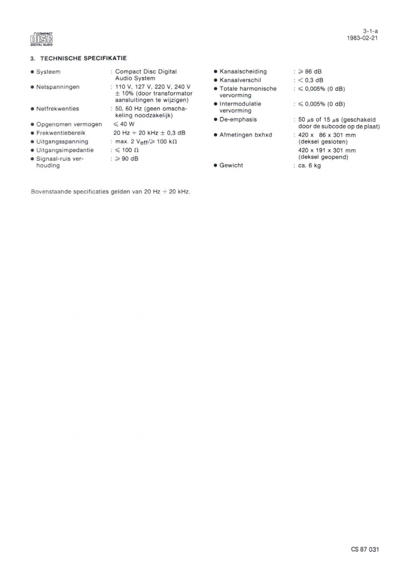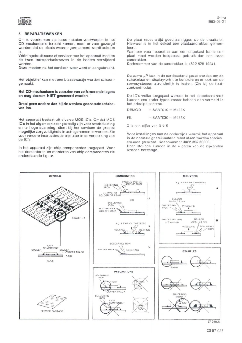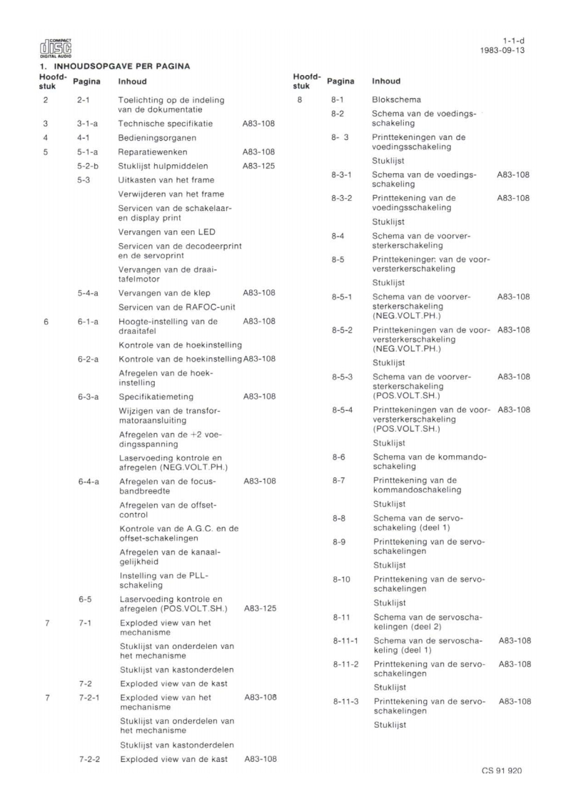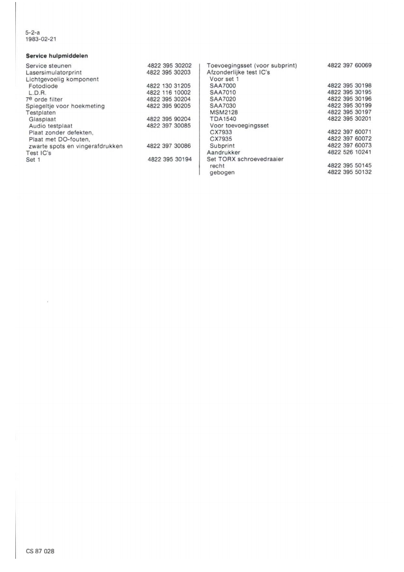 Compact Disc CD200/00/0sServiceServiceService30705A15Service ManualdiScCOMPACTDIGITAL AUDIOINHOUD1.Inhoudsopgave per pagina2.Toelichting op de indeling van de dokumentatie3.Technische specifikatie4.Bedieningsorganen5.Reparatiewenken6.Metingen en instellingen7.Exploded view's en stuklijsten van mechanischeonderdelen8.Blokschema,principeschema's,printplaatgegevensen stuklijsten van elektrische onderdelen9.Bedradingstekening10.Foutzoekmethode11.Wijzigingen12.Additionele informatieCLASS 1Veiligheidsbepalingen vereisen.dat het apparaat bij reparatie inLASER PRODUCTzijn oorspronkelijke toestand wordt teruggebracht en dat onderdelen,identiek aan de gespecificeerde.worden toegepast.Documentation Technique Service Dokumentation Documentazione di Servizio Huolte-Ohje Manual de Servicio Manual de ServicioSubect to modficationNL482272540703PHILIPSCS87024Printed n The Netherlands