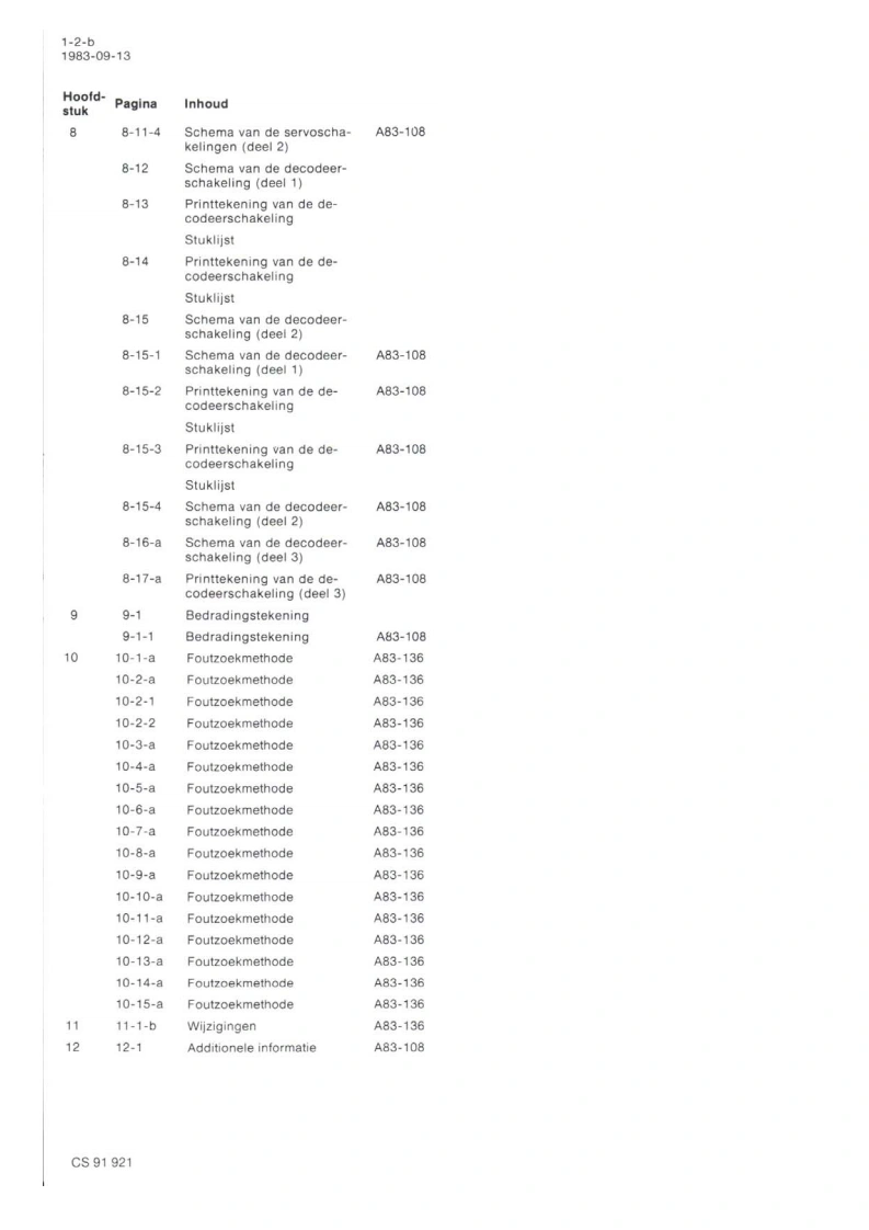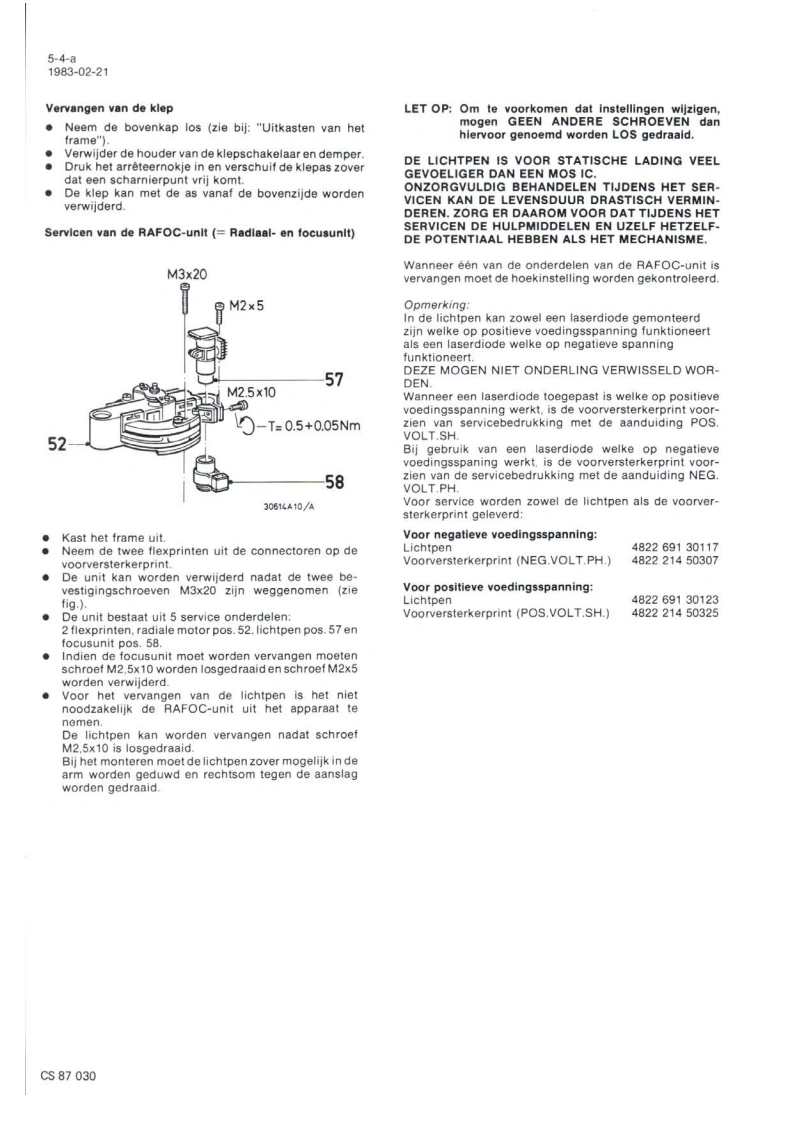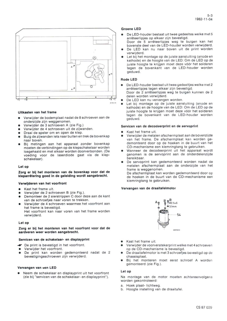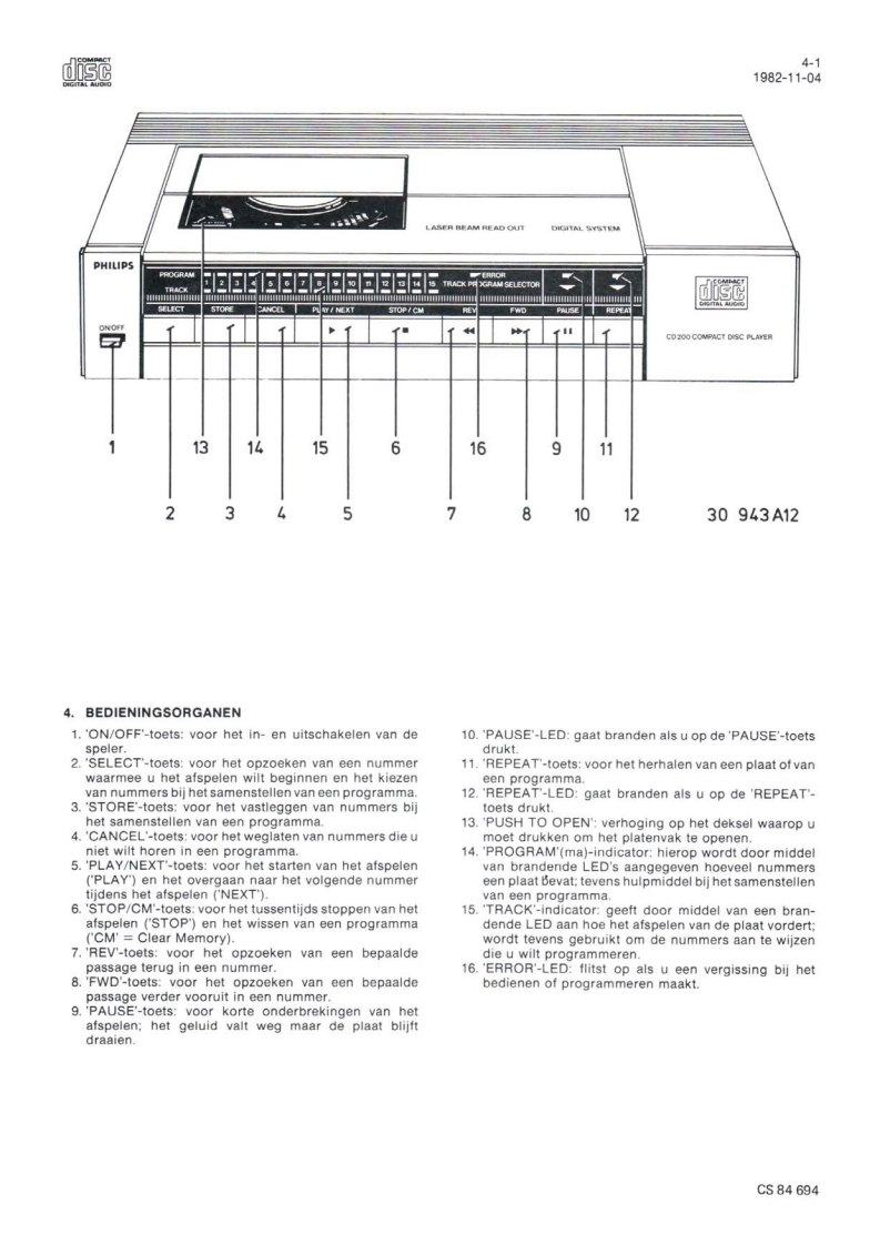 Compact Disc CD200/00/0sServiceServiceService30705A15Service ManualdiScCOMPACTDIGITAL AUDIOINHOUD1.Inhoudsopgave per pagina2.Toelichting op de indeling van de dokumentatie3.Technische specifikatie4.Bedieningsorganen5.Reparatiewenken6.Metingen en instellingen7.Exploded view's en stuklijsten van mechanischeonderdelen8.Blokschema,principeschema's,printplaatgegevensen stuklijsten van elektrische onderdelen9.Bedradingstekening10.Foutzoekmethode11.Wijzigingen12.Additionele informatieCLASS 1Veiligheidsbepalingen vereisen.dat het apparaat bij reparatie inLASER PRODUCTzijn oorspronkelijke toestand wordt teruggebracht en dat onderdelen,identiek aan de gespecificeerde.worden toegepast.Documentation Technique Service Dokumentation Documentazione di Servizio Huolte-Ohje Manual de Servicio Manual de ServicioSubect to modficationNL482272540703PHILIPSCS87024Printed n The Netherlands