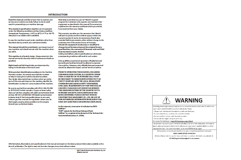 PART NO.ENMDDS-NA1-1HITACHIZX345USLC-ONReliable solutionsOperator's ManualZAXISOPERATOR'S345USLC-6NHydraulic ExcavatorHitachi Construction Machinery Co.,Ltd.URL:http://www.hitachi-c-m.comDe This book is printad on recycld papa.PRNTEDIN JAPAN 2017.12ENMODS-NA1-1Serial No.010001 and up