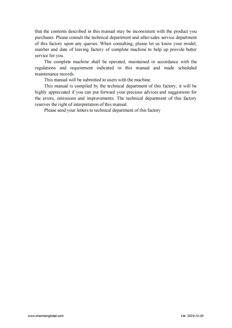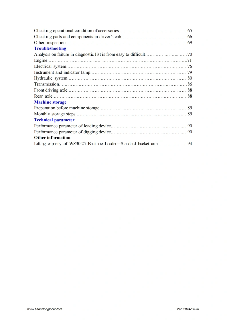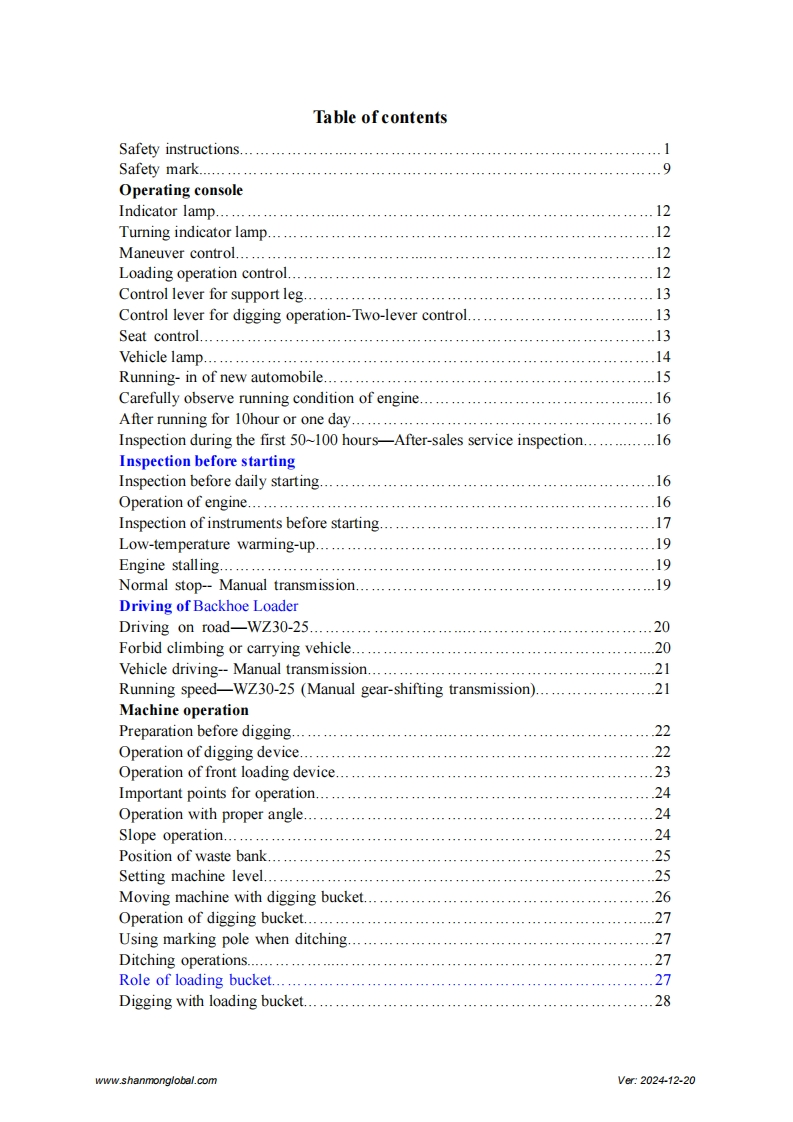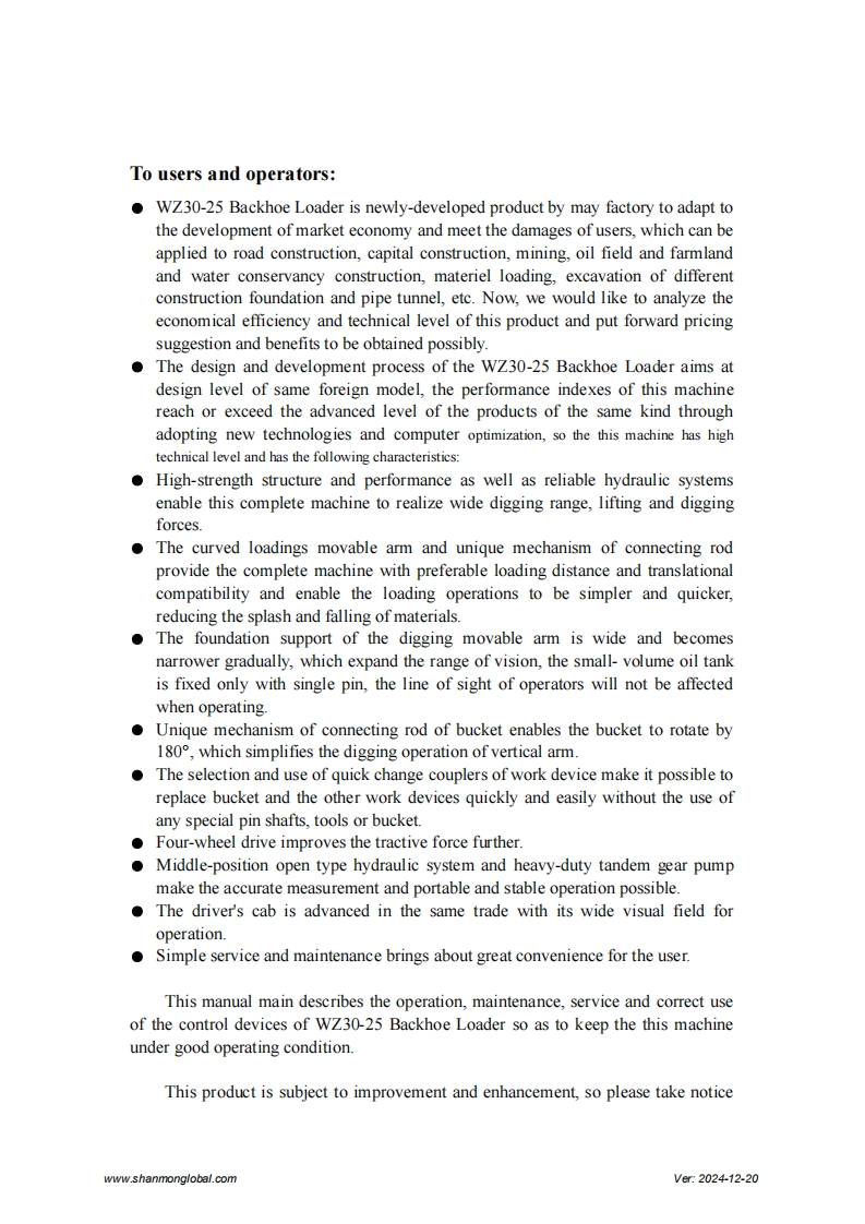 SHANMONWZ30-25 Backhoe LoaderOperation and Maintenance ManualShandong Weimeng Machinery Technology Co.,Ltdwww.shanmonglobal.comSZ-0EZMVer2024-12-20Shandong Weimeng Machinery Technology Co.,LtdAddress:No.9567,Nanhuan Road,Qingzhou City,Shandong Province,China