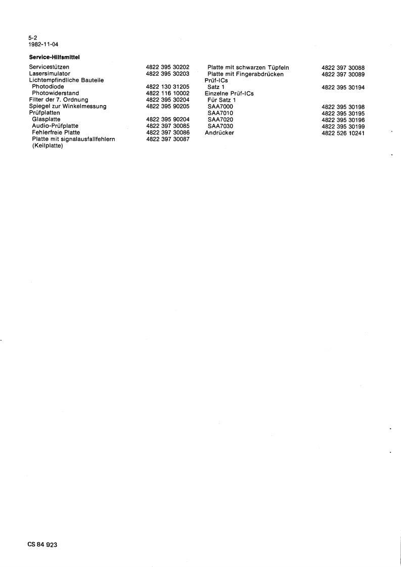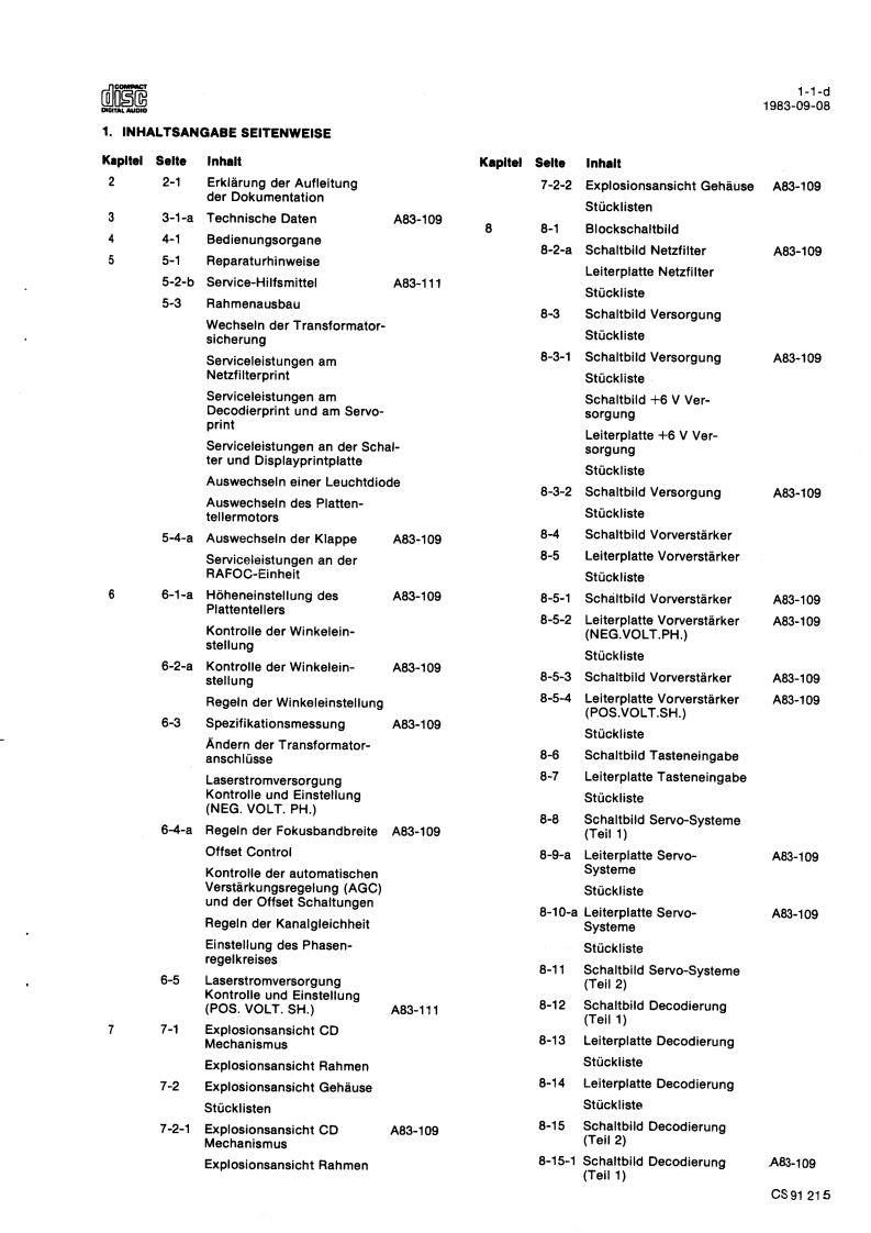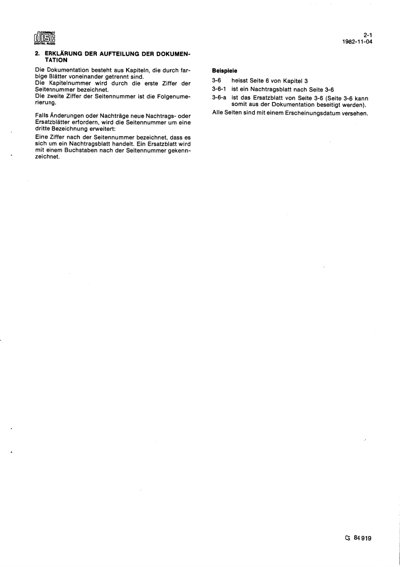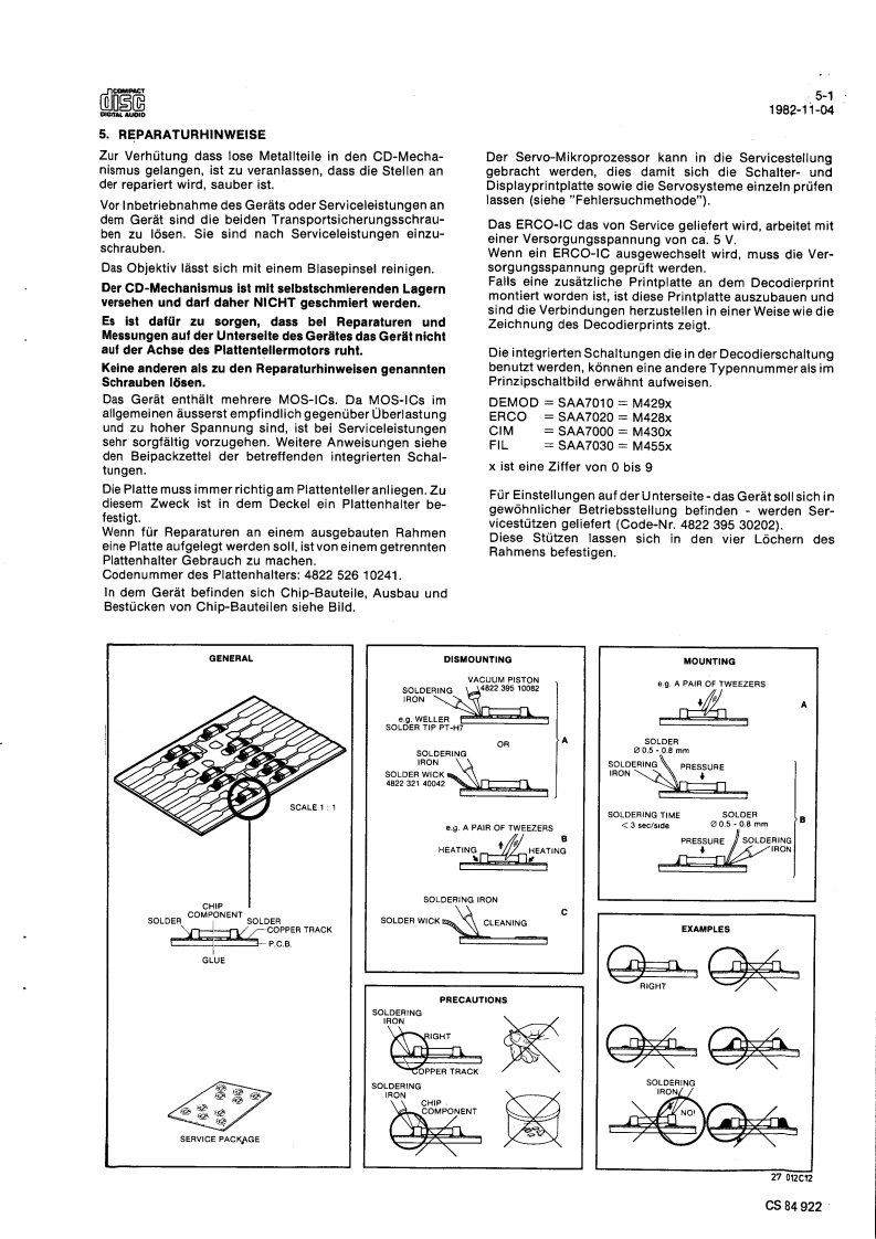Compact Disc CD100ServiceServiceService30704A15Service Manuads范DIGITAL AUDIOINHALTSVERZEICHNISInhaltsangabe seitenweiseErklarung der Aufteilung der Dokumentation3Technische Daten4Bedienungsorgane5Reparaturhinweise6Messungen und Einstellungen7Explosionsansichten und Stucklisten vonmechanischen Bauteilen8Blockschaltbilder,Prinzipschaltbilder,Angaben zur Leiterplatte und Stuck-listen von elektrischen Bauteilen9Verdrahtungszeichnung10Fehlersuchmethode11AnderungenBei jeder Reparatur sind die geltenden Sicherheitsvorschriften zubeachten.Der Originalzustand des Gerats darf nicht verandert werden:fur Reparaturen sind Original-Ersatzteile zu verwenden.Documentation Technique Service Dokumentation Documentazione di Servizio Huolte-Ohje Manual de Servicio Manual de ServicioSubject to modilicationD482272515112PHILIPSCS84917