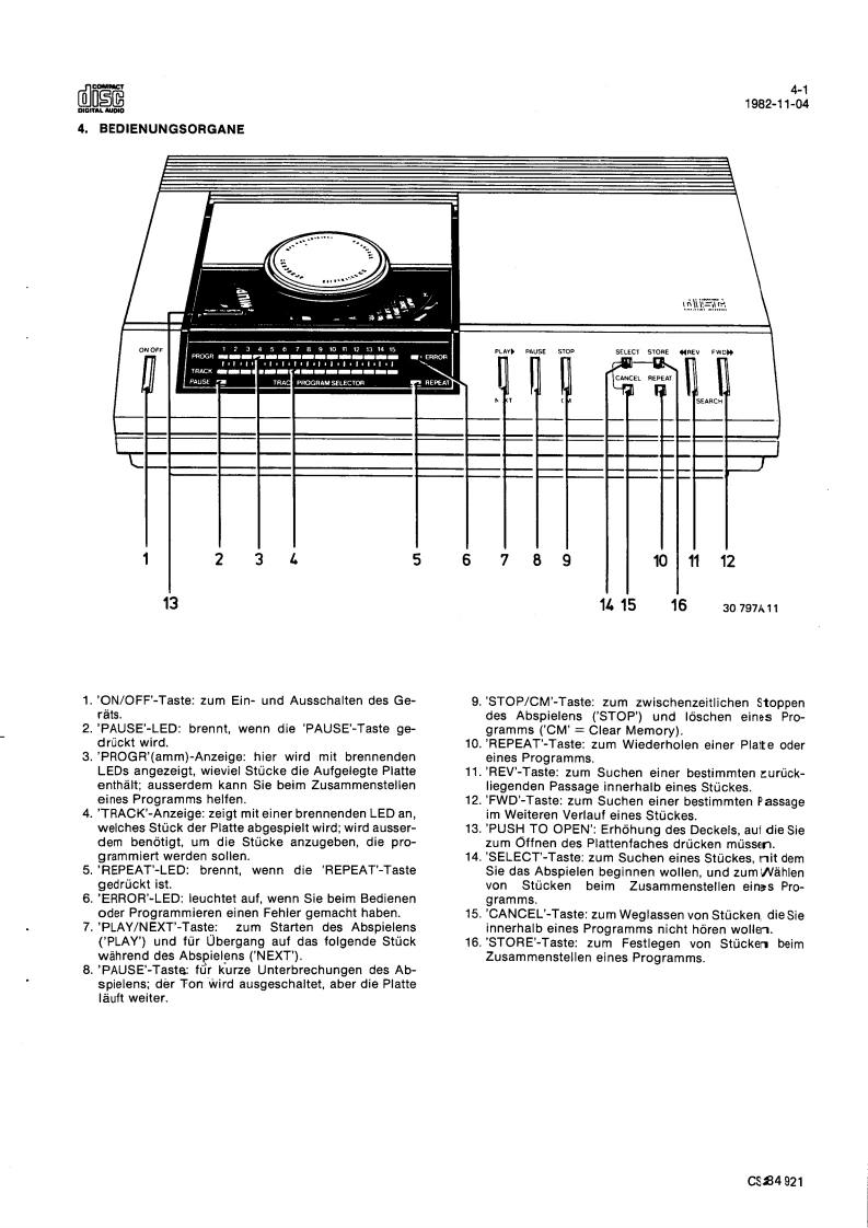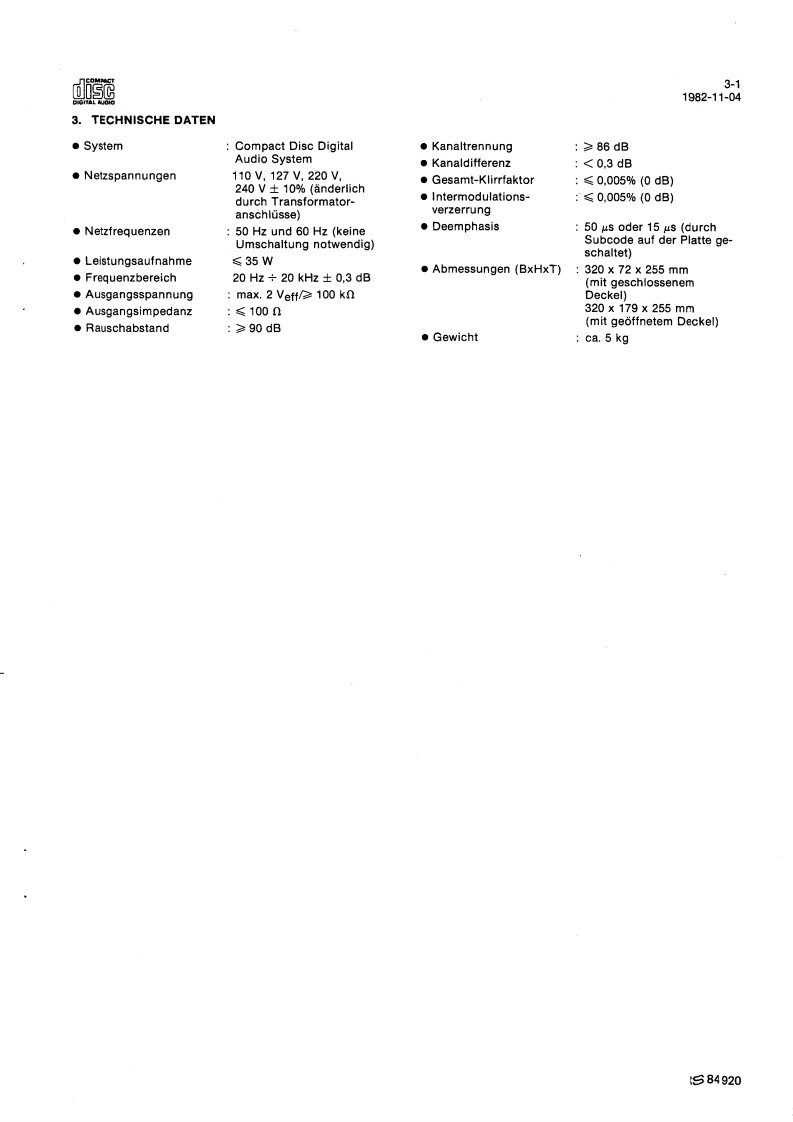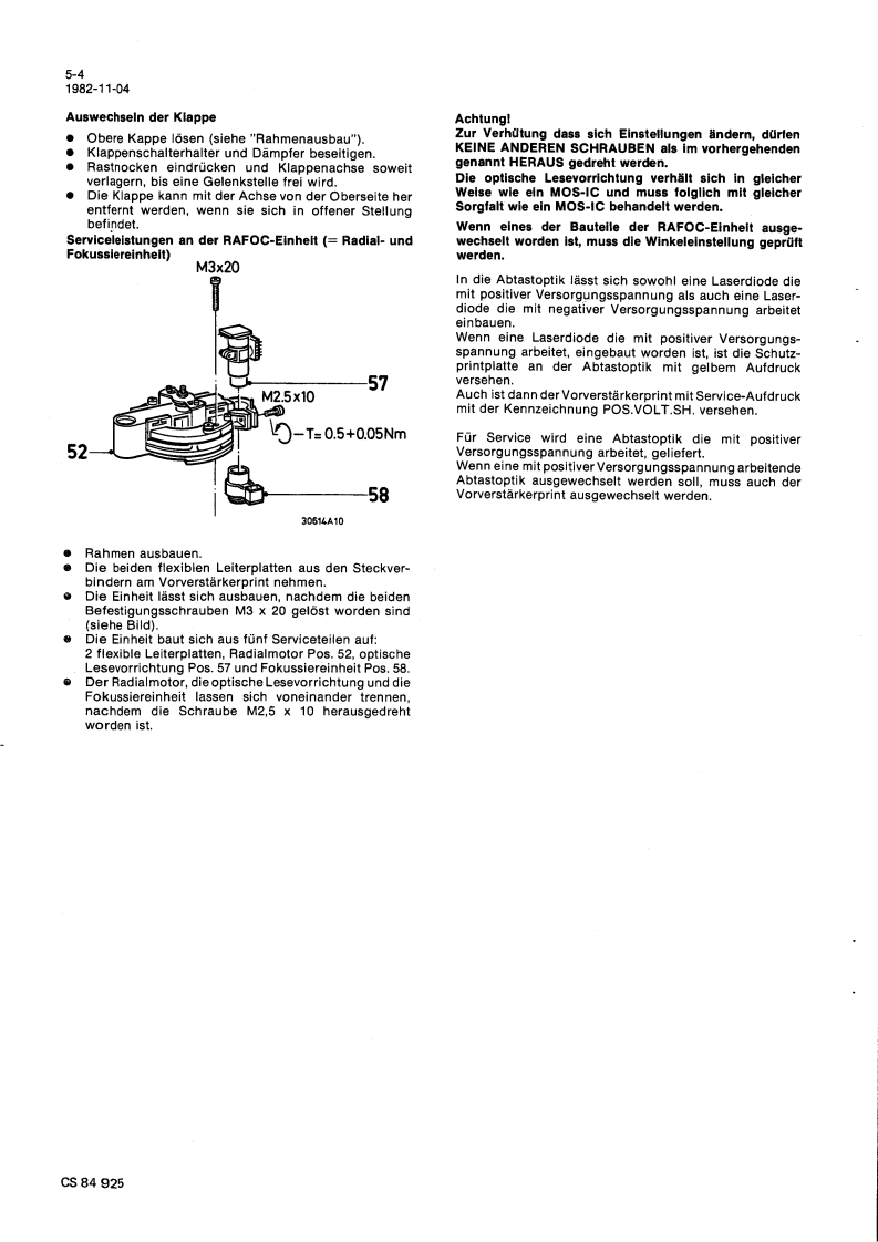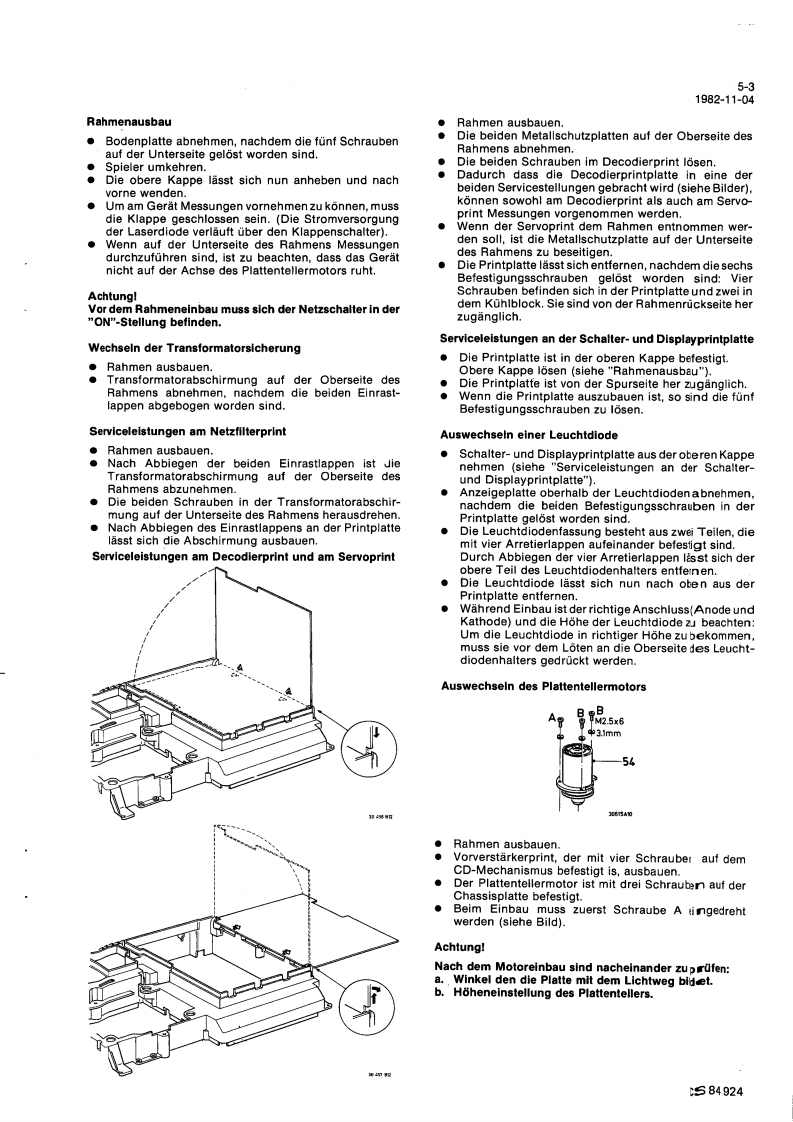 Compact Disc CD100ServiceServiceService30704A15Service Manuads范DIGITAL AUDIOINHALTSVERZEICHNISInhaltsangabe seitenweiseErklarung der Aufteilung der Dokumentation3Technische Daten4Bedienungsorgane5Reparaturhinweise6Messungen und Einstellungen7Explosionsansichten und Stucklisten vonmechanischen Bauteilen8Blockschaltbilder,Prinzipschaltbilder,Angaben zur Leiterplatte und Stuck-listen von elektrischen Bauteilen9Verdrahtungszeichnung10Fehlersuchmethode11AnderungenBei jeder Reparatur sind die geltenden Sicherheitsvorschriften zubeachten.Der Originalzustand des Gerats darf nicht verandert werden:fur Reparaturen sind Original-Ersatzteile zu verwenden.Documentation Technique Service Dokumentation Documentazione di Servizio Huolte-Ohje Manual de Servicio Manual de ServicioSubject to modilicationD482272515112PHILIPSCS84917