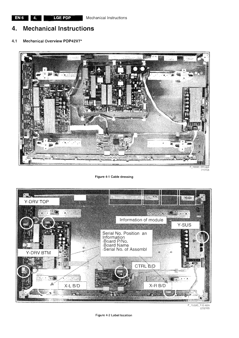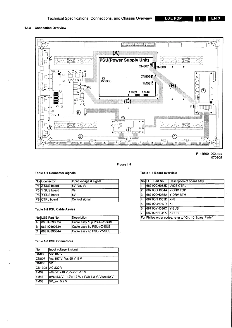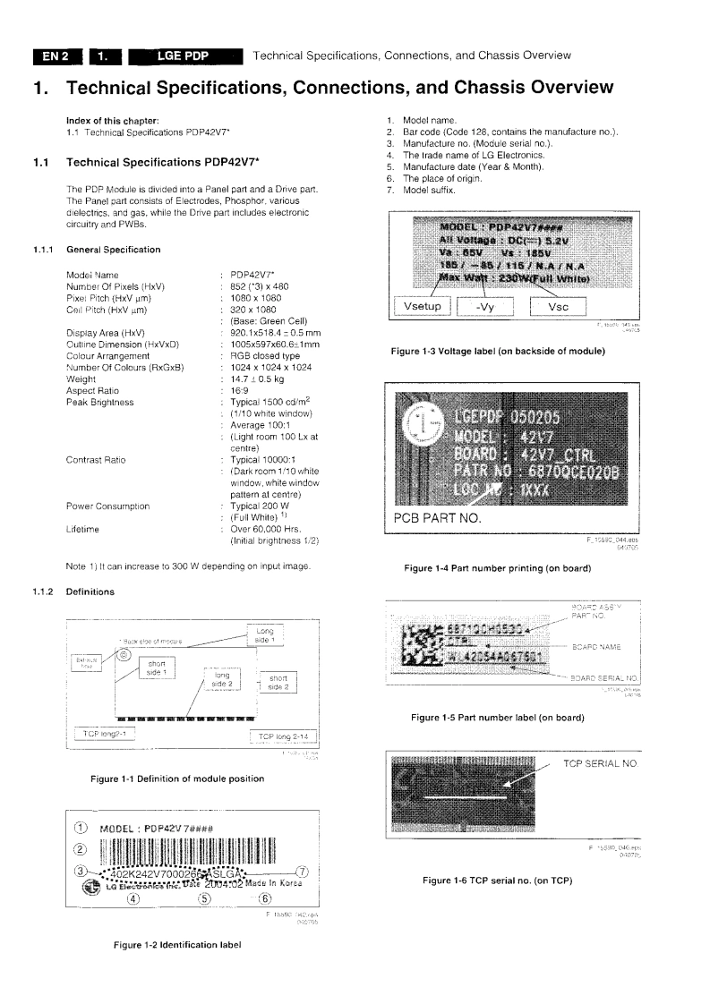 Colour televisionModuleLGE PDP Repair ManualServicePDP42V7****ServiceServiceService ManualContentsPage1.Technica!Specifications,Connections,and Chassis Overview22.Safety Instructions,Warnings,and Notes53.Directions for Use4.Mechanical Instructions5.Service Modes,Error Codes,and Fault Finding5686Block Diagrams,Test Point Overviews,and Waveforms7.Circuit Diagrams and PWB Layouts8.Alignments9.Circuit Descriptions,Abbreviation List,and IC Data Sheets10.Spare Parts List11.Revision ListCopyright25 Philps onsumer Elecronics B.V.Eindhoven,The Netherlands.All rights reserved.No part of this publication'may be reproduced.stored in aretrieval system or transmitted,in any form or by any means,electronic,mechanical,photocopying.or otherwise without the prior permission of Phillps.Published by MW 0567 TV ServiceSubject to modfication E 3122 78515590PHILIPS