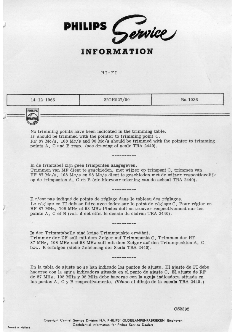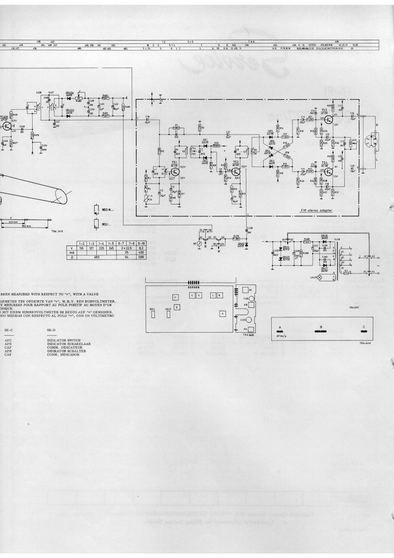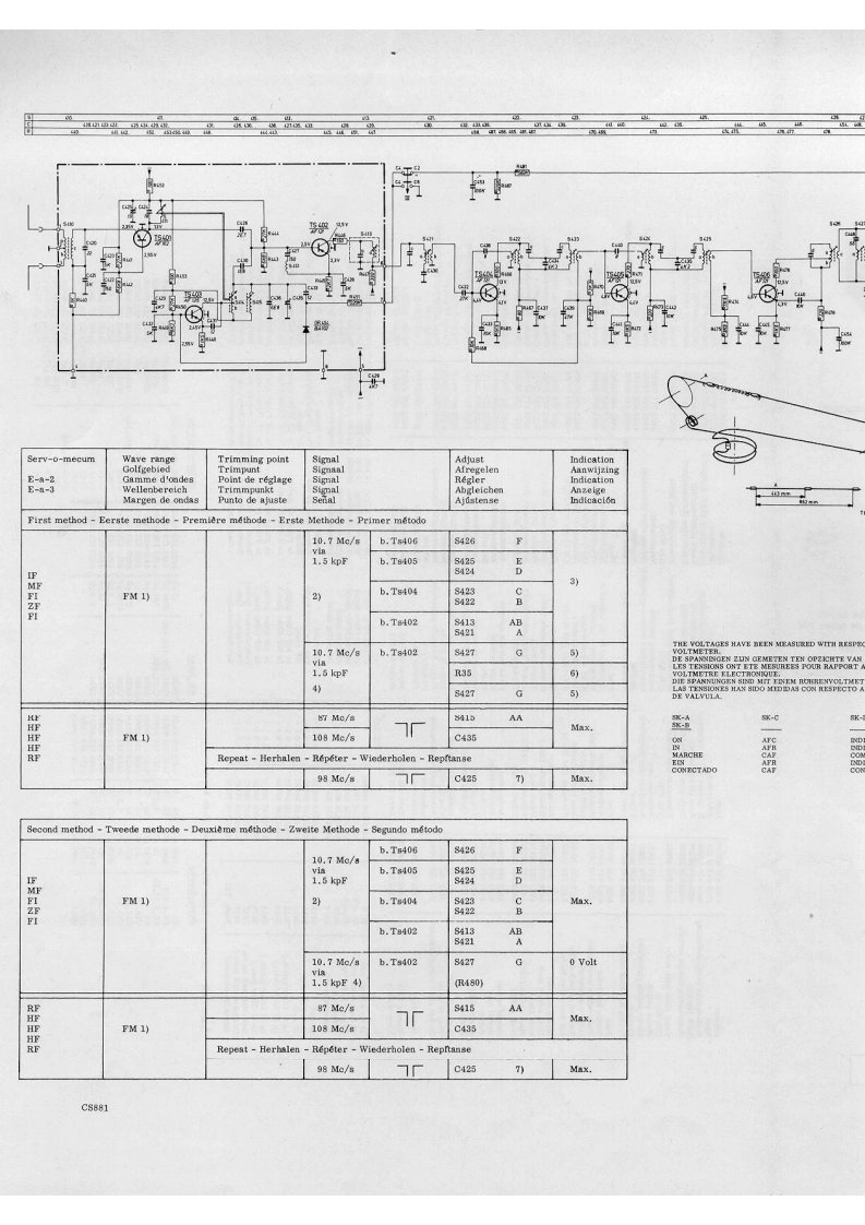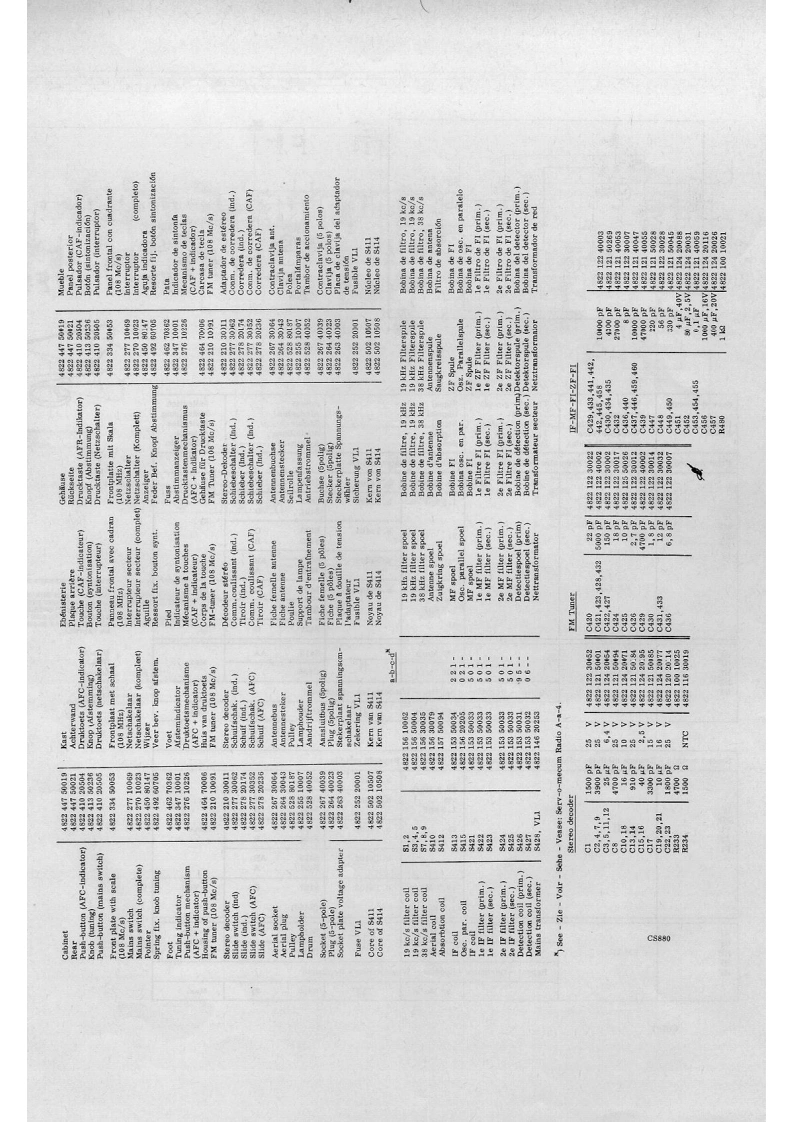 PHILIPSadmin30g202010.30035943+0100HI-FI22GH927/o0FM-TUNER42PHILIPSMains switchTuning-/Stereo indicatorNetschakelaarAfstem-/Stereo indicatorSK-AInterrupteur secteurMIndicateur de syntonisation /stereoSK-BNetzschalterIndicator switchAbstimm-/Stereo IndikatorInterruptor de redIndicator schakelaarIndicador de sintonfa/stereoSK-DComm.indicateurA.F.C.switchIndikator SchalterTuningA.F.C.schakelaarConm.indicadorAfstemmingSK-CCommutateur de C.A.F.S411SyntonisntionA.F.R.SchalterS414AbstimmungConmutador de C.A.FSintonlaMains voltages110-127-220-245VNetspanningenTensions号ecteu'Netzspannungen110-127-220-245 V Tensiones de redWave range FM87.5..108Mc/sGolfgebied FMGamme d'ondes FMWellenbereich UKW 87.5...108 Me/aMargen de ondas FM10.7Me/gF.ILF10.7Mc/s1。F,f.1Z.F.DimensionesDimensions355x79+10x155mmAlmetingenDimensionsAbmessungen355x79+10x155mmConsumption45 mAVerbruikConsommationVerbrauch45 mAConsumoTransistors-DiodesTs1,2,3,4-AC126Ts404,405,406-AF121GR413-AA119TS401-AF102GR1,2,3,4,5,6-AA119GH414BZY61TS402-AF121GR404-BA102GR415BZY59Ts403-AF125GR412a-b2xAA119GR416,417-BA100C8879SERVICEINFORMATIONHFD/FKCopyright Central Service N.V.PHILIPS'GLOEILAMPENFABRIEKEN,Eindhoven4822725.10014Confidential information for Philips Service DealersPrinted in Hollend