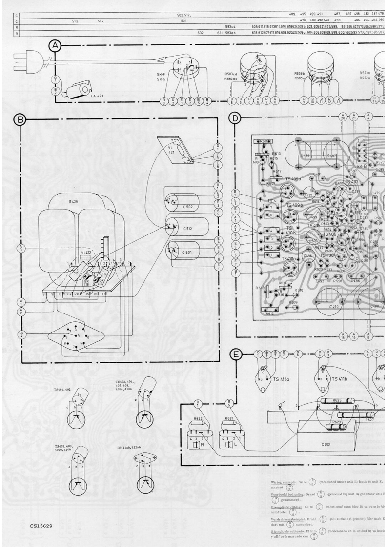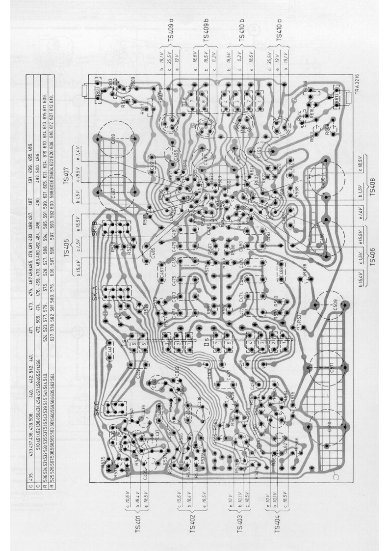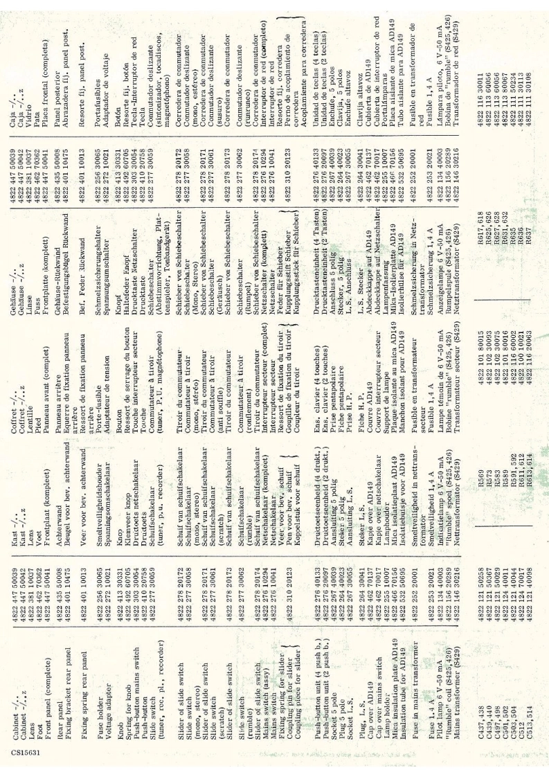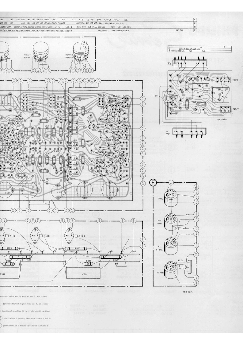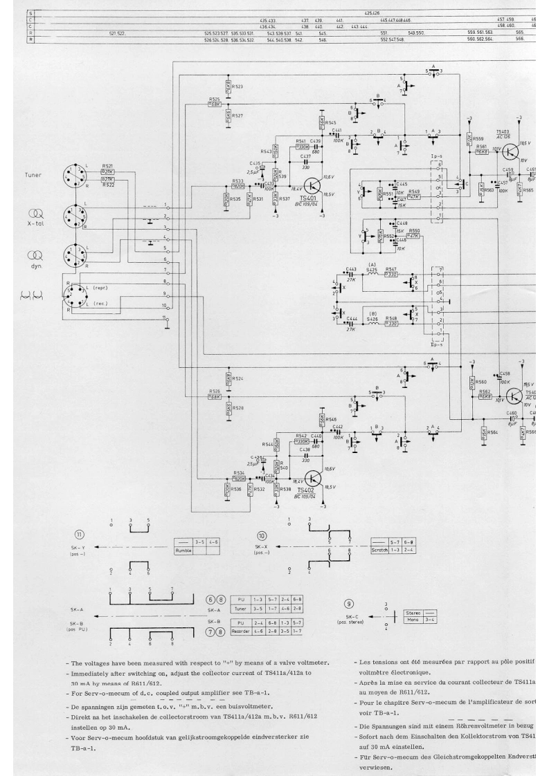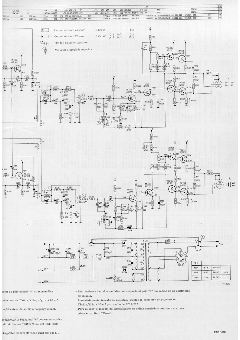 PHILIPSSTEREO AMPLIFIER22GH943/00/00Z/16/16Z/22122Z⊙OO0OO0OPHILIPSMains switchTreble controlMono/stereo switchNetschakelaarSK-FHogetonenregelaarMono/stereo-schakelaarInterrupteur secteurSK-GCommande des aiguesR589Commutateur mono/stereoSK-CNetzschalterHoheneinstellerMono/Stereo-SchalterInterruptor de red.Regulador de tonos agudosConmutador mono/estereoBalance controlTuner switchScratch filter switchBalans regelaarTuner schakelaarScratch filter schakelaarSK-XSK-A②Commande d'equilibreR569Commande de syntonisationCommutateur de filtre anti souffleSymmetrieeinstellerAbstimmschalterRegulador de equilibrioCommutador de sintonizadorConmutador de filtro de crujidosBass controlRecorder switchRumble filter switchLagetonenregelaarRecorder schakelaarSK-BRumble filter schakelaarSK-Y③Commande des bassesR573Commande de magnetophoneCommutateur du filtre de ronflementBasseinstellerTonbandgerateschalterRumpelfilterschalterRegulador de tonos gravesCommutador de magnetofonoConmutador de filtro de "rumble"Volume controlRecord player switchMains indicatorVolumeregelaarP.U.-schakelaarNetindikatorCommande de volumeR583Commande P.U.Indicateur secteurLA423LautstirkeeinstellerPlattenspielersschalterNetzindikatorRegulador de volumenConmutador de tocadiscosIndicador de red.Mains voltages1110-127-220-240VwNetspanningenTensions secteurNetzspannungen1110-127-220-240 VITensiones de redOutput impedance4,82UitgangimpedantieImpedance de sortieAusgangsimpedanz42,82Impedancia de salidaOutput powerPower consumption00≤2%mUitgangsvermogenPuissance de sortie AusgangsleistungPotencia de salidaVerbruikConsommationVerbrauch2wd≤2%8网7-35WConsumoDimensions340x140x210mmAfmetingenDimensionsAbmessungen340x140x210mmDimensionesFrequency range20-20.000HzFrekwentiebereikGamme deFrequenzbereich20-20.000HzMargen defrequencefrecuenciaSensitivity forGevoeligheid voorSensibilite pourEmpfindlichkeitSensibilidad para7 W per channel:7 W per kanaal:7 W par canal:fur 7 W je Kanal7 W por canal:M.D.Rec.player1mV-47k2M.D.P.U.P.U,-M,D.M.D.Plattenspieler1 mV-47 kRFonocaptor magnetocCristal Ree.player40mV-220kKristal P.U.P.U.A cristalKristal-Platten40mV-220kFonocaptor de cristaTuner40mV-30k2TunerTuner40mV-30kSintonizadortungTape recorder110mV-70kgMagnetofoonMagnetophone110mV-70kMagnetofonoTransistors-DiodesTS401,402-BC109/04TS407,408-AC125TS411ab-2-AD149T8403,404-AC126S409b-AC127-132/81TS412ab-2-AD149TS405,406-AC172TS410ab-AC127-132/81GR417,418-BY114CS15628SERVICEINFORMATIONHFD/Copyright Central Service N.V.PHILIPS'GLOEILAMPENFABRIEKEN,Eindhoven48227251,0251Confidential information for Philips Service DealersPrinted in Holland