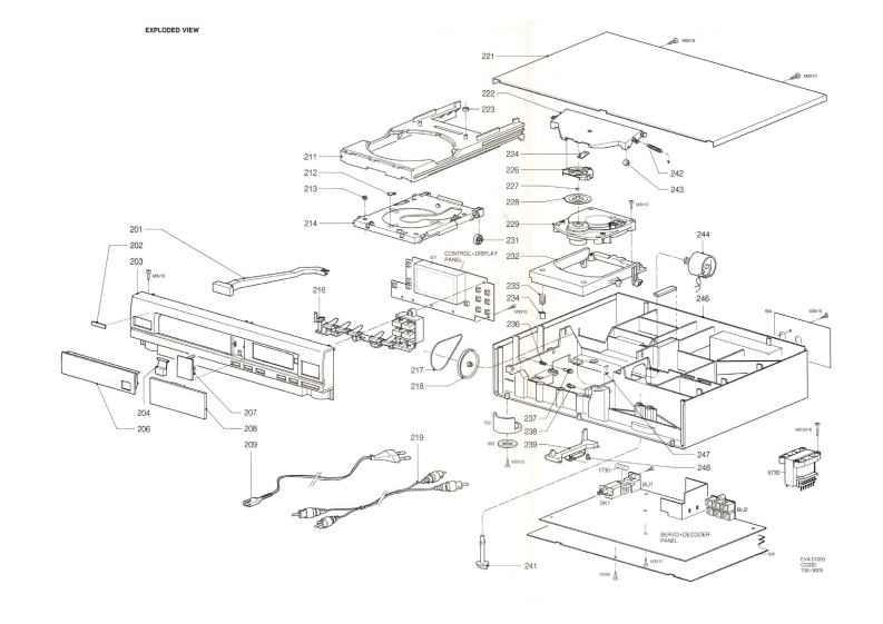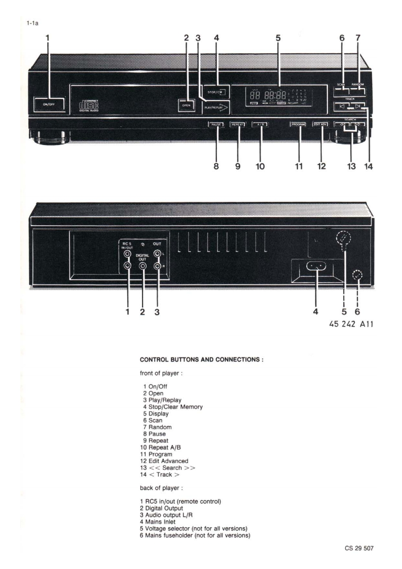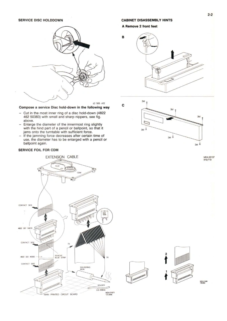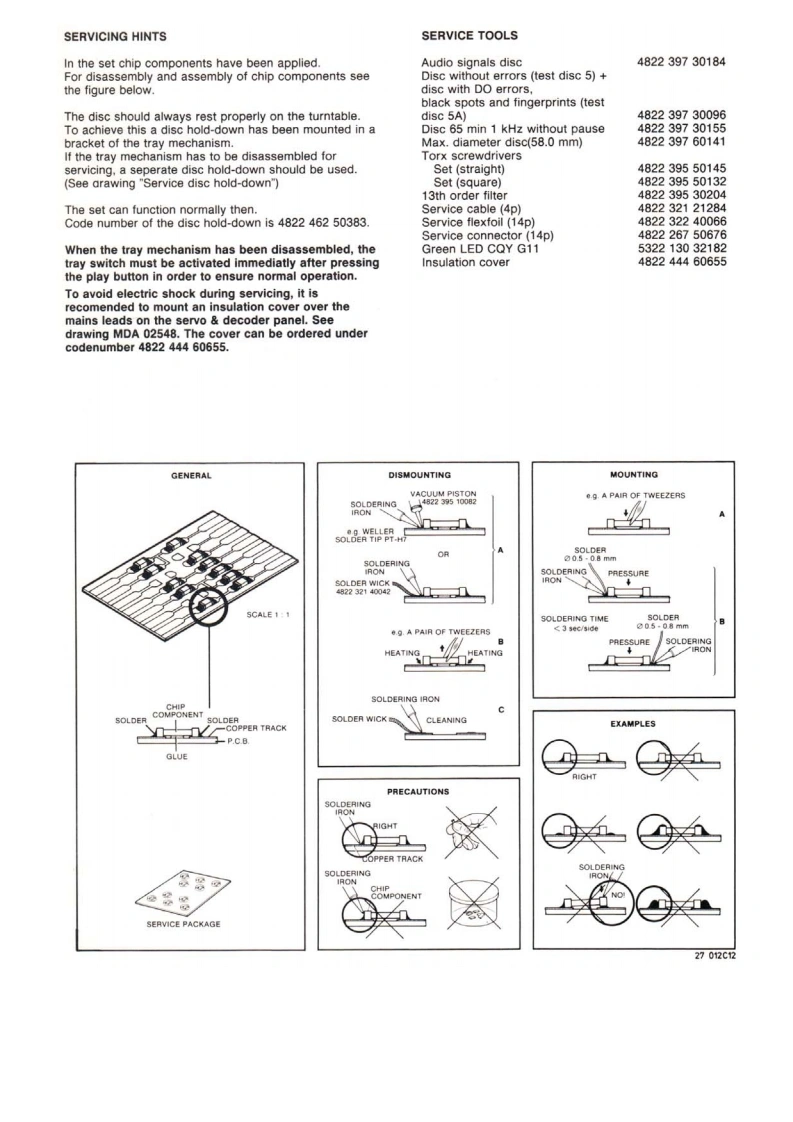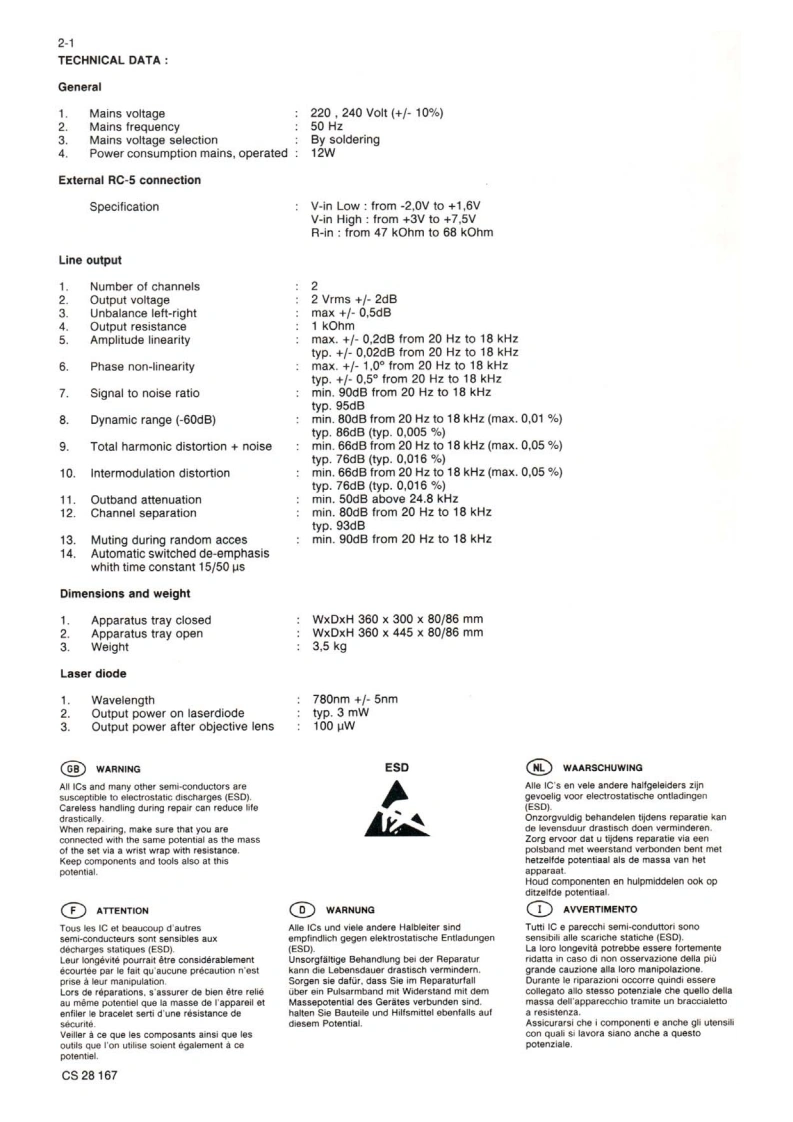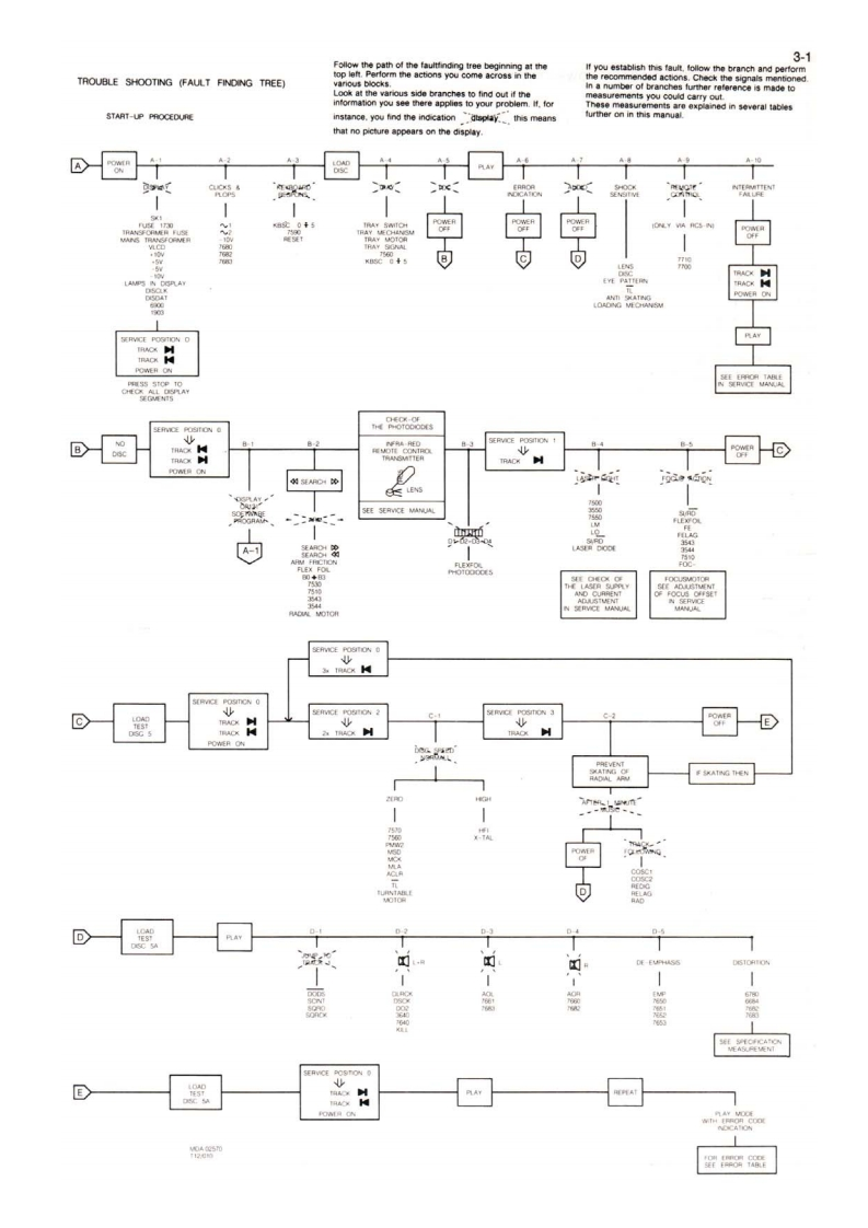Compact disc player CD230Service00B/05B/10G/40B/45BServiceService45261A1Service ManualCONTENTSds时DIGITAL AUDIO1 Control buttons and connections2 Technical data Servicing hints and toolsDisassembly hints,Exploded view.Mechanical partslist3 Faultfinding procedure.Error codes.Block diagramMain panel info4 Display panel info,Wiring diagram5 Partslist6 ModificationsGB0Safety regulations require that the set be restored to its originalBei jeder Reparatur sind die geltenden Sicherheitsvorschriften zucondition and that parts which are identical with those specified bebeachten.Der Originalzustand des Gerats dart nicht verandert werdenused.fur Reparaturen sind Original-Ersatzteile zu verwenden.m1Veiligheidsbepalingen vereisen,dat het apparaat in zijn oorspronkelijkeLe norme di sicurezza esigono che 'apparecchio venga rimesso nelletoestand wordt teruggebracht en dat onderdelen.identiek aan decondizioni originali e che siano utilizzati pezzi di ricambiago identici agespecificeerde worden toegepast.quelli specificati.FLes normes de securite exigent que l'appareil soit remis a l'etat d'origineet que soient utilisees les pieces de rechange identiques a cellesSF Varo!Avattaessa ja suojalukitus ohitettaessa olet alttiina nakymattomallelasersateilylle.Ala katso sateeseen.S Varning!Osynlig laserstraining nar denna del ar oppnad och sparren ar urkopplad.CLASS 1LASER PRODUCT性0a40Documentation Technique Service Dokumentation Documentazione di Servizio Huolte-Ohge Manual de Servicio Manual de ServicioSubject to modification482272522667PHILIPSon pannPrinted in The NetherlandsCopvright reserved