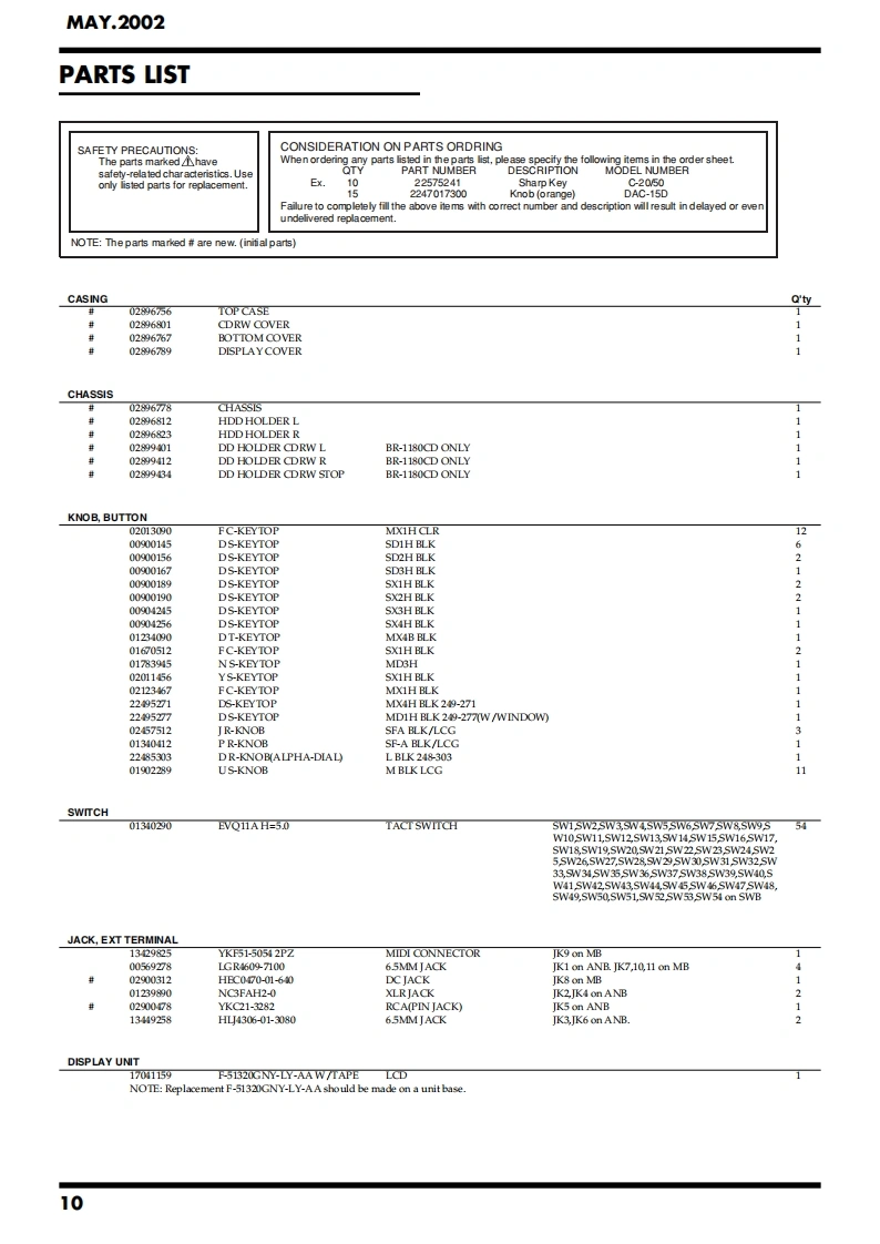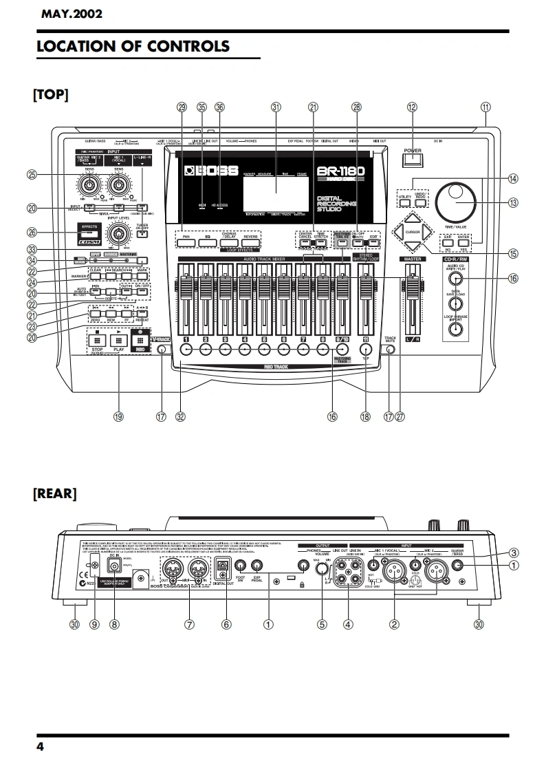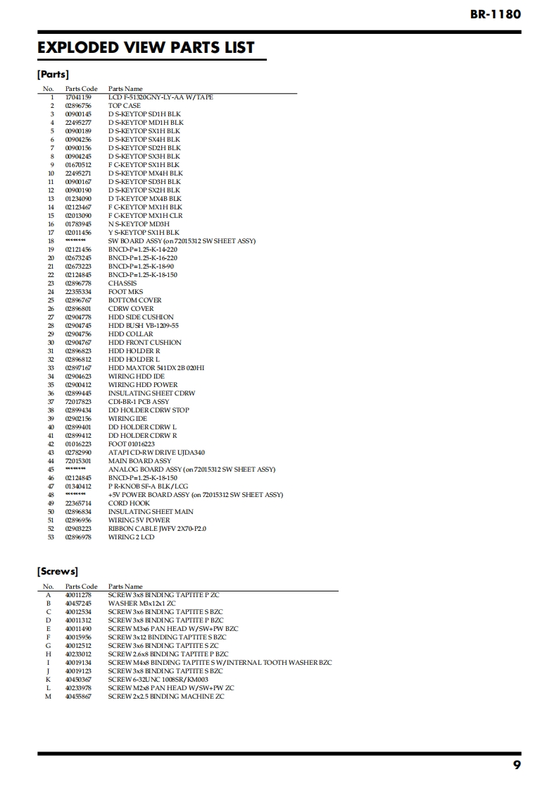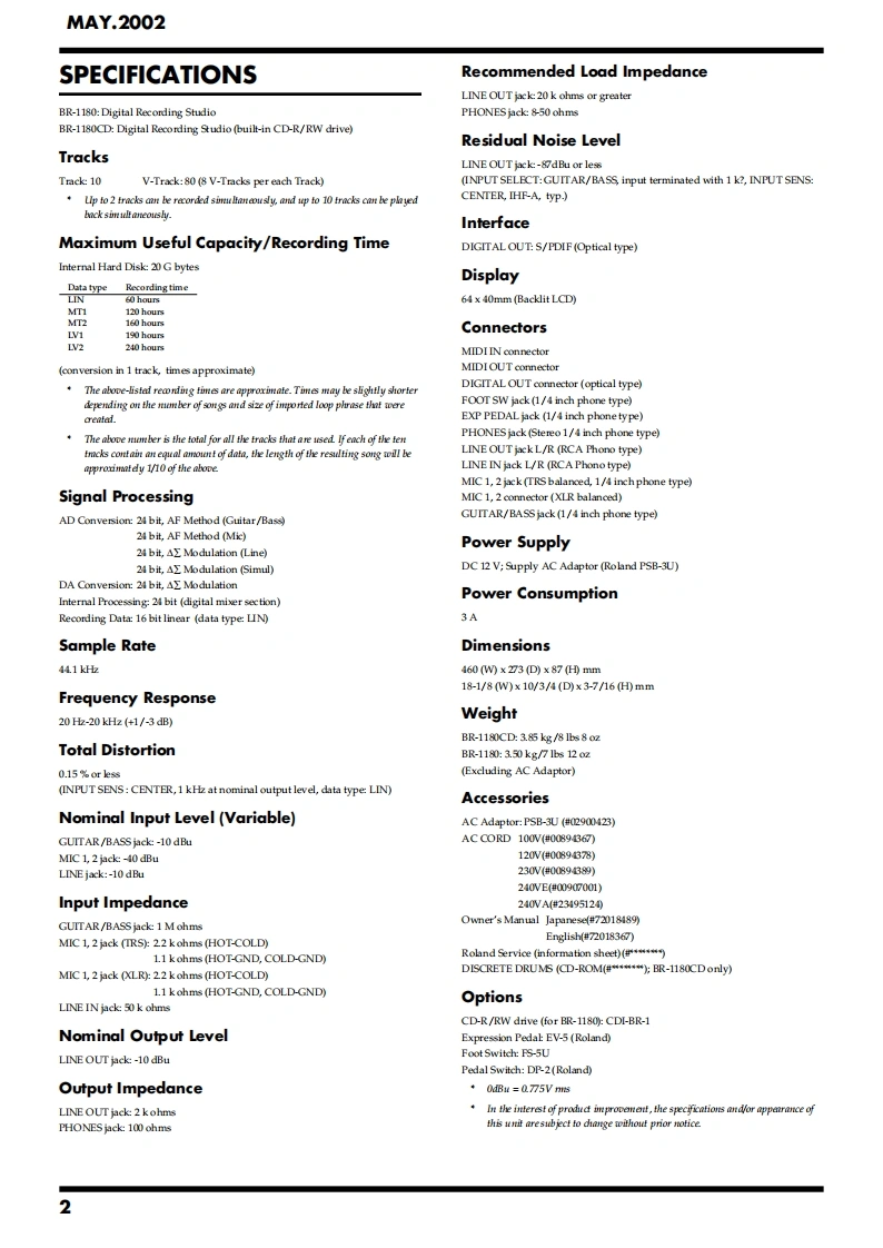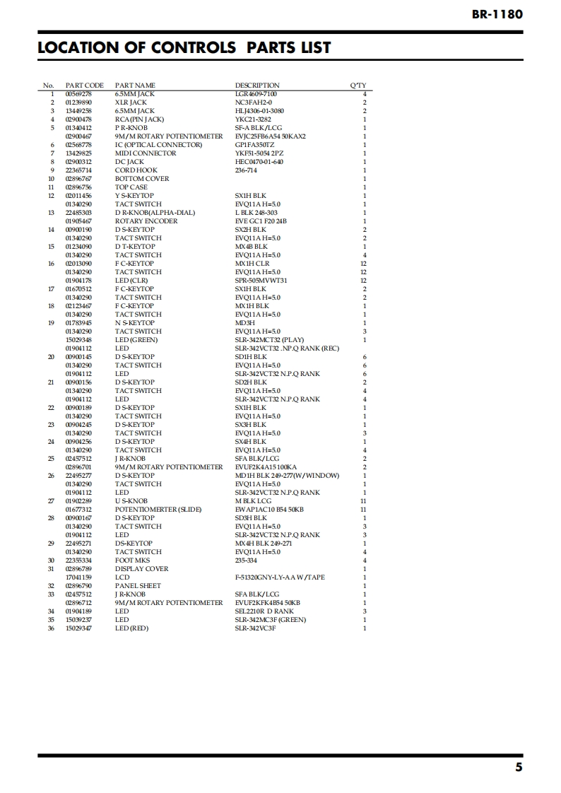 MAY.2002BR-1180BR-1180/BR-1180CDSERVICE NOTESDIGITAL RECORDING STUDIOIssued by RJATABLE OF CONTENTSSPECIFICATIONS.....2CIRCUIT DIAGRAM(MAIN 1/4)......24LOCATION OF CONTROLS...4CIRCUIT DIAGRAM(MAIN 2/4)........6LOCATION OF CONTROLS PARTS LIST..............5.CIRCUITDIAGRAM(MAIN 3/4).........................28EXPLODED VIEW 1.6CIRCUIT DIAGRAM(MAIN 4/4)...........30EXPLODED VIEW 2....7CIRCUIT BOARD(SW SHEET ASSY).32EXPLODED VIEW 3.....8CIRCUIT BOARD(ANALOG)......34EXPLODED VIEW PARTS LIST9CIRCUIT DIAGRAM(+5V BOARD)36PARTS LIST........10CIRCUIT DIAGRAM(SW)...........38CHECKING THE VERSION NUMBER........15ERROR MESSAGES..40USERS DATA SAVE AND LOAD.....................15RESTORING THE FACTORY SETTINGS.....16CD-BR-1...41SYSTEM SOFTWARE UPDATE PROCEDURE ........17SPECIFICATIONS.…41TEST MODE.......17PARTS LIST42BLOCK DIAGRAM....20INSTALLING THE CDI-BR-1.....43CIRCUIT BOARD(MAIN).....22The wiring exchange method...…44回Eog日BR-T8O口旦@晋登哥邑尚白日8。w晋合器岂口学尚点道Copyright 2002 ROLAND CORPORATIONAll rights reserved.No part of this publication may be reproduced in any form without the written permissionof ROLAND CORPORATION.Roland17058069E0Printed in Japan(0800)(NB)
