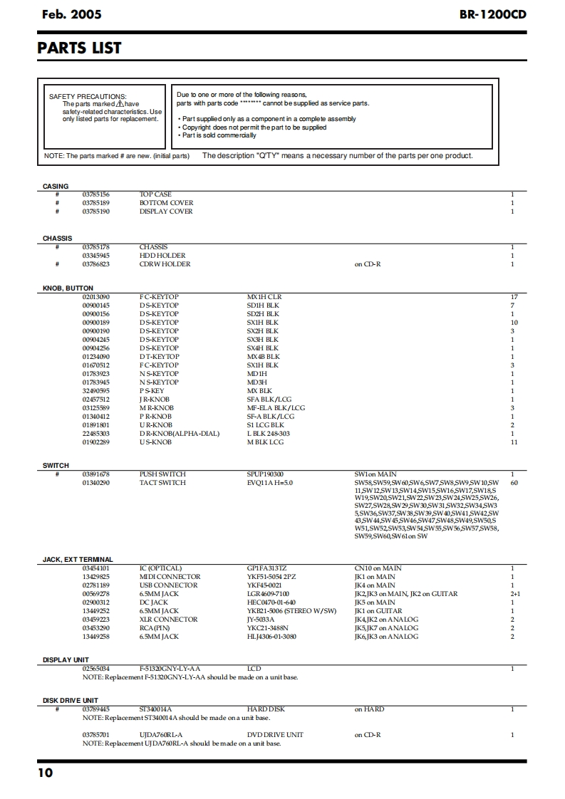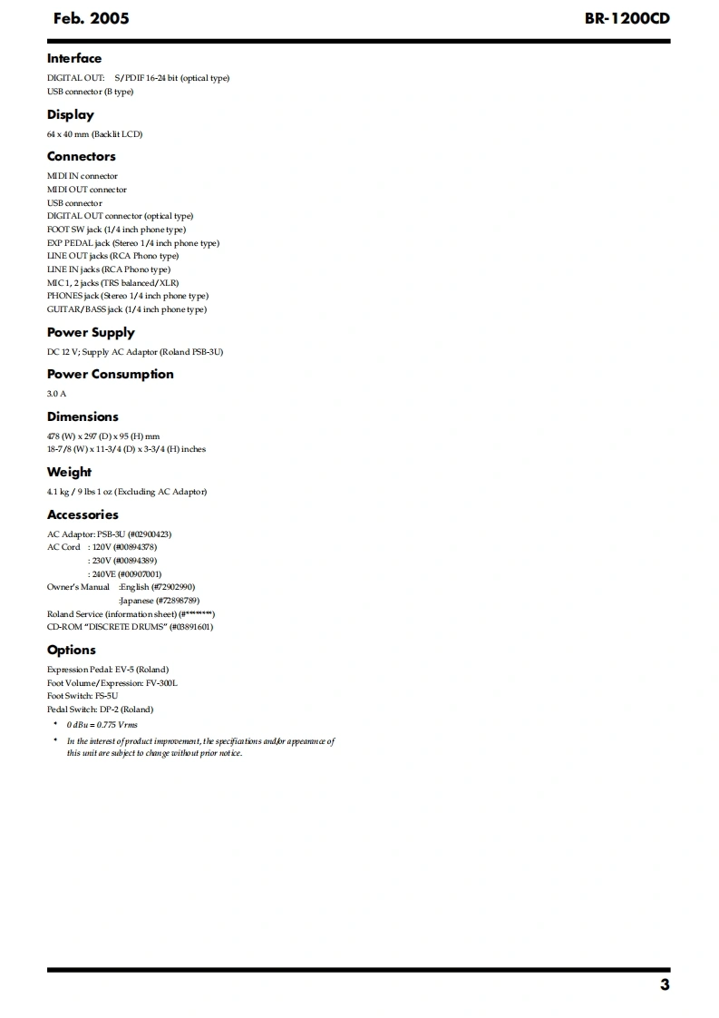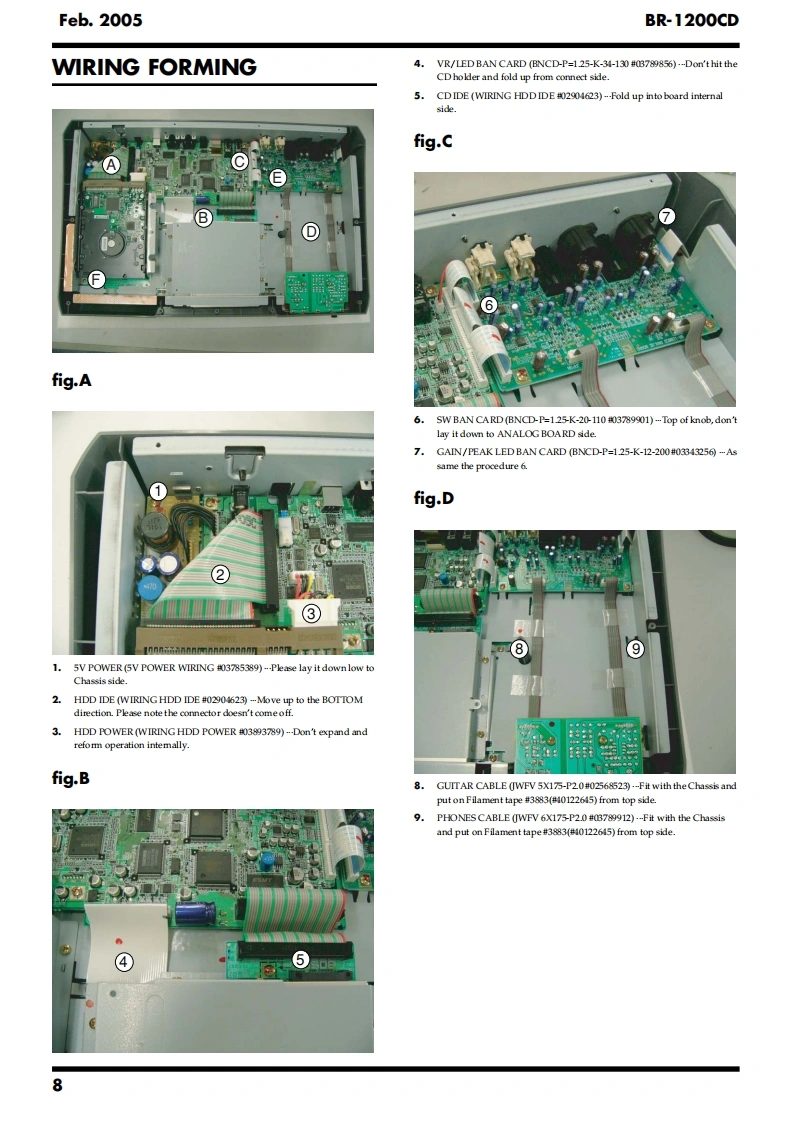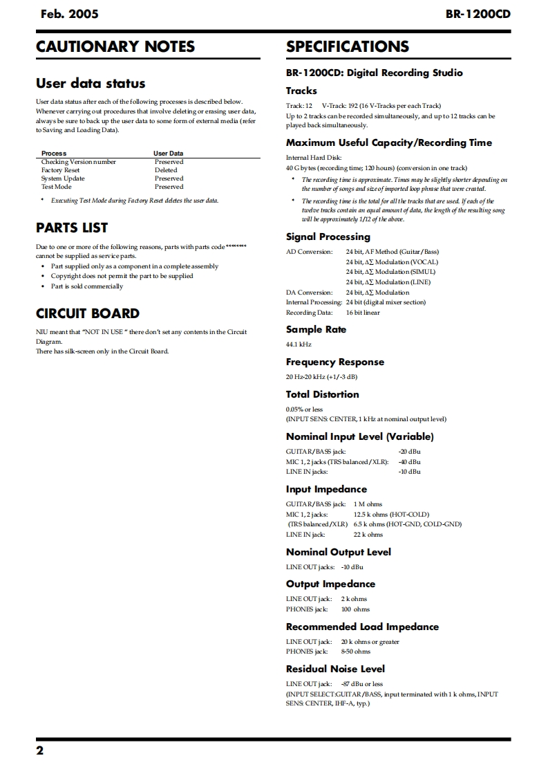 Feb.2005BR-1200CDBR-1200CDSERVICE NOTESIssued by RJAPIGITAL RECORING STUPIOTABLE OF CONTENTSCAUTIONARY NOTES2CIRCUIT DIAGRAM(MAIN BOARD ANALOG)....30SPECIFICATIONS...2CIRCUIT DIAGRAM(MAIN BOARD PHANTOM)....30LOCATION OF CONTROLS4CIRCUIT DIAGRAM(MAIN BOARD CPU).............32LOCATION OF CONTROLS PARTS LIST.......5CIRCUIT DIAGRAM(MAIN BOARD DSP).............34EXPLODED VIEW.....6CIRCUIT DIAGRAM (MAIN BOARD DIGITAL OUT)...36EXPLODED VIEW PARTS LIST........CIRCUIT DIAGRAM(MAIN BOARD USB)...........36WIRING FORMING.......8CIRCUIT BOARD(ANALOG BOARD).................37PARTS LIST........10CIRCUIT DIAGRAM(ANALOG BOARD).............38CHECKING THE VERSION NUMBER..........15CIRCUIT BOARD(SW SHEET).....40USERS DATA SAVE AND LOAD...............15CIRCUIT DIAGRAM(SW SHEETSW BOARD)........42TEST MODE.......17CIRCUIT DIAGRAM (SW SHEET,GUITAR INPUT BOARD)....44INITIALIZING ALL BR-1200CD SETTINGS (INITIALIZE)....20CIRCUIT DIAGRAM(SW SHEET,+5V POWER BOARD)...45SYSTEM SOFTWARE UPDATING INSTRUCTIONS....23CIRCUIT BOARD (CD CN BOARD)........46BLOCK DIAGRAM24CIRCUIT DIAGRAM (CD CN BOAR)..................46CIRCUIT BOARD (MAIN BOARD)....26ERROR MESSAGES】…47CIRCUIT DIAGRAM(MAIN BOARD POWER).......28间E▣66al0月R-1200当Copyright 2005 ROLAND CORPORATIONAll rights reserved.No part of this publication may be reproduced in any form without the written permissionof ROLAND CORPORATION.Roland17058313E0Printed in Japan(0500)(NB)