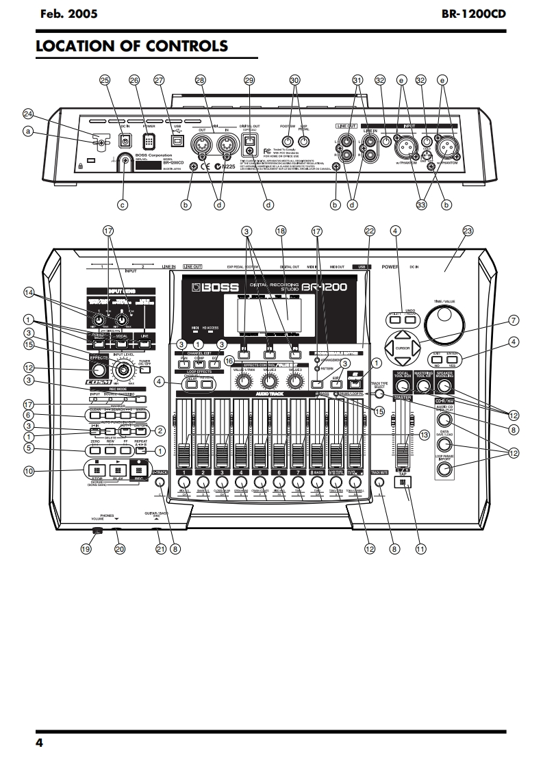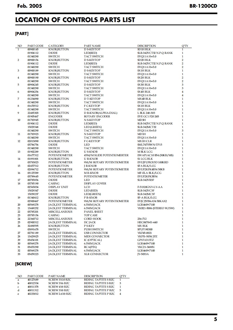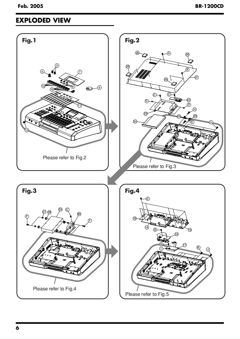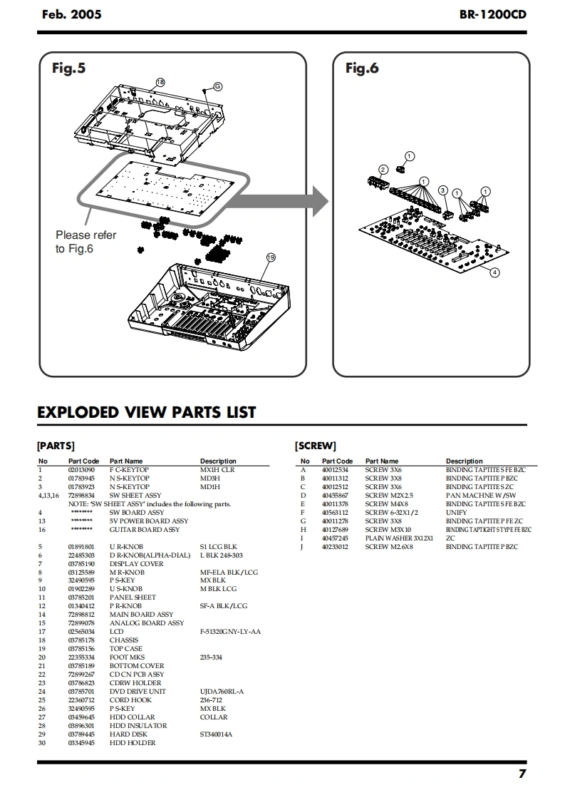 Feb.2005BR-1200CDBR-1200CDSERVICE NOTESIssued by RJAPIGITAL RECORING STUPIOTABLE OF CONTENTSCAUTIONARY NOTES2CIRCUIT DIAGRAM(MAIN BOARD ANALOG)....30SPECIFICATIONS...2CIRCUIT DIAGRAM(MAIN BOARD PHANTOM)....30LOCATION OF CONTROLS4CIRCUIT DIAGRAM(MAIN BOARD CPU).............32LOCATION OF CONTROLS PARTS LIST.......5CIRCUIT DIAGRAM(MAIN BOARD DSP).............34EXPLODED VIEW.....6CIRCUIT DIAGRAM (MAIN BOARD DIGITAL OUT)...36EXPLODED VIEW PARTS LIST........CIRCUIT DIAGRAM(MAIN BOARD USB)...........36WIRING FORMING.......8CIRCUIT BOARD(ANALOG BOARD).................37PARTS LIST........10CIRCUIT DIAGRAM(ANALOG BOARD).............38CHECKING THE VERSION NUMBER..........15CIRCUIT BOARD(SW SHEET).....40USERS DATA SAVE AND LOAD...............15CIRCUIT DIAGRAM(SW SHEETSW BOARD)........42TEST MODE.......17CIRCUIT DIAGRAM (SW SHEET,GUITAR INPUT BOARD)....44INITIALIZING ALL BR-1200CD SETTINGS (INITIALIZE)....20CIRCUIT DIAGRAM(SW SHEET,+5V POWER BOARD)...45SYSTEM SOFTWARE UPDATING INSTRUCTIONS....23CIRCUIT BOARD (CD CN BOARD)........46BLOCK DIAGRAM24CIRCUIT DIAGRAM (CD CN BOAR)..................46CIRCUIT BOARD (MAIN BOARD)....26ERROR MESSAGES】…47CIRCUIT DIAGRAM(MAIN BOARD POWER).......28间E▣66al0月R-1200当Copyright 2005 ROLAND CORPORATIONAll rights reserved.No part of this publication may be reproduced in any form without the written permissionof ROLAND CORPORATION.Roland17058313E0Printed in Japan(0500)(NB)
