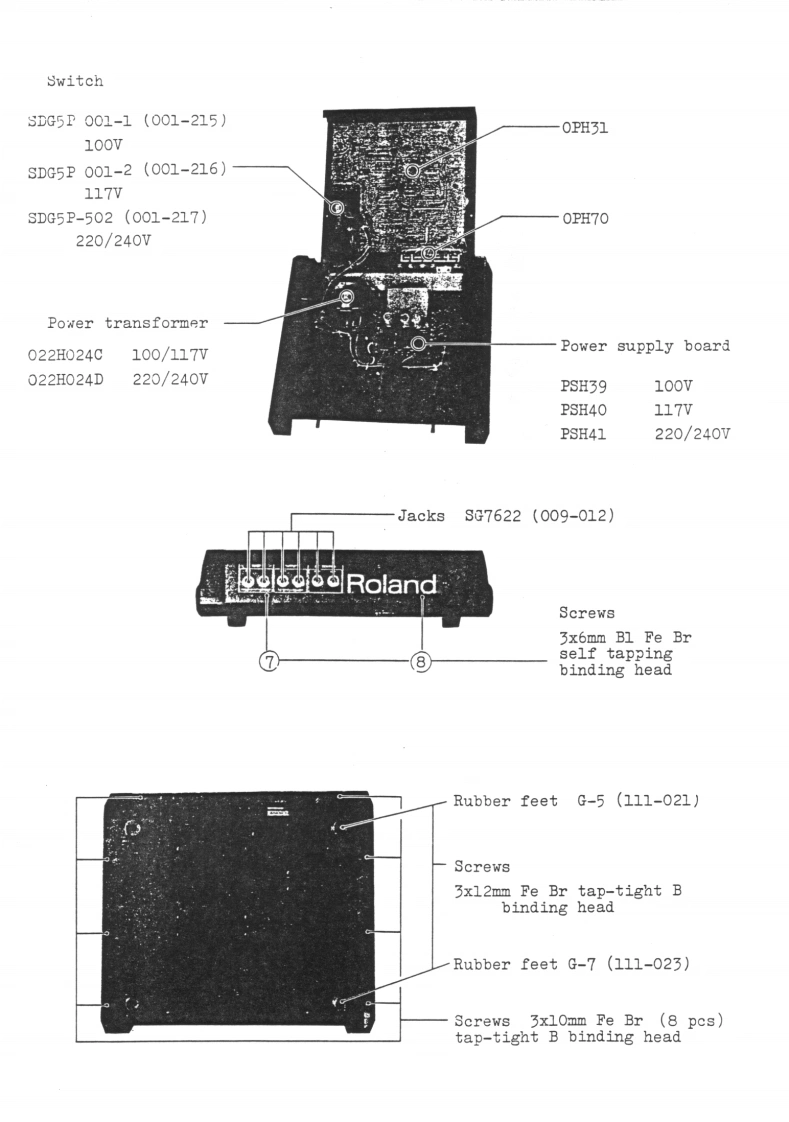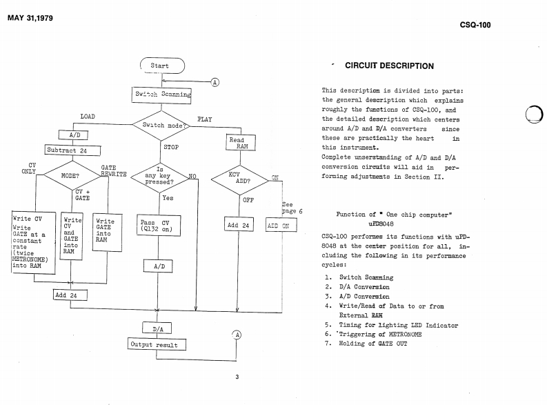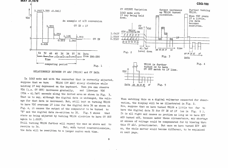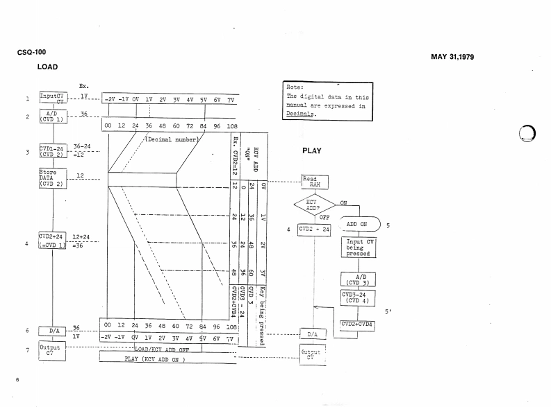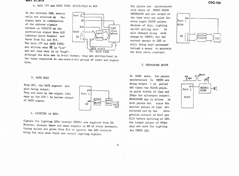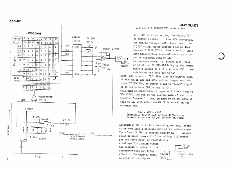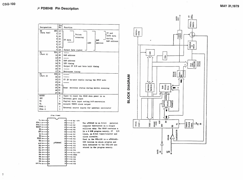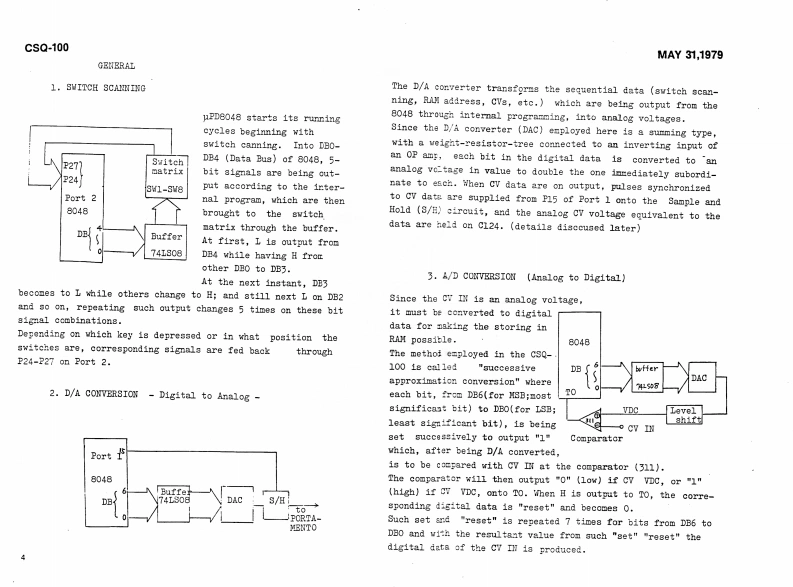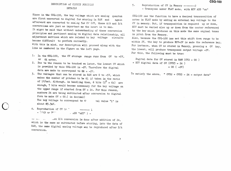 MAY31,1979CSQ-100CSQ-100 SERVICE NOTESMemory capacity ---Up to 168 notes (84 notes/channel)2 channelsCV output ----------1V/oct:-2V to +8VCV input1V/oct:OV to +5VGate output -------Off:OV0m:+15VGate input -------Off:OVOn:+15V (threshold +2.5V)EXT Start input ----With switch:normally close,open to startor pulse:+15VEXP Step input -----+15V pulsePower consumptions--8 wattsDimensions --------345Wx305Dx95Hnm(13.6x12.0x3.7in)Weight2.7kg(5.941bs)PANEL REMOVAL SCREWS:(1through88on the rear)Switches SLE-622-18PS (001-265Pane1H49(072H049)Rubber bushings no.20Swithes SLE-623-18P(069-020)(001-201)1Side blocks (R L setButton no.8 (016-008)H21(056H021)Scraws3x20mmtruss Br②Screws①②③43x10mmFe BrScrews 3x6mm FeBrTap-tight binding he(11p1aces】Pot.Knob ne0.57(016-057)EVHLWAD25B15Pot.(030-951M10RK20B16(020-769SwitchSSB023-12PN⑤Knob no.33(016-0336Pot.(001-183)EVAL0PC15A26(029-57SwitchesSwitches w/button SCK41168(001-275)Screws⑤⑤3x6mm Fe Br bindindw/buttonspecify legend for replacementSCK41167order(001-276)FclandPrinted in JapanA3