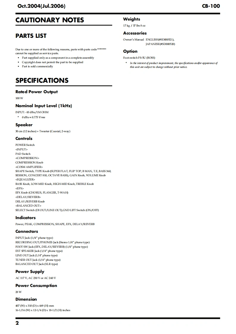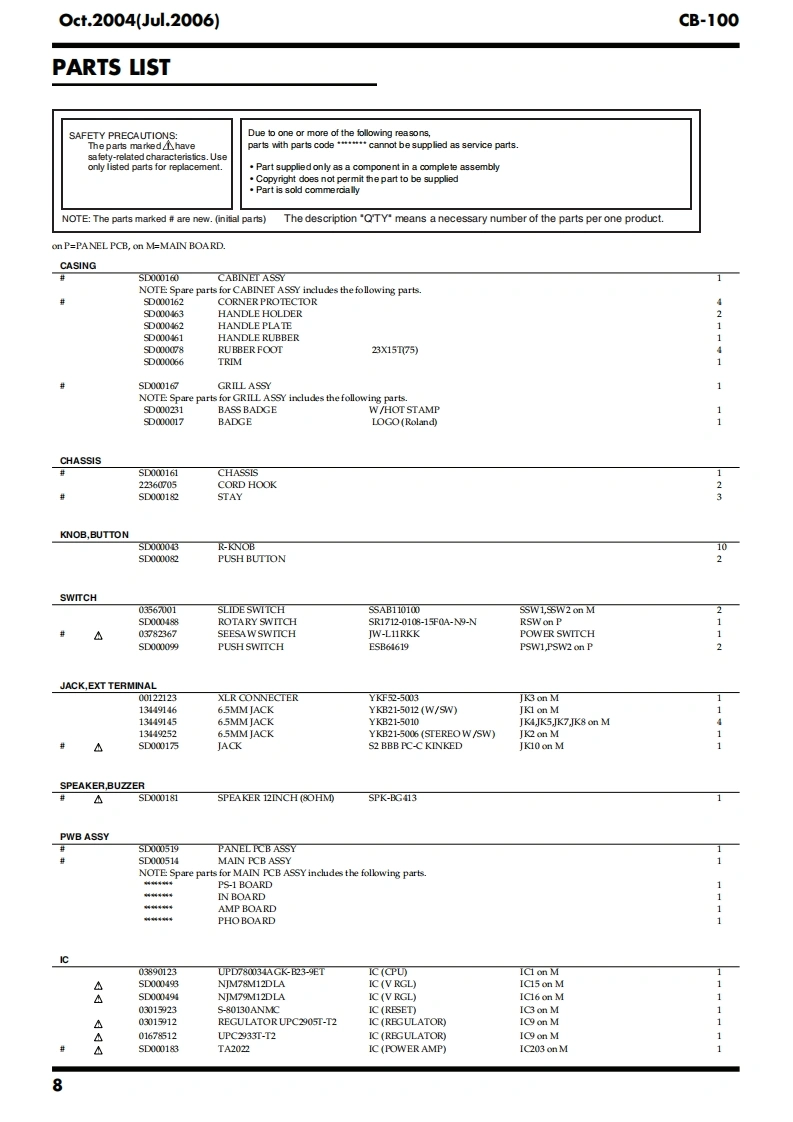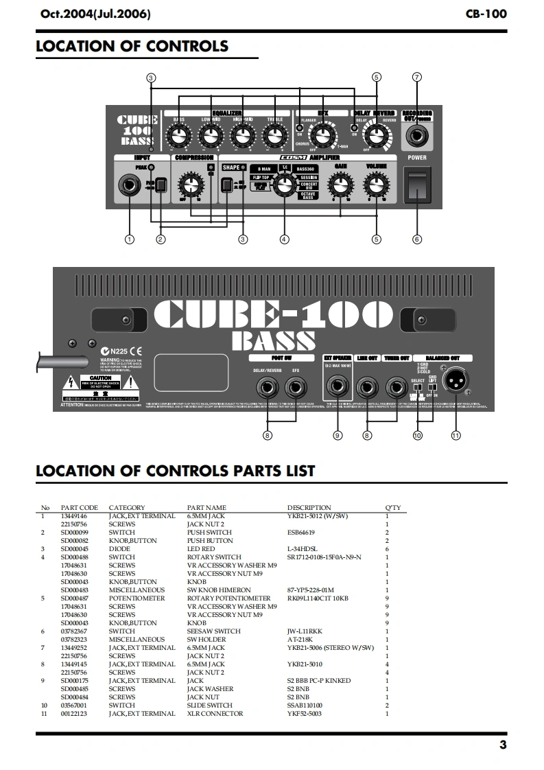 。ct.2004(Jul.2006)CB-100CUBE-100SERVICE NOTESBASSIssued by RJATABLE OF CONTENTSCAUTIONARY NOTES2SPECIFICATIONS..LOCATION OF CONTROLS...........3LOCATION OF CONTROLS PARTS LIST.3EXPLODED VIEW(CABINET)...EXPLODED VIEW PARTS LIST (CABINET)..............5.EXPLODED VIEW (CHASSIS)............“.6EXPLODED VIEW PARTS LIST (CHASSIS).......PARTS LIST.8CHECKING THE VERSION NUMBER....................12Revise InformationTESTMODE.12BLOCK DIAGRAM....…142006/7/25CIRCUIT BOARD (MAIN BOARD 1)..............16Revised a few miscopies in EXPLODED VIEW PARTS LISTCIRCUIT BOARD (MAIN BOARD 2)...................17(CABINET)(p.5)CIRCUIT BOARD(PANEL BOARD).........182006/12/01CIRCUIT DIAGRAM(MAIN 1 IN PHO)............20Revised a few miscopies in EXPLODED VIEW PARTS LISTCIRCUIT DIAGRAM(MAIN 2 PANEL)...............22(CABINET)(p.5)and PARTS LIST (p.11).CIRCUIT DIAGRAM(AMP).......24CIRCUIT DIAGRAM(MAIN 3 PS1)....26Copyright 2004 ROLAND CORPORATIONAll rights reserved.No part of this publication may be reproduced in any form without the written permissionof ROLAND CORPORATION.Roland17058300E0Printed in Japan(0500)(AS)