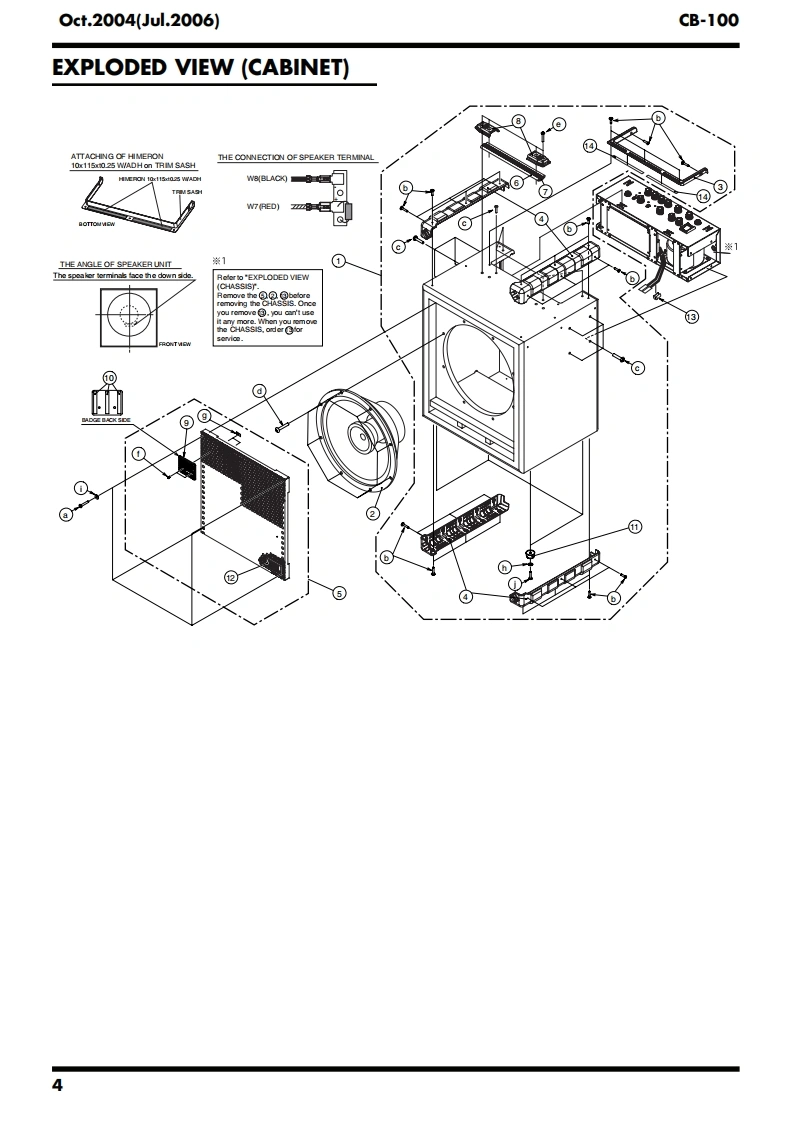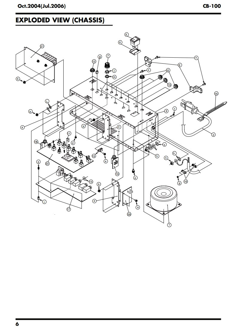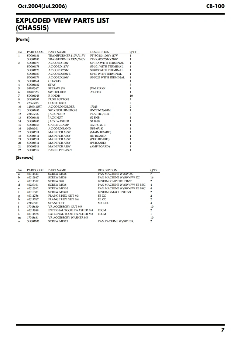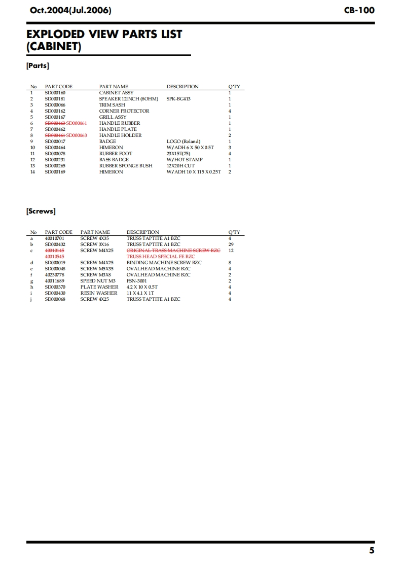 。ct.2004(Jul.2006)CB-100CUBE-100SERVICE NOTESBASSIssued by RJATABLE OF CONTENTSCAUTIONARY NOTES2SPECIFICATIONS..LOCATION OF CONTROLS...........3LOCATION OF CONTROLS PARTS LIST.3EXPLODED VIEW(CABINET)...EXPLODED VIEW PARTS LIST (CABINET)..............5.EXPLODED VIEW (CHASSIS)............“.6EXPLODED VIEW PARTS LIST (CHASSIS).......PARTS LIST.8CHECKING THE VERSION NUMBER....................12Revise InformationTESTMODE.12BLOCK DIAGRAM....…142006/7/25CIRCUIT BOARD (MAIN BOARD 1)..............16Revised a few miscopies in EXPLODED VIEW PARTS LISTCIRCUIT BOARD (MAIN BOARD 2)...................17(CABINET)(p.5)CIRCUIT BOARD(PANEL BOARD).........182006/12/01CIRCUIT DIAGRAM(MAIN 1 IN PHO)............20Revised a few miscopies in EXPLODED VIEW PARTS LISTCIRCUIT DIAGRAM(MAIN 2 PANEL)...............22(CABINET)(p.5)and PARTS LIST (p.11).CIRCUIT DIAGRAM(AMP).......24CIRCUIT DIAGRAM(MAIN 3 PS1)....26Copyright 2004 ROLAND CORPORATIONAll rights reserved.No part of this publication may be reproduced in any form without the written permissionof ROLAND CORPORATION.Roland17058300E0Printed in Japan(0500)(AS)