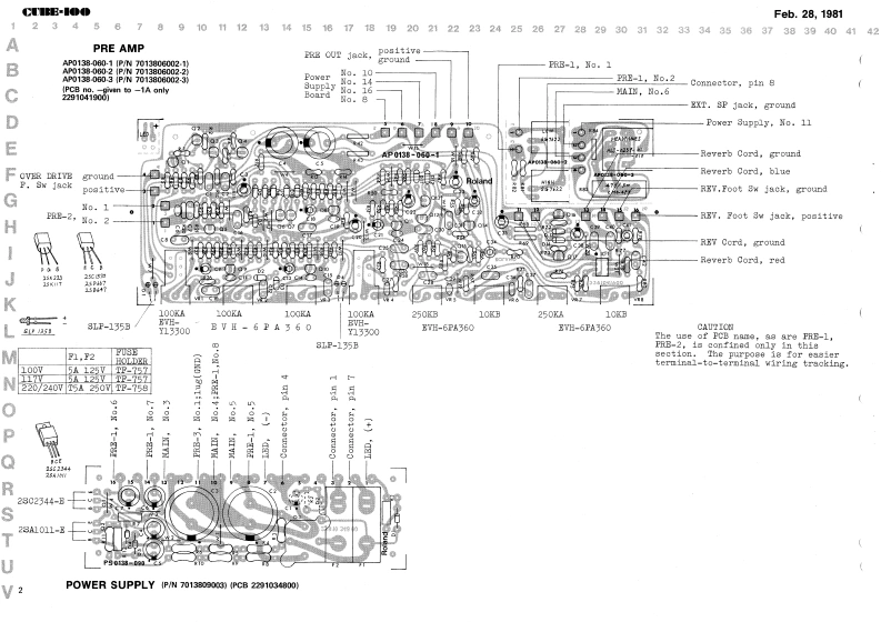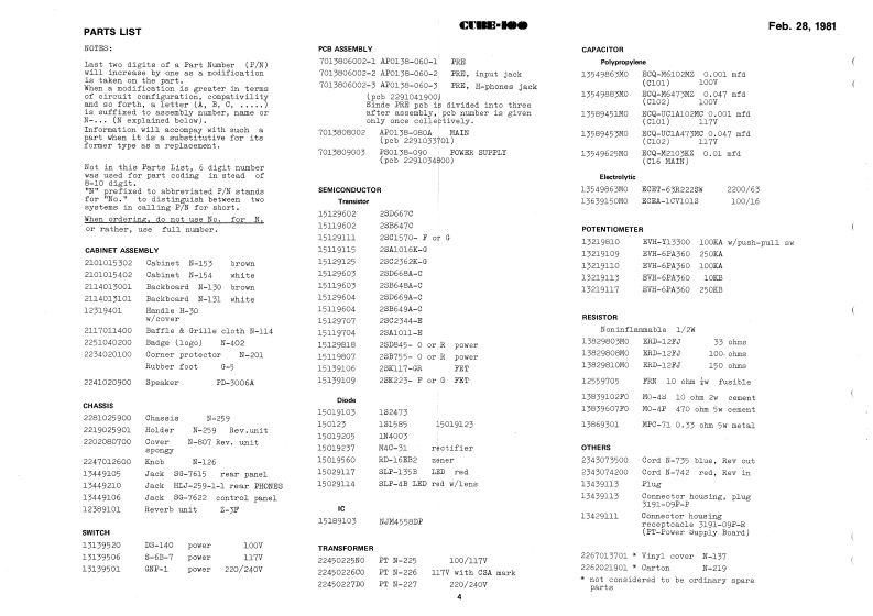 Feb.28,1981CE-MD作SERVICE NOTESSPECIPICATICNSCORRKOTICMALMnekle (halftone niaregistratfon)Output Power100l roainto 8 ohm 1cad8peakerx LPower Con▣otion==m==e■■2457296(x465(H)x264(D)n20江6pretixed to abbreviatedMAIN AMP AP0138-080APN7013808002PcB2291033701IPart Humnber atanda for "No."to distinguiah it from oldBadge N-402Hnnd1a且-30.w/covera6 digit P/N not being uned,2251040200】(12319401)in thia Motes.Knob M-1268G-7622(224701260081P=4B[13449106】1125029114》gndpoaitiveP-3,N0,5Cabinet N-153br0wn(2101015302MAIK IN jack-Fower Supply,Ko.9N-154white(2101015402Power SupplyNa.13Rubber Foot G-56.10D-006A8fng0r111801otmN-114(2117011400J(2241020900)Corner Proteetor7-201(2234020100】Jacka30-7615dcrew8(4pe8】4 x 25mn binding(1449105】JackCh88818N-259J259-1-1(2261025900)(1449210Pover SvitchFuae Holdar-130aee Parta Listbrov(2114013001)Serexs trussM-131white4 x 25mn(2 pes](2114013101)4 I 35mn(2 pea]Rolandmn时n Jpan Jul32E21