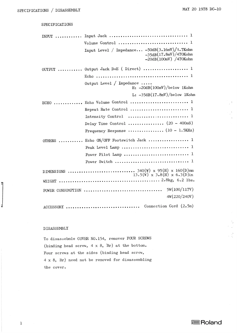 MAY201978DC-10ANALOG ECHODC-1oCON T E NT SSPECIFICATIONS...·····DISASSEMBLY ............................1CIRCUIT DESCR1 PTION,,,,,·,···.········,2-3BL0 CK DIAGHAM·4CIRCUIT DIAGRAM(SERIAL N0.UPT0651699),...,..·....,.···5PCB ET-20A(SERIAL N0.UPT0651699)·.,..··6CIRCUIT DIAGRAM(SERIAL N0.6517O0 AND HIGHER)......·......·.,...·7PCBE-20B(SERIAL NO.692450 AND HIGHE)·...·...........·8-9FCB-20B(SERIAL N0.651700-682499)...........·10ADJUSTMENT..,,。,,。,。11-13PARTS ILLUSTHATED..·.·.,,··.·*…14-15PARTS LIST ......................Roland