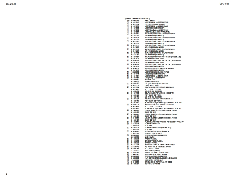hy的D-2000□J-己▣▣▣SERVICE NOTESMAIN SPECIFICATIONSINPUT AND OUTPUT STANDARDSFirst EditionSpecifcdioeaIssued by RJA20Hz-20Hz dBCAIN min)●T@al Harmaie Distoticn05%er kas20Hz te 20Hz ratd euput)SNR山erw80cBngut tor minated wih 15022.IHF-A.Typ)Cresstl-70日er kHz between chamd约TABLE OF CONTENTSPage-0日erleHz betweenL and R)SPECIACATONS/NPUTAND OUPUT STANDARDHOH:t2kHz shdving type)MO:t8日3Hz制gpLOW:t8日0 zshdving typ)HOHw+12日MO5-m+12日IDENTIFYING THE VERSION NUMBER..LOW5-w+12日AC100M5080HZLAC117VAC230VAC240Vewer Casunpticfre me me mo35CIRCUIT BOARD48200x10线011190H0m(J)DSPB0 ARD ASSY/71018267)===·=10(W12-14(Dx4-76H)inchesIXER BOAFD ASSY10 OI)/PHONES0期CTD1约ee性wnr88g/181O0纪A0141O0DD16==mOna内Manual Endish70a72③铺0闭从S的建内D和BA的0壁明====AC Cod00V:性30929)117W30220芮DD1A的代0P防0D2A的Tt底0230V:a30221)口DD的01世正NRM塔DDA■■■24WA:性30222)CIRCUIT DIAGRAMDSPBARDASSY0e幽Fader for replacing:cX-1MDER BOARD ASSY 1/3.inthe irterest of pod过mprovement,he specifications and br甲earance of hi6nte过ta由ge without prior noticeMDER BOARD ASSY 2/3MDER01 RDASSY33+PH0ES:================lnpul StandaedJACK BOARD A+JACK BOARD B.ingut Sedet Rated ingut LevelNo-Cip Mi,lrpu nput imped ano/s8Cia坐PS1+PS2+TRANS BOARD ASSY-==19有C1501B245mM-101B245mM]282mR.331TPG.日SWBOARD A ASSY201A"TRSPHONEUNBAL)SW BOARD B ASSYC2501日245m]-101日245mW】23MIDI BOARD ASSY.LNE1-6201Bm77L5m]08m775mv)2】0AN.)0N.ma时+41日123W】+21日230CAN mm2Nw用H001-3551813am03583W0金RCAON。)CAIN ma-3dB22W)508manV)GAN-mn)RETURN-104Bm245mM)+1012450014PHON目Ouput Sodudt Rated Oupu Levd Nen-dip Max Ouput OupuType efConeetosM8T正R0uT+4日mL23的+201a用75n0021APHONE0d8n0775y]+16n4RCASEND OUT -101Bm(45nV)+10日m2.452AMPLEROT-10创8n245mM+10创日n245232C4PHONES10STEREOPHONE08n0.775Copyrig ht 1998 by ROLAND CORPORATIONAll rights reserved.No part of this publication may be reprodced in any fom without the writan permission ofROLANDCORPORATONRoland 17059928Printad in Japan (CR)ACEO 1