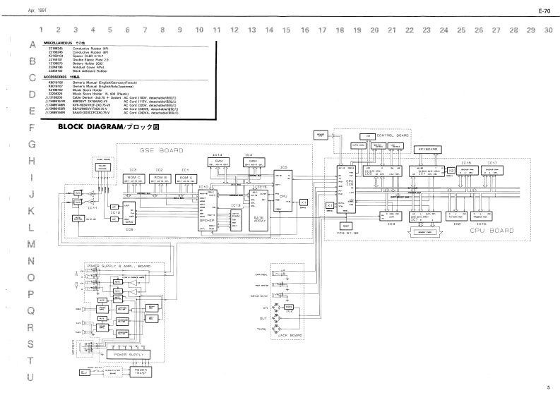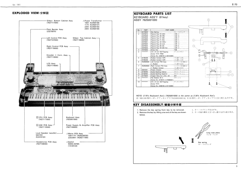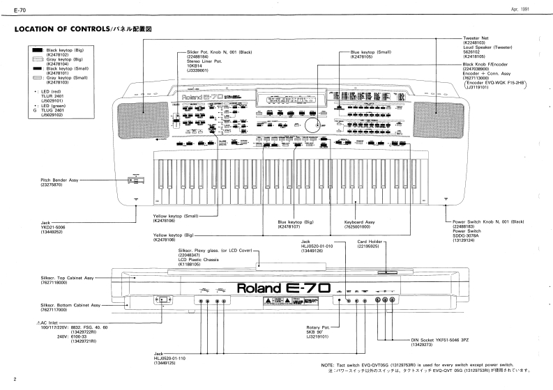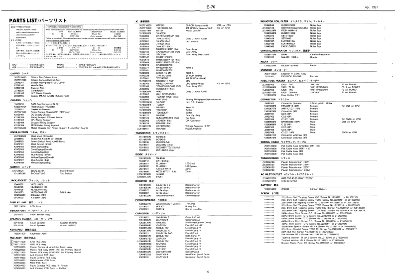 Ape.7991E-70E-7▣SERVICE NOTESINTELLIGENT SYNTHESIZERFirst EditionTABLE OF CONTENTS目次PageERRATA SUPPLEMENT is attached at the end of the page.SPECIFICATION5-----…仕SPECIFICATIONS/仕樣最格真化正误表&追加情跟多门。DISASSEMBLY.LOCATION0 F CONT月OLs=---…/《木儿配置回--91111i1i14144442CIYIOARDthht得积TH¥EXPLODEDMEW...............分-…3+两0w+C0aan门的-"Ts Baamiee'KEYBOARD PARTS LIST纳0COULTAN ERFICT.w4KEYolSAsSEMBLY...健性分期手顺………11113PARTS UST........BLOCK DIAGRAMブ口y间…CCOMPOSERAC CredPOWER SUPPLY AMPLIFER BOARD........POWER SUPPLY AMPLIFIER BOARD-..6,7Cpu pCB.............Gm网mE作t情·Lw1B=a显esGSE PCBGSE PCB.1011GWTG根TRGHT CONTROL PCB.....IGH打C0 NTROL PCB-…12,130pT05HEADPHONES PCB............HEADPHONES PCB..............…13TCt tedes rSe CaMAINS PCB..GGWg-…35+7TsWe,4外的白3属这年限eMAJNS PCB-.-.-L佩s巴aM到MLEFTCONTROL PCBLEFTC0 NTROL P℃B--…14,15】G4MI PCB..-Dl pCB.-........RIGHT CONTACT PCBRIGHT CONTACT PCB-…17LEFTGONTACT PCB...EFTC0 NTACT P℃IE44iu44---…17TEST M00E4444-4------学又卜毛一卡118,19RECOVERING DATA RAM7刀夕卜号一·于一夕②口一卡方法=…20IDENTIFYING VERSION NUMBER.---一岁与之”之/f一0流泛1114444…20ADUSTMENT..........................整…20DATA SAVE/LOAD子=夕①七=ブ/口-下44一2边,2,22C DATA.....C子一身--23,24,25,28DI5 ASSEMBLY/分解手顺TOP CABINET REMOVAL SCREWS®%14 pos ISelf Tapping5rgw35X19 TCTC P阴B218 ew No.20513319别AWoofer Netpeaker Wooferl793K24t81lRoland17368670Printed in Japan (AHE0C形