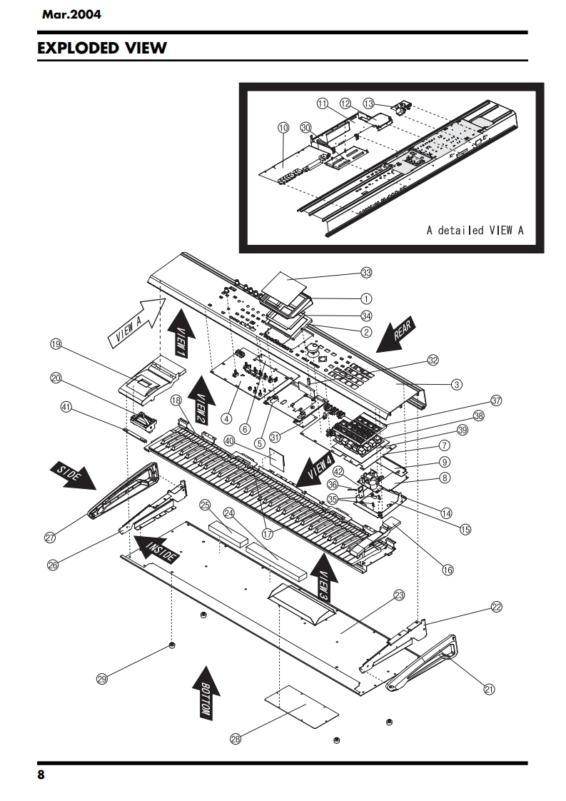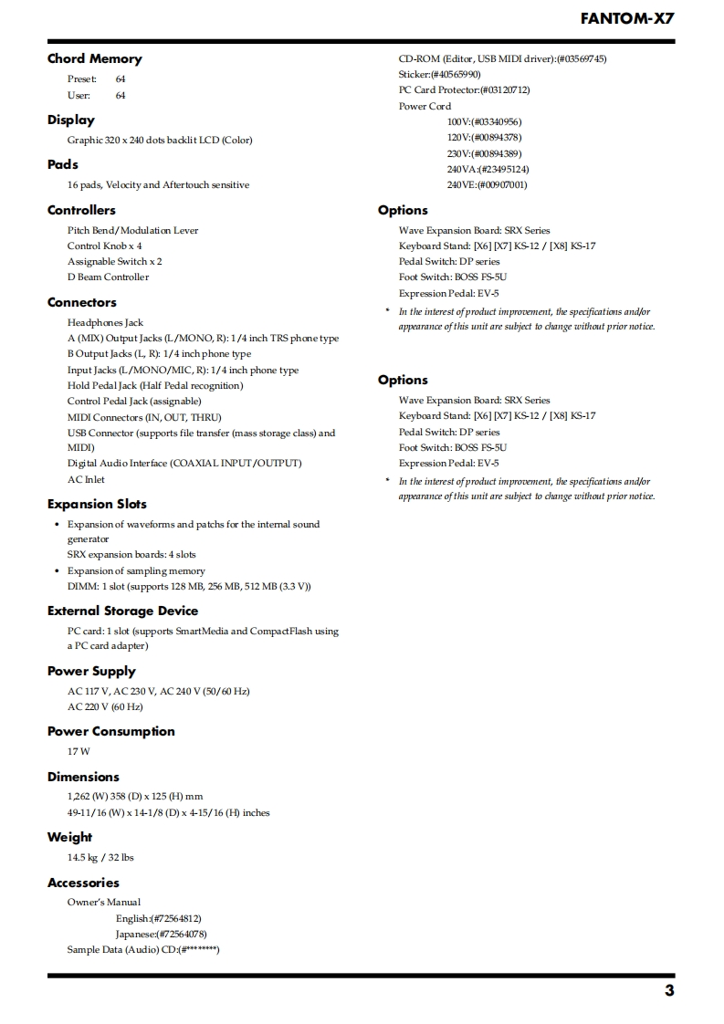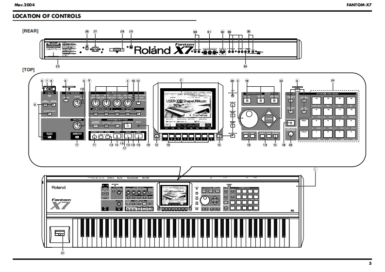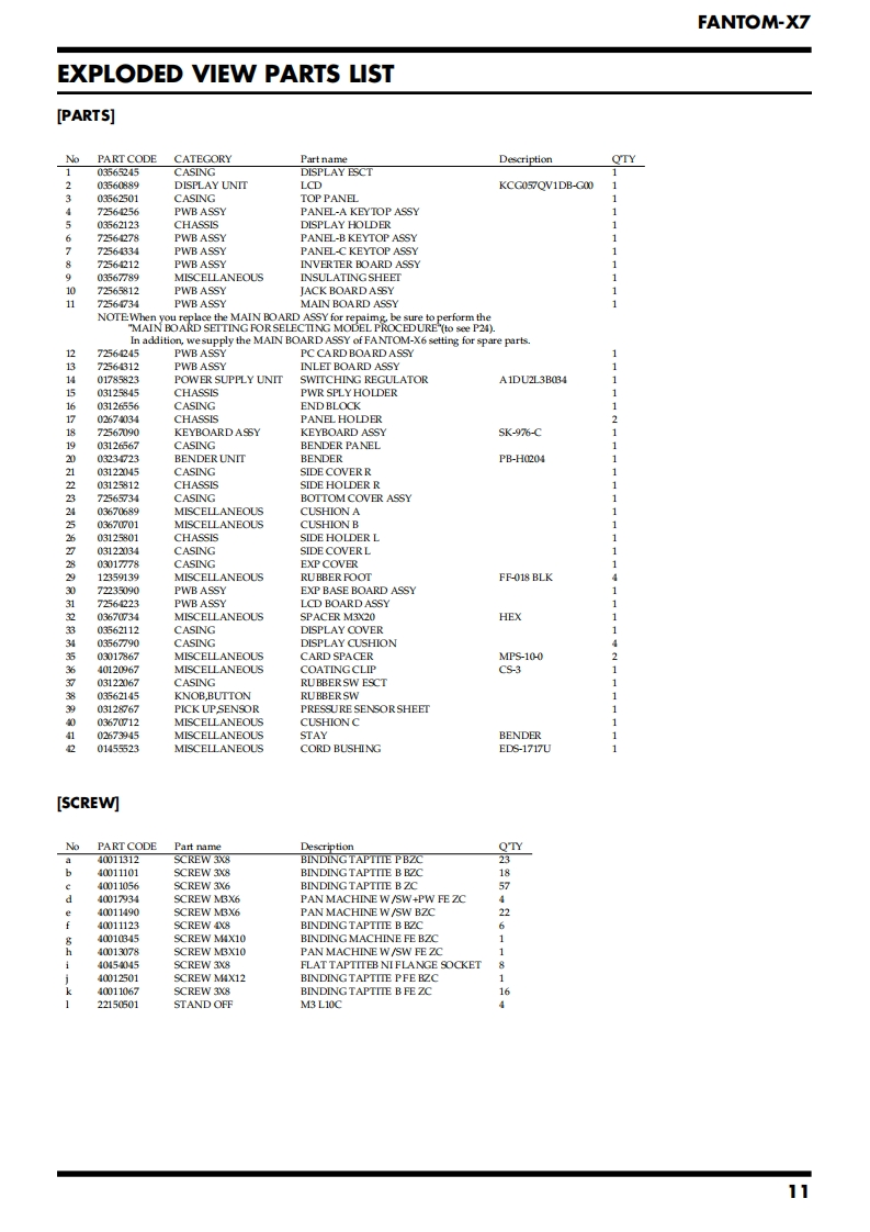 Mar.2004FANTOM-X7FantomSERVICE NOTESX7Issued by RJATABLE OF CONTENTSSPECIFICATIONS......2CIRCUIT DIAGRAM(MAIN 5).......56LOCATION OF CONTROLS.4CIRCUIT BOARD(PANEL-A KEYTOPLOCATION OF CONTROLS PARTS LIST ...............6PANEL-B KEYTOP)...........58EXPLODED VIEW.......8CIRCUIT DIAGRAM(PANEL-A KEYTOP,EXPLODED VIEW PARTS LIST.....11PANEL-B KEYTOP)...........60WIRING DIAGRAM............12CIRCUIT BOARD(LCD,INVERTER,JACK,PARTS LIST.........14PANEL-CKEYTOP,INLET)..62MAIN BOARD SETTING FOR SELECTING MODELCIRCUIT BOARD(LCD,INVERTER.IACK.PROCEDURE...24PANEL-C KEYTOP,INLET)...64CHECKING THE VERSION NUMBER....................24CIRCUIT DIAGRAM(JACK 1).............................66USERS DATA SAVE AND LOAD.5CIRCUIT DIAGRAM(JACK 2).....68TEST MODE.....25CIRCUIT DIAGRAM(IACK 3).70RESTORING THE FACTORY SETTINGS..33CIRCUIT DIAGRAM(IACK 4)....72SYSTEM SOFTWARE UPDATE PROCEDURE........33CIRCUIT DIAGRAM(JACK 5)..74KEYBOARD PARTS LIST........36CIRCUIT DIAGRAM(PANEL-C KEYTOP)...............76KEYBOARD CIRCUIT BOARD.....38CIRCUIT DIAGRAM(LCD)...78KEYBOARD CIRCUIT DIAGRAM...................40CIRCUIT DIAGRAM(INVERTER).79KEYBOARD DISASSEMBLY.41CIRCUIT DIAGRAM(INLET)....79BLOCK DIAGRAM....…44CIRCUIT BOARD(EXP BASE).80CIRCUIT BOARD(MAIN 1).....46CIRCUIT DIAGRAM(EXP BASE)...82CIRCUIT BOARD(MAIN 2)47CIRCUIT BOARD(PCCARD 1)............................84CIRCUIT DIAGRAM(MAIN 1)........48CIRCUIT BOARD(PC CARD 2)......84CIRCUIT DIAGRAM(MAIN 2)...5.0CIRCUIT DIAGRAM(PC CARD).......................85CIRCUIT DIAGRAM(MAIN 3)...........................5.2ERROR MESSAGES..........86CIRCUIT DIAGRAM(MAIN 4)..54Roland口回0Copyright 2004 ROLAND CORPORATIONAll rights reserved.No part of this publication may be reproduced in any form without the written permissionof ROLAND CORPORATION.Roland17058249E0Printed in Japan(0500)(AS)