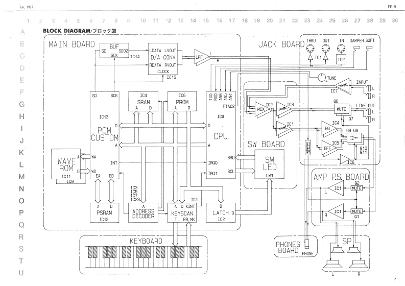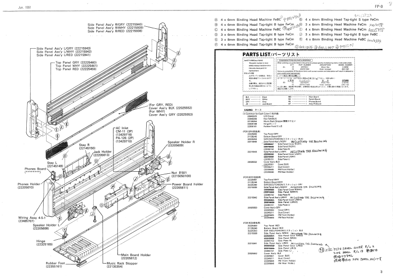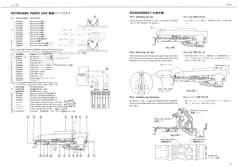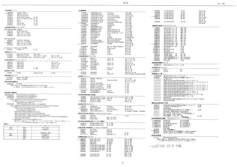 Jun 101FP-8FP-8SERVICE NOTESSPECIFICATIONS/仕樣ADVANCED SA SYNTHESIS DIGITAL PIANOFirst EditionOEITEGARD.--TABLE OF CONTENTS目次PageOOTAL EFRICTSPECIFICATIONS...HOW TO PUT ON THE MUSIC STAND三1=艺与夕▣又夕下0取以付付方…1LOCATION OF CONTROLS .-.--.-军辛儿配图同一2EXPL0 DED VIEW-…分同4444444i4444…2,314w009州n经》404gKEV阳0 ARD PARTS L5T-…键擅/一☑明入卜…5川5 ASSEMBLY----…=…分手顺444444144…一与,6BLOCK DIAGRAMBOPA C415-J06 1AWB0A明D--…MAIN BOARD=-一B,9融k式立了ASWITCH BOARDSWITCH BOARD........10.11JACK 80ARDJACK BOARD12.13APfS目0A明D…一MppS00A0=--1415E-4ExremicePCB24pL0W-------PCa24PL0W-44444--16,17PCB24PM1D1111111=111m11111111PCB 24P MIDtmi-l6,17PCB24PH‖=======824pH=-1617LOADING THE FACTORY PRESET.........77夕卜一·ブ刂七y卜的口一方法……18-18,10HOW TO PUT ON THE MUSIC STAND/32-?夕·ZD取W付H方ADJUSTMENT SPECIFICATIONS-CA MSB ADJUSTMENT"质型仕样D/AM3B时望”-120TROUBLESHOOTING.分儿92-子1之ym-20CDATA..-21,22KEYB0AR0 STAND FPS-80PTI0W1mm:年=求-下·X夕之下FP5-8(才才a】a-23(Align hookes with sorew holesRoland包Insert andtpen5 crewsRoland1705960gPrinted in Japan (AH00)ICR)