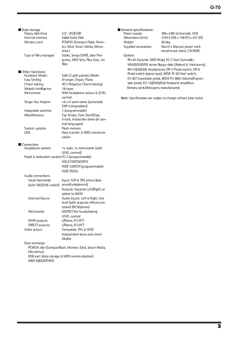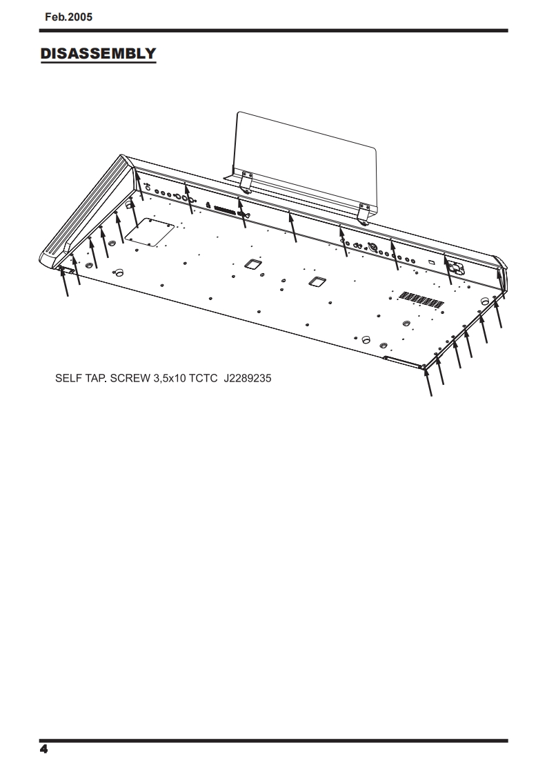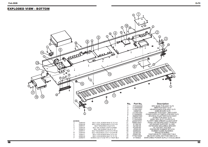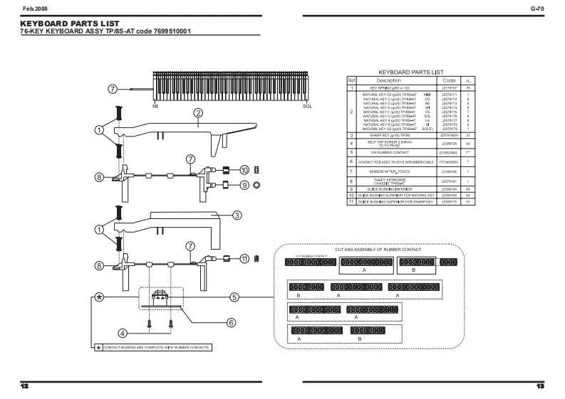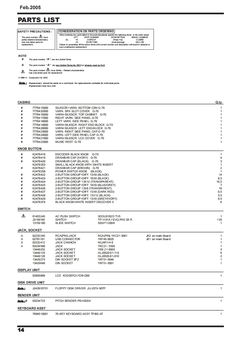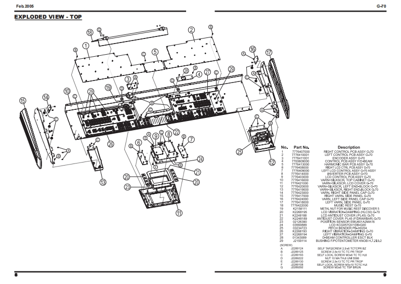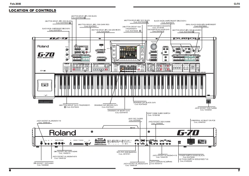 Feb.2005G-70-7SERVICE NOTESSecond editionMUSIC WORKSTATIONIssued by RESTABLE OF CONTENTSSPECIFICATIONS23CIRCUIT DIAGRAM (AUDIO 1/4)80DISASSEMBLYCIRCUIT DIAGRAM (AUDIO 2/4)82LOCATION OF CONTROLS6CIRCUIT DIAGRAM (AUDIO 3/4)EXPLODED VIEW (TOP)CIRCUIT DIAGRAM (AUDIO 44)EXPLODED VIEW(BOTTOM)oCIRCUIT BOARD (HARMONY)86KEYBOARD PARTS LIST12CIRCUIT DIAGRAM (HARMONY 1/2)8PARTS LIST14/18CIRCUIT DIAGRAM (HARMONY 2/2)90WRING DIAGRAM20CIRCUIT BOARD CIRCUIT DIAGRAM (INVERTER)INFORMATION UPDATING MUSICAL DATAOPERATIVE SYSTEM22CIRCUIT BOARD (MIDI)92UPDATING OF MUSICAL DATACIRCUIT DIAGRAM (MIDD)FACTORY RESET25CIRCUIT BOARD CIRCUIT DIAGRAM(LCD CONTROL)96UPDATING OF THE OPERATIVE SYSTEM26CIRCUIT BOARD (RIGHT CONTROL)98CHECK THE SOFTWARE VERSION29CIRCUIT DIAGRAM (RIGHT CONTROL 1/4)100TEST MODE29CIRCUIT DIAGRAM (RIGHT CONTROL 2/4)102BENDER CALBRATION45CIRCUIT DIAGRAM (RIGHT CONTROL 3/4)104TOUCH SCREEN CALIBRATION46CIRCUIT DIAGRAM (RIGHT CONTROL 4/4)106BLOCK DIAGRAM48CIRCUIT BOARD CIRCUIT DIAGRAM (RIGHT CONTROL LCD)108CIRCUIT BOARD (MAIN)50CIRCUIT BOARD CIRCUIT DIAGRAM (LEFT CONTROL LCD)109CIRCUIT DIAGRAM (MAIN 1/14)52CIRCUIT BOARD (LEFT CONTROL)110CIRCUIT DIAGRAM (MAIN 2/14)54CIRCUIT DIAGRAM (LEFT CONTROL 1/6)112CIRCUIT DIAGRAM (MAIN 3/14)56CIRCUIT DIAGRAM (LEFT CONTROL 2/6)114CIRCUIT DIAGRAM (MAIN 4/14)CIRCUIT DIAGRAM (LEFT CONTROL 3/6)116CIRCUIT DIAGRAM (MAIN 5/14)60CIRCUIT DIAGRAM (LEFT CONTROL 4/6)118CIRCUIT DIAGRAM (MAIN 6/14)62CIRCUIT DIAGRAM (LEFT CONTROL 5/6)120CIRCUIT DIAGRAM (MAIN 7/14)63CIRCUIT DIAGRAM (LEFT CONTROL 6/6)122CIRCUIT DIAGRAM (MAIN 8/14)64CIRCUIT BOARD CIRCUIT DIAGRAM (HARMONIC BAR)124CIRCUIT DIAGRAM (MAIN 9/14)66CIRCUIT BOARD CIRCUIT DIAGRAM (POWER)126CIRCUIT DIAGRAM (MAIN 10/14)68CIRCUIT BOARD CIRCUIT DIAGRAM(SRX)128CIRCUIT DIAGRAM (MAIN 11/14)70CIRCUIT BOARD CIRCUIT DIAGRAM (PHONES)130CIRCUIT DIAGRAM (MAIN 12/14)72CIRCUIT BOARD CIRCUIT DIAGRAM(ENCODER)130CIRCUIT DIAGRAM (MAIN 13/14)74CIRCUIT BOARD CIRCUIT DIAGRAM(D-BEAM)130CIRCUIT DIAGRAM (MAIN 14/14)76CIRCUIT BOARD (CONTACT)132CIRCUIT BOARD (AUDIO)78CIRCUIT DIAGRAM(CONTACT)134Copyright 2005 by ROLAND CORPORATIONAll rights reserved.No parts of this publication may be reproduced in any form whithout the written permission ofROLAND CORPORATION.RolandSN00081K6018563Printed in Italy