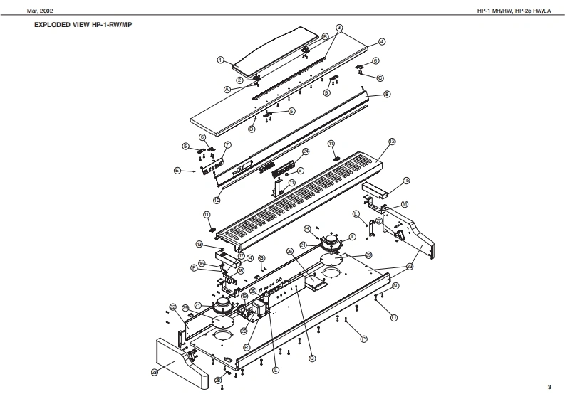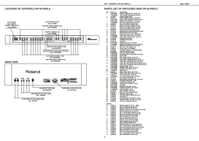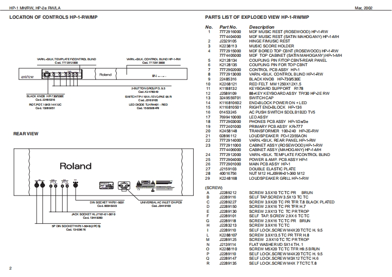M里.2002HP-1 MH/RW,HP-2e RW/LAHP-1RW/MHSERVICE NOTESSpecificationsHP-1HP-2eadion(TP30FHP-2e RW/LAFirst editionIssued by RES平量P量Roland Digital Pianoaue间na Church Organ0 n5rngt,ChorTABLE OF CONTENTSPage4hord+Sringt,Hapaichord Chok Chunch OrganSPECFICATIONSLOCATON OF CONTROLS HP-1 RNMMPPARTS UIST OF EOPLODED VEW HP-1 RAMMP22mTen年a4 Reeb,Key bud3汽DE0EWH1Aw静LOCATON OF COTROS HP-2 RWLA34PARTS UST OF EOPLODED VEW HP-2 RMLAE汽DE0ewHP-2aNLA45Tuning (0.12KEYBOARO PARTS USTSTAND EOPLOOED MEW KS-1 RAMP672 NOTE PEDAL EOPLODED MEW PARTS USTCRCUT DIAGRAM 2 NOTE PEDAL2typex2 typeSTAND EPLOOED MEW KS-2 RALADa年3 NOTE PEDAL EPLO田ED MEW&限TS USTCRCUT DIGRAM 3NOTE PEDALTEST MOOE HP-129TEST MOOE HP-2e10/110PARTS UST HP-1 RWMP2h3瓷物产a5o四Pt5d4hong话demo ongsBLOCKDIAGRAMPHONES&VOLUMEPCB ASSY&CROUT DIGRAM17船,然装然孩n%2画PRMARY PCBASSY CRCUT DIAGRAM17Pand LockMAIN PCB ASSY20Wx2CROUT DIAGRAM MAIN PCS ASSY1912mx212 mx2GwEA&晚CBASSYPad/CanctocHou中mna hox2Qo或出0m年u中ha女26g4CONTROL PCB ASSYHP-1 CRCUI DIACRAMMOI h /MDI Onput (/,R)(LNom,R.NCI In/NDI OtCONTROL PCB ASSYHP-ORCUT OAGRAM23Pow中y0H7XAa2230%Aa20A0117%0220%04040W40 W14M47%24091320wa4p0140awM4%P0d0034242716491Ounefs Manunl Power cablsRoood (RWY Mahogany PYC(M-wood PVC (RWYL山tOkA转akeudoMand roartSem-FulCopyright 2002 by ROLAND CORPORATIONRolandSN00060K0019402P inted in ltaly (E00)(AD)