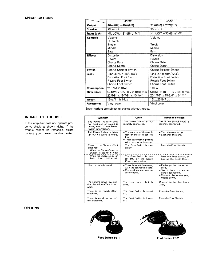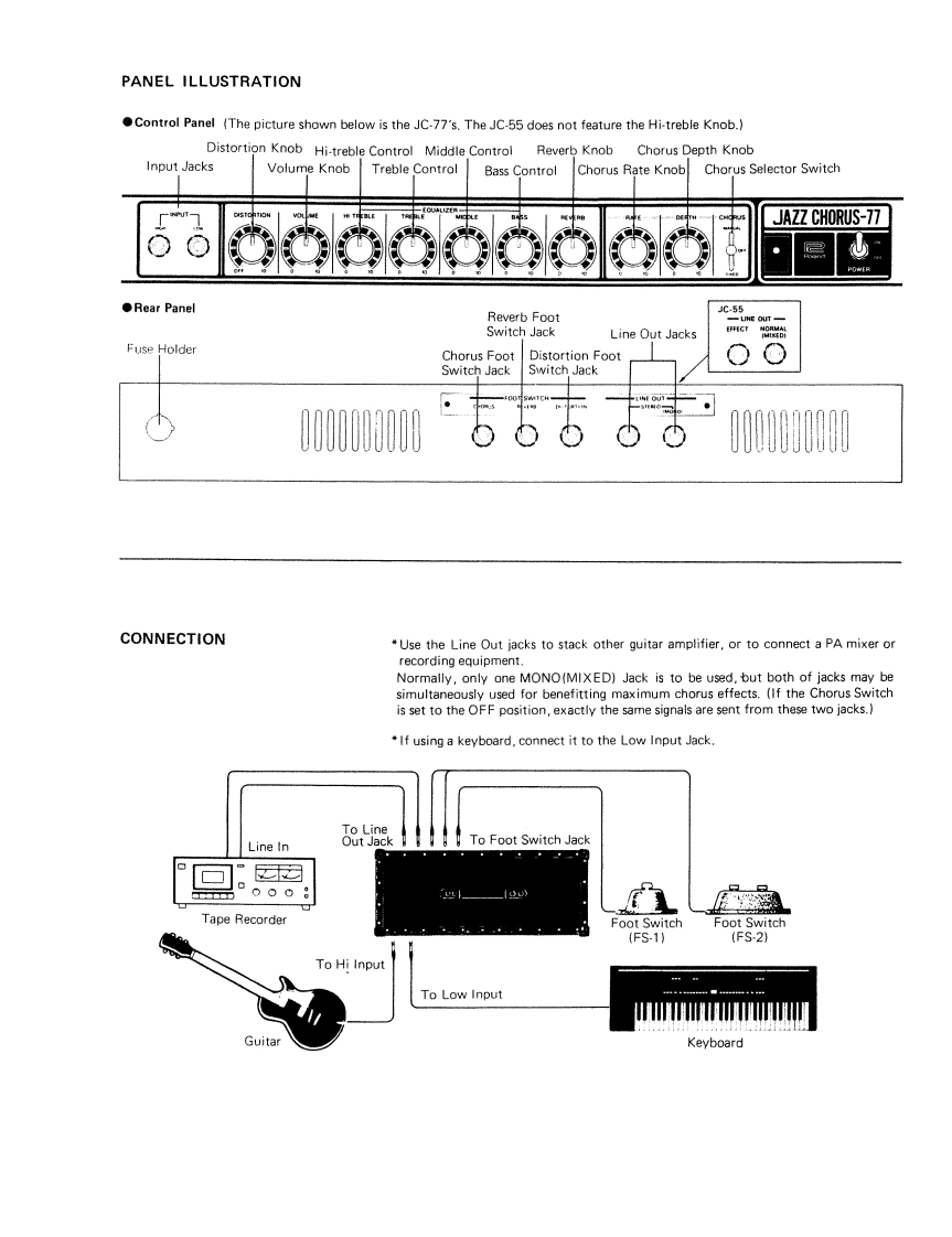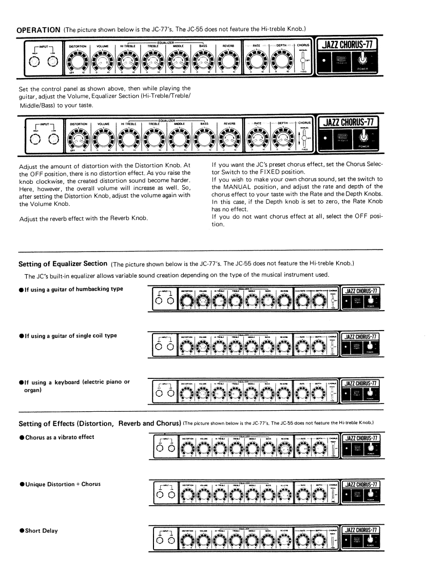 RolandGUITAR AMPLIFIERJAZZ CHORUSJ0-55J0-77OPERATION MANUALRolandPlease read the operation manual carefullyfor proper operation.(This is the picture of the JC-77)FEATURES.The Roland Jazz Chorus JC includes.Rich and spacious chorus effect is.The JC adopts hard fiber in the cabi-newly developed heavy duty speakerobtained by combination of the orig-net edge,and polypropylene pro-inal chorus circuit and twin powertector in the corneramplifier..The built-in 4 band equalizer allowseven more delicate tone color crea-.The removable casters are providedtion.(JC-77)for easy moving of the unit.(JC-77)IMPORTANT NOTES.Operating this amplifier near a neon.Turn the volume of this amplifier to.Avoid giving a strong shock to thisor fluorescent lamp may cause noisezero before connecting or disconnect-amplifier,and do not move it while itinterference.If so,change the posiing the plug,to protect the speakeris operating.tion or the angle of the guitar.from excessive strainDo not use this amplifier in extreme.If the reverb volume is set too high,.When setting up this amplifier with ahumidity or heat,or where it may benoise may be heard,so turn downguitar,connect the connection cordaffected by dust.the reverb volume or change the po-to the guitar first,then to the ampli-sition of the amplifier.fier.When disconnecting,pull outClean this amplifier with mild deter-the cord from the amplifier first andgent,and do not use thinner.then from the guitar.Use the specific fuse when replacing.