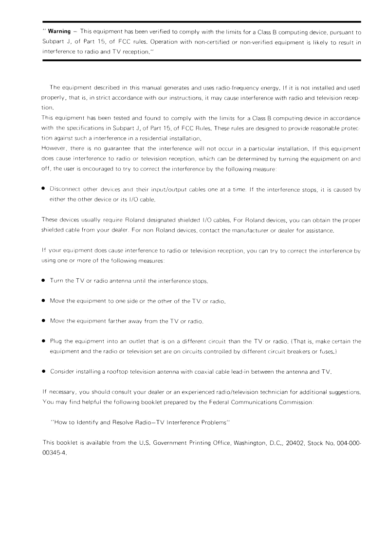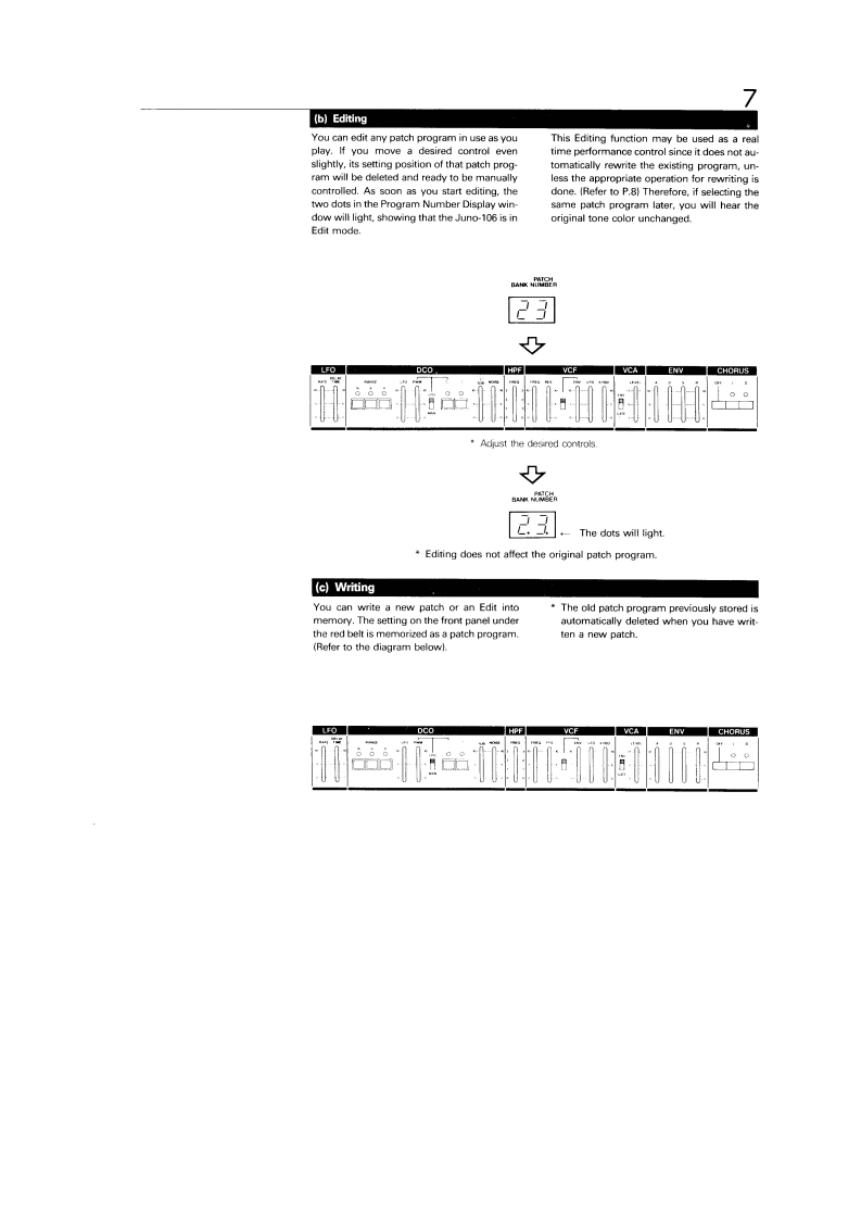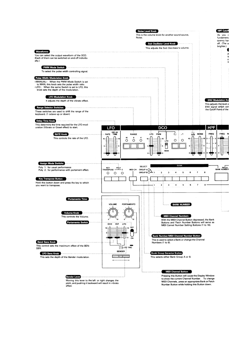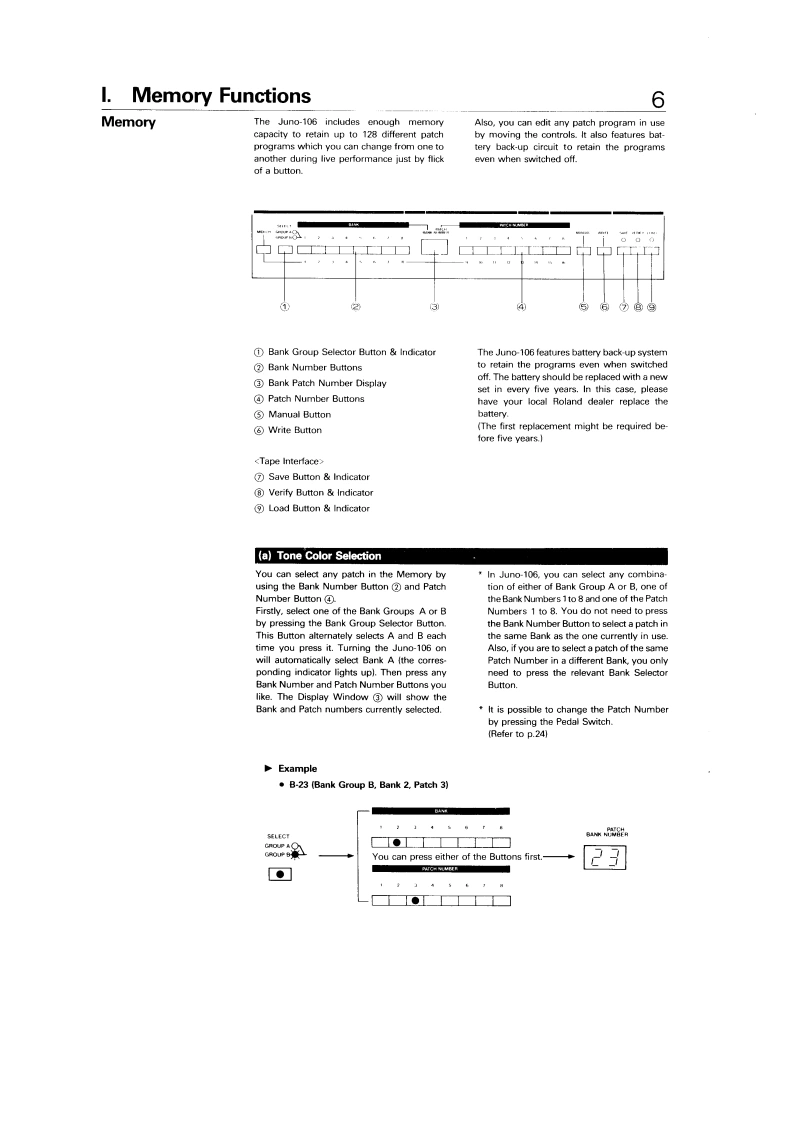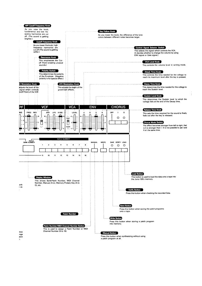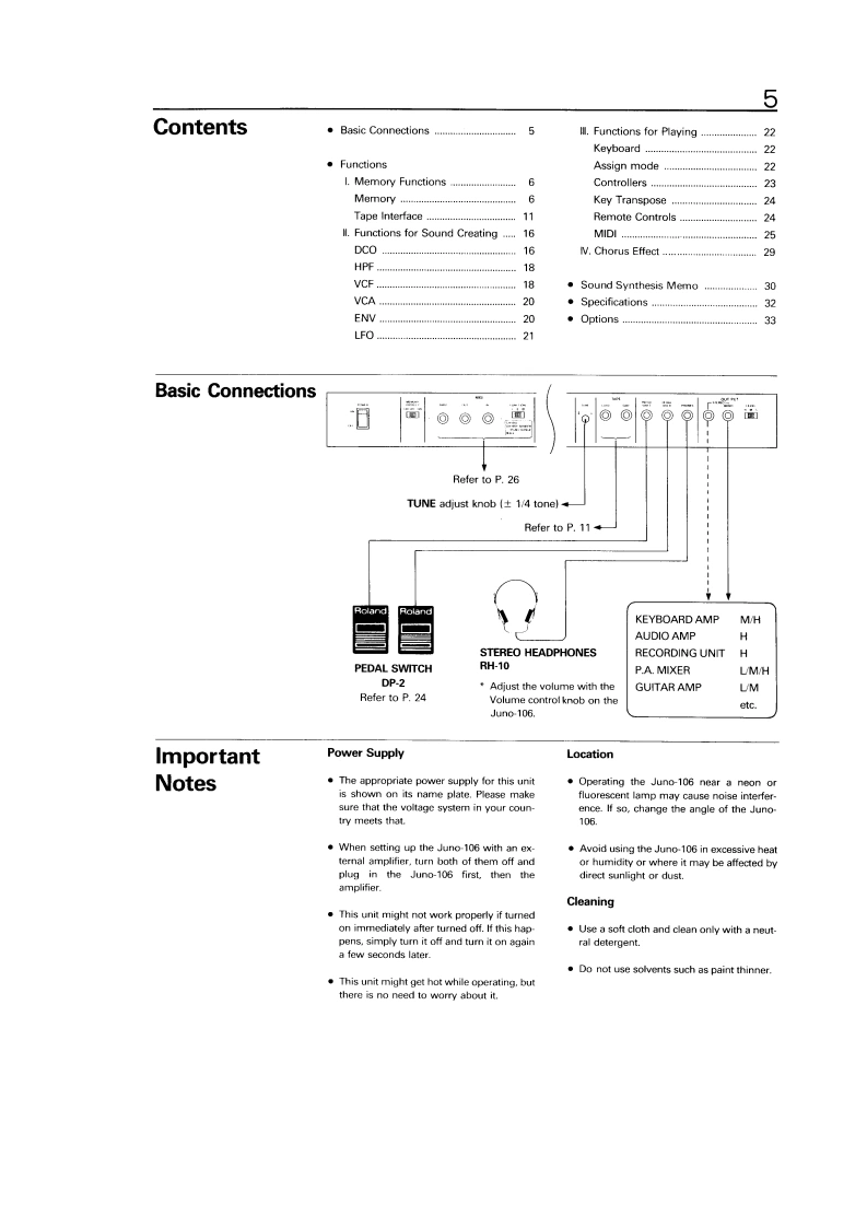 RolandPROGRAMMABLE POLYPHONIC SYNTHESIZERJUNO-O6OWNER'S MANUALJUNO-106The Roland Juno-106 is 61 Key,six voicefully programmable polyphonic synth-esizer..The digitally controlled oscillator (DCO)guarantees an extremely stable pitch..The Juno-106 is the complete 6 voicesynthesizer provided with 6 VCF's,6VCA's,and 6 ENV's..The Juno-106 includes memory capacityto retain up to 128 different patch pro-grams..The Juno-106 features battery back upsystem to retain the programs evenwhen switched off..If connecting the Pedal Switch to thePATCH SHIFT jack,you can call the 8patch programs stored in the same bankone after another,simply by pressing thepedal..Transposition to any key is possible bythe Transpose function..The Portament function is provided..The Chorus effect produces rich and expansive sounds..Featued with MIDI BUS,the Juno-106can be set up with other MIDI devices.