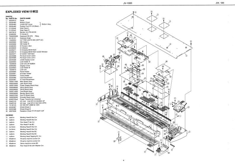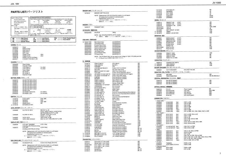 JLN 1903J-1000JV-1▣▣▣SERVICE NOTESUSIC W▣RKSTATI▣NFirst EditionTABLE OF CONTENTS日次PageSPECIFICATIONS/仕樣8 PECIFICAT10N图44。仕样44:1¥4晚:指8/具1-9,9:学-9a-之4>04t/伊e15:060/步,为之每量州L0CAT0W0FC0T月0L8…-辛置间-………………2,3的有443w/学古十4干-□四日华个分7:7下44准EXPL00EDE1111111111111511511111分解区1n111111111111111n1n1=11n1n1n1n1111n40 CK DIAG月AM444ブ曰5 aIa.aLaLaLa.Ia.LaL4LLI…5VRENG DIAGRAM-…-7f中刂27民----5PA月TS3T1111n111111111111111111111151t1一)又下191919191"11=11111111=1=7。BKEYBOARD PARTS UST.......................键塑-岁刂入卜444414…碧n4言》年14/7g-7学卡KEYB0 ARD DISASSEMB假Y-·----------·键分解手顺………………9,10/-:477DATA 8AVEALGAD...............-.-.-.-.-...-.-9功包-/日-卡…17-20CAm/DATIA-MINDENTIFYING VERSION NUMBER.............MEMORY INIT门ALIZATION……………·内部RM初期伦·…………20内一手-1e>书tHW TO EXPANSION BOARD.................工夕天代二口之求=ド0服付方法…21e3-M3,7内k1---…FOR EAN/FCMD-M3 ENDER B0a月DA85Y-………4+…BENDER BOARD ASSY---.............21.223WTCH-40ARDA3SY----,----,-,-3WTCH-AB04RDA53Y…23、24SUB-P.S BOARD ASSY......................SUB-PSBQAAD ASSY...............23.25O4年/于tA九4a8-k-r9,-y与罗JACK B0%HDAS8Y4·ACK日04月D ASSY.44444+25.西地配"线A0到SWTCH-B0ARDA8SY·--·-·----3WTCH-日B0 ARD AS8Y------…27、于-f:>194n7E>+2+wn/学-女)十-图PSBARDAssY.........................PSB0ARDASSY...............2729的0MANA但0 ARD ASS'Y44·MAIN-A0 ARD ASSY4a-30.31MANB BQARD AS5Y...........................MAN-BB0ARDA35Y--…32、3G0#/伊e19=54710fme:-(:行43四属008a典同C0/Pf九ufQ减4/能为-七=事-32行以y号材机C8WNCI1M 20WACDEA 20EN之3:一有花0审g/2票地/直度Pw*内/k取Daerh Maa Bad Dam plyaneel0.起@0/速m3-F用响同/得山-月事-有蛇G6的插108h0m2的m她g/4y之中年型0000回精44←年-(O4 nom/0G009s04%00-N重鞋c精一:8有支/时色卡专,夕e/y9:7罗f4量第观甲4/17aay51-T-8D元t2…4-Roland17069708Printed in Japun (AGED 1