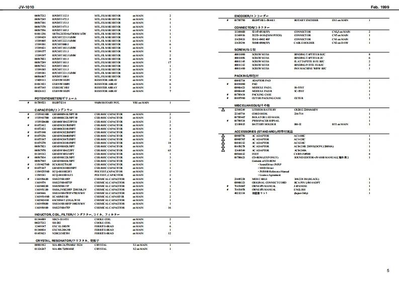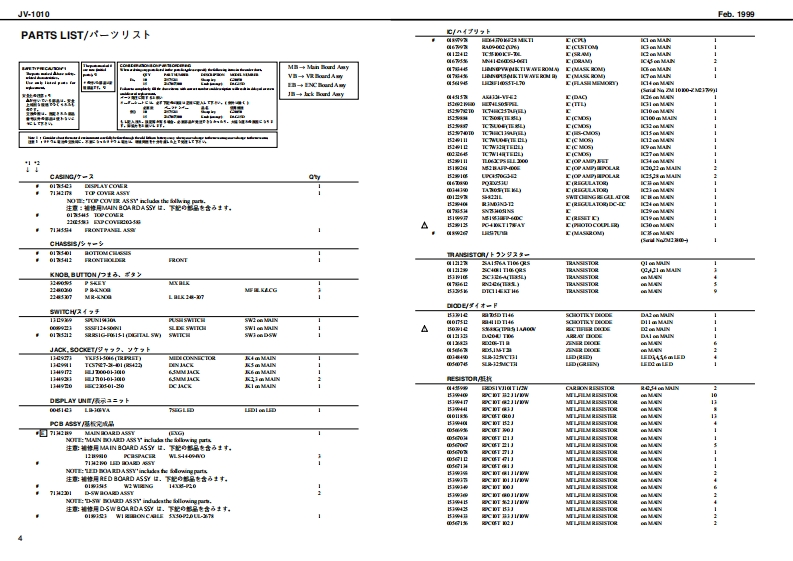 J-1010Feb.1999J-1▣1▣SERVICE NOTESSPECIFICATIONS主套仕樣First Edition8400:44习·乡》电4-·里3-k1@sa于a毫】Issued by RJA,专Nun鲜edPH4年化数14116skea0到化0世va·化事】TABLE OF CONTENTS目次Pageilvun◆龄网Ms。■sde+fn下dV又a·8?事:量川0:W随+:”da】S毛CFICATO8主车任模PAW且AOUT成未寿配百同.2·aw-EXPLODEDMEW服:理PARTS USTA=7号天卜FACTORYRES交T77夕卜y=▣号七y上获2a5》F1Updaing the program mimary softvra wrsion才口少36x毛号=身术=9。》了y为法、8TEST MOOE天k毛=P72他aw“捷37设治9江-白0fws玉3一”y七=9目e水出gm口字夕同:配线司◆王3x非年:起Croitdagam同.的Craitbaard瑟长同(74系五)售h时写年子年a九4T成aasB时1e7:1插81oe,e4●特4-刀0DCw eN·vcn-g◆Breeukoens年演2酒11:2卫15141◆1m春情址年中量1dhaf3s3emEA年)利CT列家一6雕《】aTB方Roland JV1▣1▣结dt中1指·w:1复证短e正色是1ee的1ONNL CNNECT C斜送e)m宜-:王305》·罪:影V-习餐ah到年aKA》e3于上青·n?F市2:+酒送3C49YSATGAPL自之,力·7方B·罗事一:R0座Copyright 1999 by ROLAND CORPORATION面1阳0一于之F本湘0一螺.毛《儿止全等老如斯下限号:起精书名己上老儿1事。1Roland17059968Primed in Japan AA00 (DP)