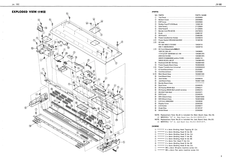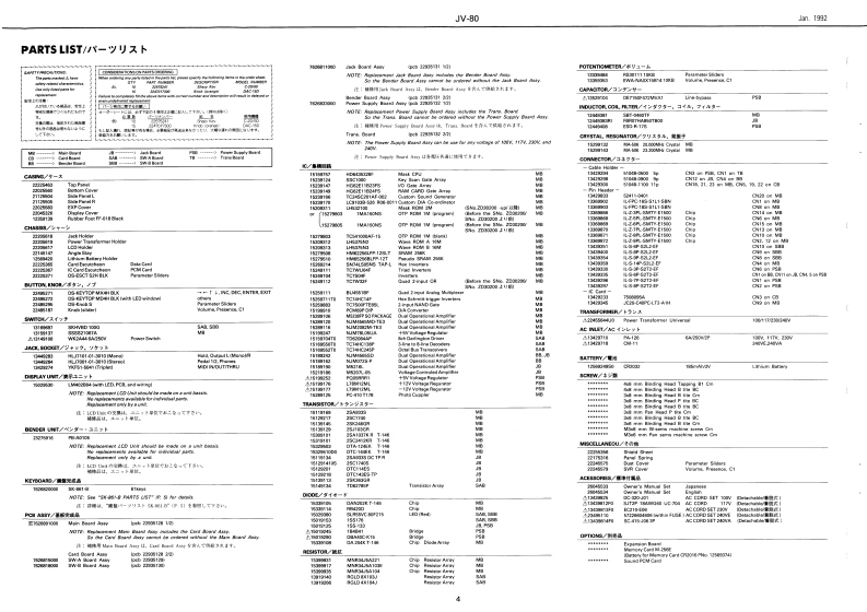 an.1932JV-80V-B▣SERVICE NOTESMULTI TIMBRAL SYNTHESIZERFirst EditionERRATA&SUPPLEMENT is attached进the end of the page.专最终页配正规表&追加情鞭多门生寸,TABLE OF CONTENTS目次PageSPECIFICATIONS/仕模SPECFICATIONS仕得CKEv8040一-一-一…81 y Iwvelecity,m4 rtoschl1OMAXIMUM POLYPHONYLOCATION OF CONTROLS...代家儿配图回14444444-…-2OMEMORYExPL00EDWI1EW-…分解同......-罗刂天卜Pertormance烟Rhyhme SetKEY BOARD PARTS UST健经1一之又卜111911111111111115·P动刷KEY DISASSEM相LY一健整分解手顺-4…7Rhythm Sat;1PresetBPaichWING DIAGRAM7下少之5岁中7号么…7ParioranceTESTAODE ...于天卜毛一KHhn多at:1把hMEMORY INITALZATION.-..-...内宿RA州①初明化9=1=11111:1用Deta Card---16DENTIFYING VERSION NUM相ER--…(一沙7之②方法…11Ahythm Sat 1DATA SAVEALOAD.....子=夕0七=プ/口-下4i=4444444…12一15OEFFECTHOW TO MOUNT THE EXPANSION BOARD工7天岁当·术一5》收付方法……15Rewerb a typesODISPLAYMAIN...................MAIN B0A明DA5SY-==-----…16.17OPOWER SUPPLY15w¥SWA日0A月DAS5Y-=SVW-A00 ARD ASSY-r19111=11111111m111ii1u18.1904M0SW-B BOABDAss..5W-日0ARD85Y---…18193阁-31a间t218410iA311320H0iw5框GT+.JACK B0ARDA8sY.JhCK80AR0A55Yii4=4444…20.2到OACCESSORIESOwner's Marusl Set HaponeselPN004553POWER SUPPLY BOARD A5S"Y -.-.--P0VEnS以JPPLY0 ARD ASSY-==*=…22Owner's Marual Sat IEnglshPW0204554CCord IDetachub以港峡式0…210WDC10J01PNo 1303135117V SJTZP 16AWGED UC-704Na12a1202习WEC271D-06Wn12aa012024e5720420 a hwthin FU2:Na222311024V%8C415-J283PW13a24140OOPTIONSExpanaion里ougVemary Card M-2团IBatery r Merory Card CH2D16 PNa.1254D07)Sound PCM CardRoland17059628Printod in Japan IAGEOI (CRI