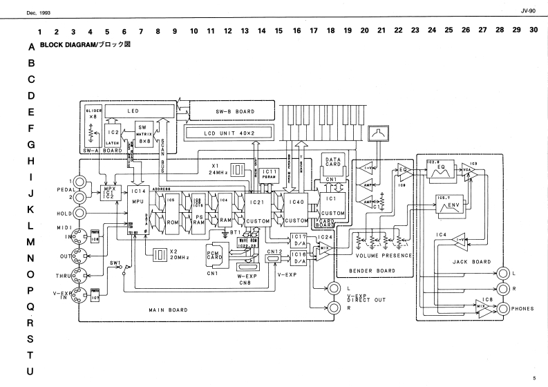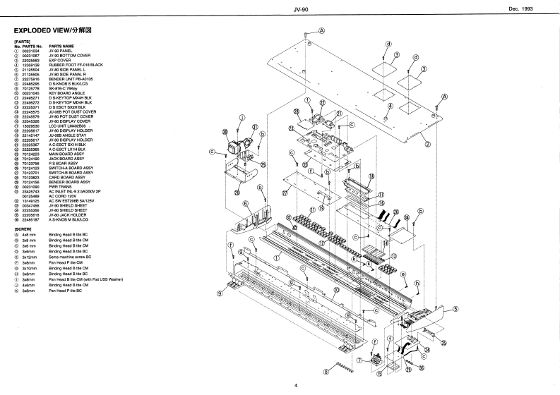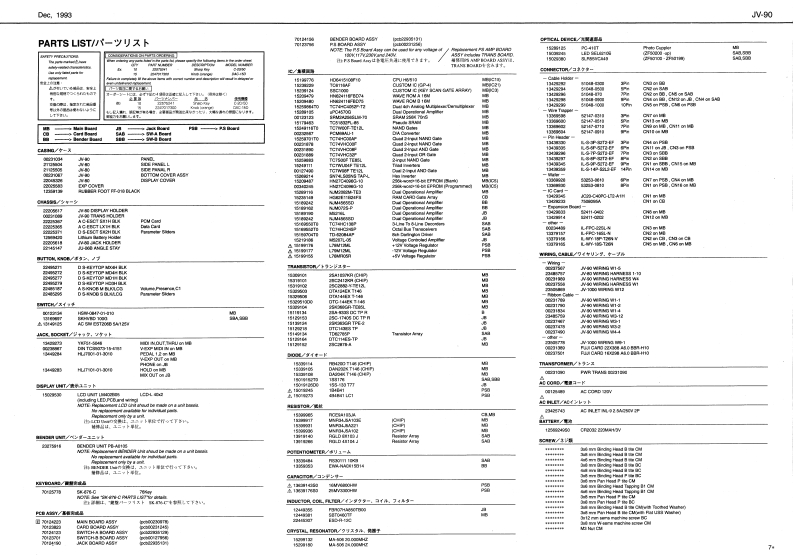 D4e1993JV-90UV▣SERVICE NOTESEXPANDABLE SYNTHESZERFirst EditionTABLE OF CONTENTS目次PageSPECIFICATIONS/仕樣SPECIFICAT刀C8m,,nnan:壮相aaa441M-0:B年andable Syrthin/工夕天梦ブ标,乡士转f坪-LOCATION OF CONTROL8·内华儿配置回…………2、习EX风0DE0VEW:11****9=====191=1分解回n15131311■1■1■1111■414411131144OKeybo4rd/城罐gL0 CK DIAGRAM--*--·+…回y7☒1n1n11n11111111111181n1n1n1n5WIRIBN3 DLAGRAM.......................7t)岁44………6P%月TS LIST444444111m4444414444《-y又k……………=7,8Fo/7Vt7卡---Phw/Ty手26noa/t7事-T天=KEYBOMARD PARTSUST -.-.-.......-.....-....统蝗/(一以又卜1111n113111■11■1■11■1=8R秒■8指/买A·电y4KEYB0A月DD5A85EME队Y-1=1,11111111n盘缝分解平精“a4:4444……·…9,10n=l/f之方=十是:九5/有y里TEST00Eaa……季X卜毛-5…--,,,10w14BATA Cand0 EATA杏=Kt3a之-ch5)i,享EH0WT0XPN50N目0A月0··…·工7入2乡a求-0付方法··18Ftm8VyXA·电?P1DENTIFYING VER8 ION NUMBER-·-·----,一岁g00曜3方法11111180rct/工7r2卜-13p5/3理MEMORY INTIALZATON......................内程月AM切期化14111111111111:186r2图:0m5/0期ODispley/40 chatacoors,2 ines Backl LCD)BENDER0AR0AgSY4444BENDER BOARD ASSY.....---....--....19.20402行μ6,2脑清LGDCXB0A月DA58Y*……JACK BOARD A58Y.-...................19.20OCornaclert/黎酸w子Q年对a/7Nブghiey夕:MLna1RE号n小R..................CARD BOARD ASSY................18.21Ps0月DASSY19、21MAN0A0A8SYMAN日0ADA85Y-………-22,236P〔1,卜、B-,VEPSWTCH-A BQARD ASSY....................SWTCH-A BOARD ASSY...................-.4C时s由DATA C时,℃MCSWTCH-B BOARD ASSY.......................SWTCH-B BOARD ASSY..................25方-F-a日y卜D4T4力-F,eMD-门OCtn-a小enw/外卷寸法226X305X85mnOwn重量9.gkg (21be.17ealOPoo Conoum闻/有费量力-421情100M:Owrer's Man/寒夜顶晴害8CORD BET EC511-E07 HOOVVHEPm1349h0.1342622IAC CORD SET PHE8-Z-VCTFKES-CHE221Pm0134行22☒AC COND SET 14VA SC-07B-JOR ES20G-7SHMA:Png1740627⊙Cpen/壳是Venory IDATAl Card/¥号月一EAT力-N:M-28EStoroo Hoodohono/F:FH20010Plh/N9易·天有y7DP.26 BOSS FS-SUPJ-1M232=Y四07162010DATA (RO0ea时/DATA IRO力-F:M@施/%的影号一Xwgrw0nc时/哼工-7·工7Z6>2n之·末-F:韩y凯0y一天00p0e0bd/米X·王7a≥号■>·求-F:E0AE2V-天Roland17059732Second Printing Printed in Japan (G(CR)I.