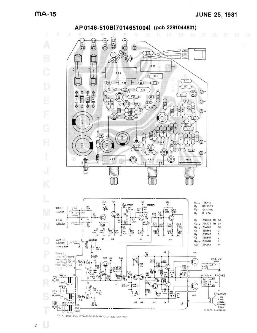 JUNE25,1981mA-15)E▣SSMA-15 SERVICE N0T正SFirst EditionSPECIFICATIONSOutput:15W RMSPower consumption:22WWeight:3.1kgDimensions:300(w)x167(H)x162(D)mm6.831b811.86.66.4inPotsBVH6PA360A54(13219112】Hex cap bolt (4pes)Knob4 x 20mm Fe blkN-128(2247012800Hex cap bolt(4Rcs】Cabinet4 x 10mm Fe blkCase N-612(2201061200】EscutcheonN-102(2222010200】SpeakerPD-12104B(2241050900)Grille-235-01-070(13449208N-101(2227010100)Baffle boardN-115(2117011500j】Self tapping(4pcs)Self tapping screw{4pc4x25mm truss Al Fe blk4 x 16mm truss Fe blk AlJack6G-7615#01(13449105)BadgePower1N-404(2251040400)1801(13149102)LEDGI-3PR2(15029113PARTS LIST2201061200Case N.-612(cabinet】SEMICONDUCTOR2227010100Grille N-1011512980229D228-1transistor2117011500Baffle boardN-1151512960223D667-C2251040400Eadge (logo)N-404151291042SC732TM-GR2222010200EscutcheonN-1021512960123D666-C2281026104ChassisN-261C151291082SC945-P2241050900Speaker PD-12104B1511960223B647-C1511911128A970-GR2247012800Knob1W-1281513910328K30ATM-GRFET13449105Jack80-7615#0115019550RD13EB3zener13449208JackHIJ-235-01-070stereo15029113GL-3PR2LED1501920910E-2rectifier13219112PotentiometerEVH6PA360A5415019103182473diode15229902D-22Athermistor22450233N0PowertransformerPT-N-233N00W12559105Fuse SGA 1A100W22450234C0PT-N-234C117W12559133Fuse MGP 1A117W22450235D1PT-N-235D220/240V12559508CEET250mA220/240712559106SGA 2A secondary12199528Fuse holderSN-50537014651001PCB assy AP0146-510B12199509Fuse holderN-1153#012291044801PCB less partsprimary12199501PCB holder LCBS-4N13459102Terminal block D-01-3P117V2246042600Heat sink N-42613459101D-01-2P220/240VRolandPrinted in Japan Nov.'82 E-2 1