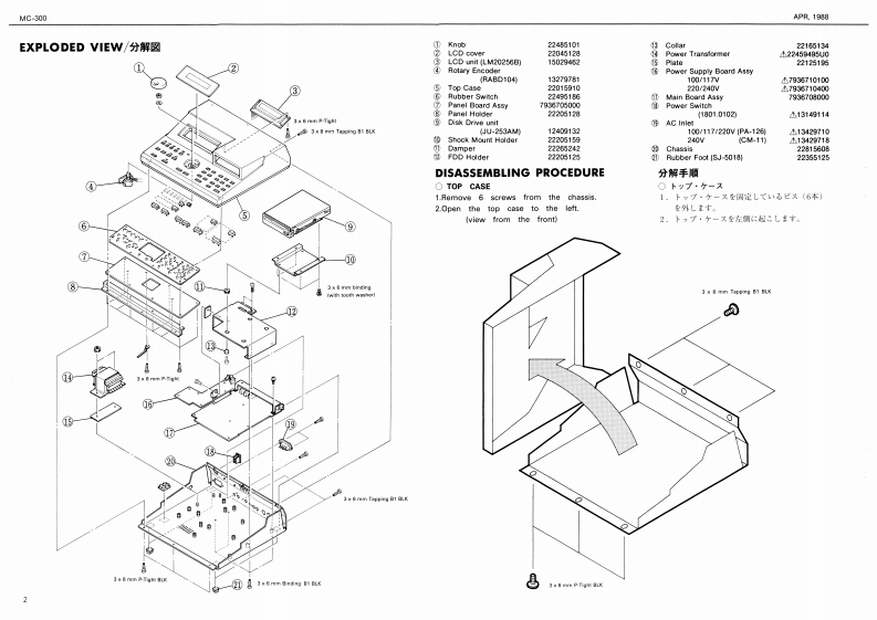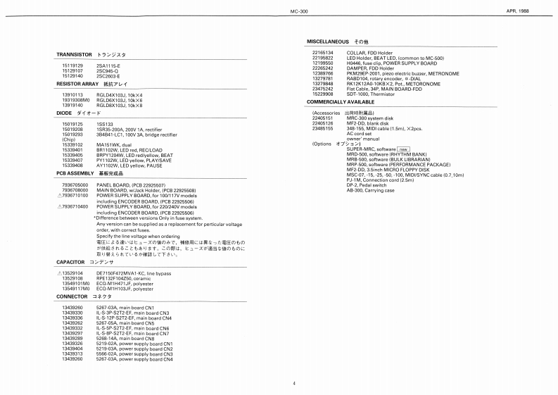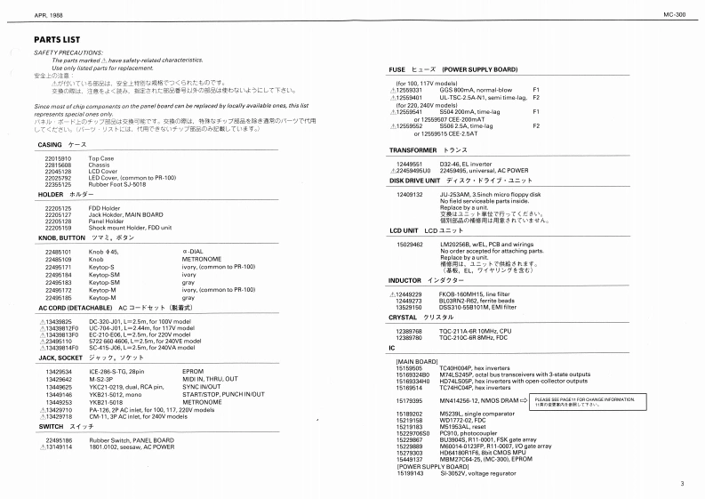 AP明.1到0MC-300MIC▣C口MP▣SE7SERVICE NOTESFirst EditionSPECIFICATIONS/仕梯击①①0[2t2333n2☒i33②21吃通233③083drai iaa40Keytops半-·卜y7熙品7-天DKeytop-5 (heeryl224951712KeM刚224951853Keytop-SM (ory22495184④Kgop-是Ea22495146AC彐▣口w22406172LCUM4a古TABLE OF CONTENTS目次PageSPECIFICATIONS仕明1EXPLODED VEW分解回2DISASSEMBLING PROCEDURE分解手顺2PARTS UIST/T-以)天卜34BLOCK DIAGRAM日2夕回CIRCUIT DESCRPTIONS国路解膜5-7天3-0L的11之T2IC DATA10子-岁TEST PROGRAM于入卜ブ口9?9-11CHANGE INFORMATION交更案内11MAIN BOARD天求一下12,13PANEL BOARD泳水一下14.15POWER SUPPLY BOARD口-竹ブ与有求=下14.15GUIDE TO MC-500 FAMILIESMC-5007y且y-1E5T0明184c■n2品42元512RolandPrinted in Japan BA-2 CR)