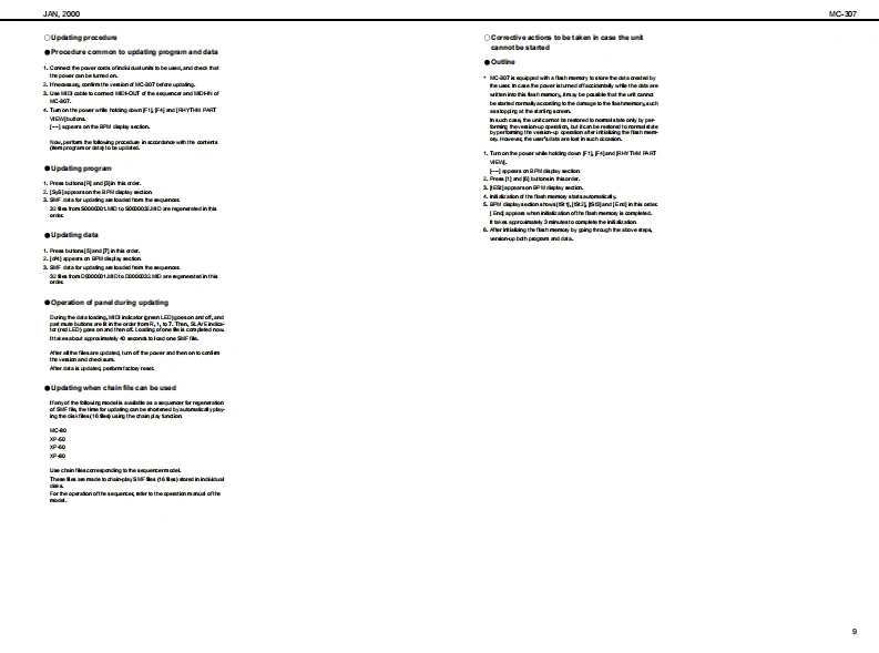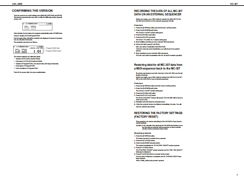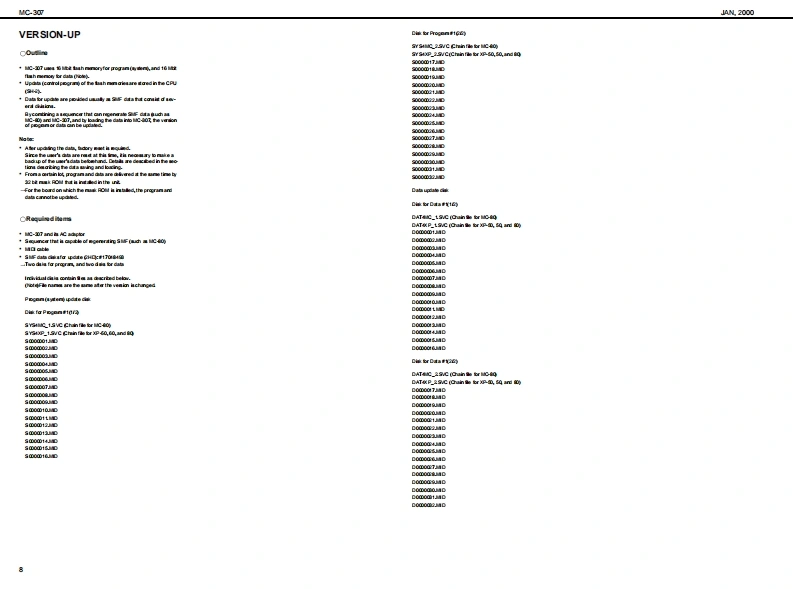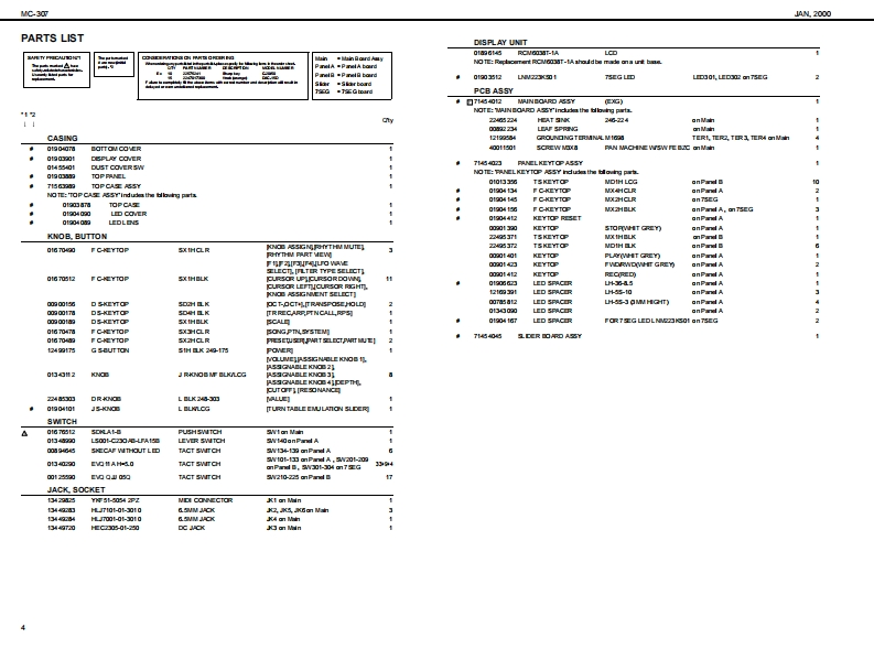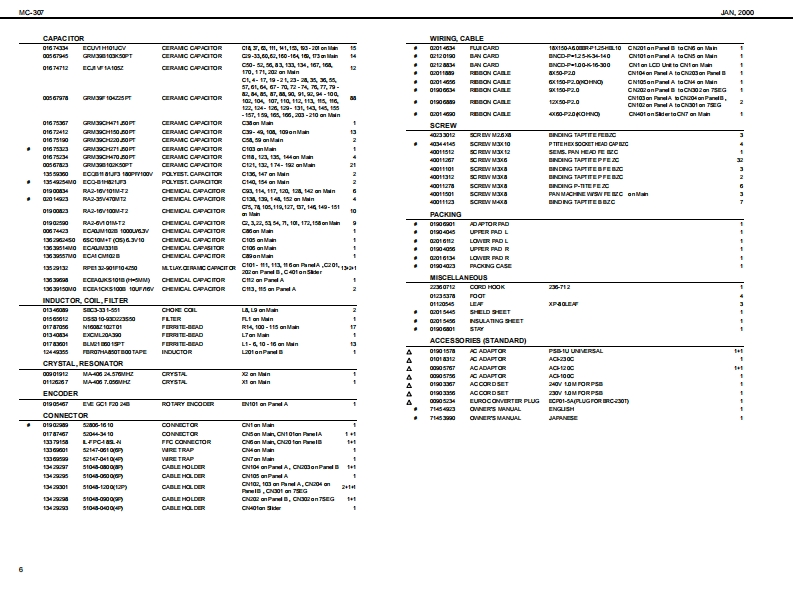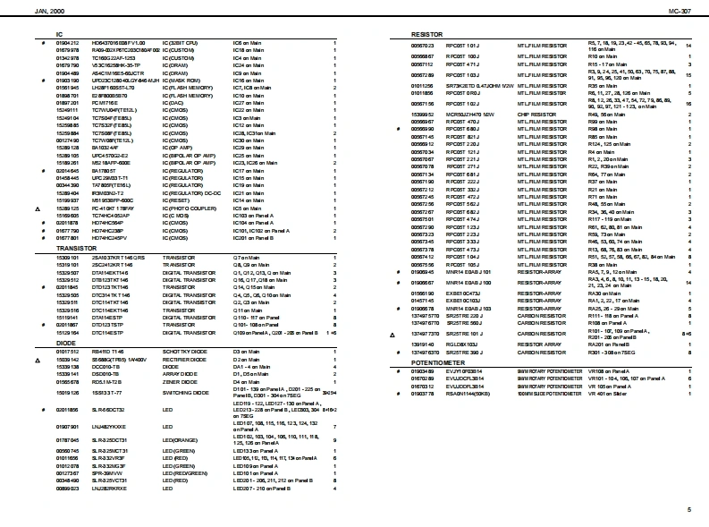 MC-307AN2000SERVICE NOTESMAIN SPECIFICATIONSMC-307:GooveboxV二3▣7First Edition●SOUND GENERATOR●G0 NNECTORSSECTONIssued by RJAO车ud40q,民240P:Cornectica,aT刀PatheaCCNackPtg通TABLE OF CONTENTSPage●OWER SUPPLYRhyy tn StDoSPECIF ICATIONS......Preae 40LOCAT ION OF CONTROLS .2g酒●Gus站DwLOCATONOF CONTROLS PARTSLIST............-.------------............---Bfedu TipeEXP0 DED VIEW.…………………Revat:EXPLODEDVIEWPARTSUST...............................................3●DIMENSIONS春-a以享盖经0x香丹端04mPARTS UST16-604x10-1雪16约xIDENTIFYING THEVERSKONNUMBER..........................................72-120)rhmUSERDATASAVEAND LOAD.............Pag童+UTECTRfCT0 RY RESET..............7ada语4e●W0HTHOWTOVERSIONUPTHE FLASH ROM........................................8-92g4014aTEST MODE..1012B0 CK DIAGRAM...........●ACCES80R1Es...13OvnrtunutCIRCUIT BOARD...1416PatanaGng的:0614292军nH0:0雪1400CIRCUIT DIAGRAM.17-21Preat240ERROR MESSAGES-.22甲C年室Lec10Song:10台8到Pecanding Mode:ACH2C 000006T0)Reatme,TR-AEC0正T78&a1aCC0①≤TRoland MC口7山r角超甲:鱼6l6a8“in te irtematof prodct●若38●CONTROLLERS(Diaplay.Kaobs,Sader)0k@+7aegmert.福charactermQtdtL90Ausignutle1-4Tumrtable Fmaton blcckTurrtable Eraldon derCAng在hCopyright 2000 ROLAND CORPORATIONRoland17059009Primed in Japan AA00 (NB)