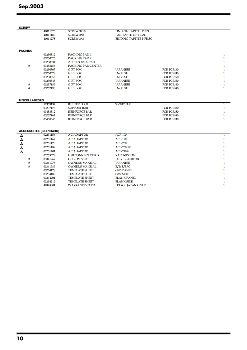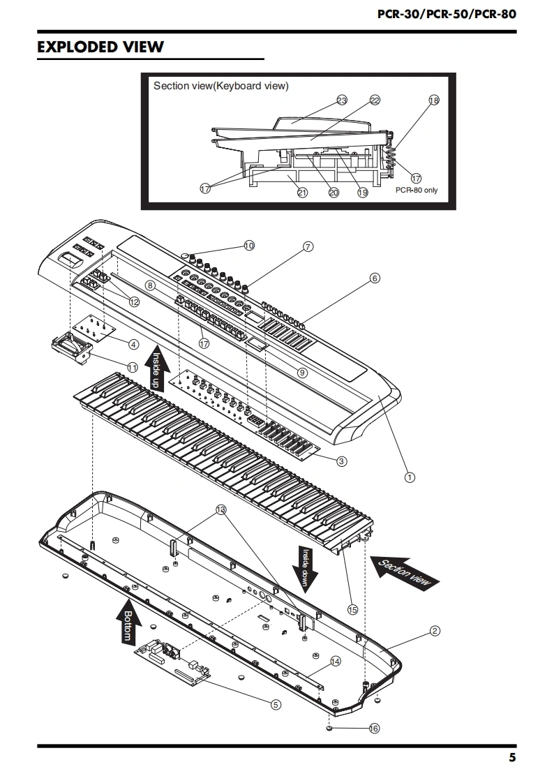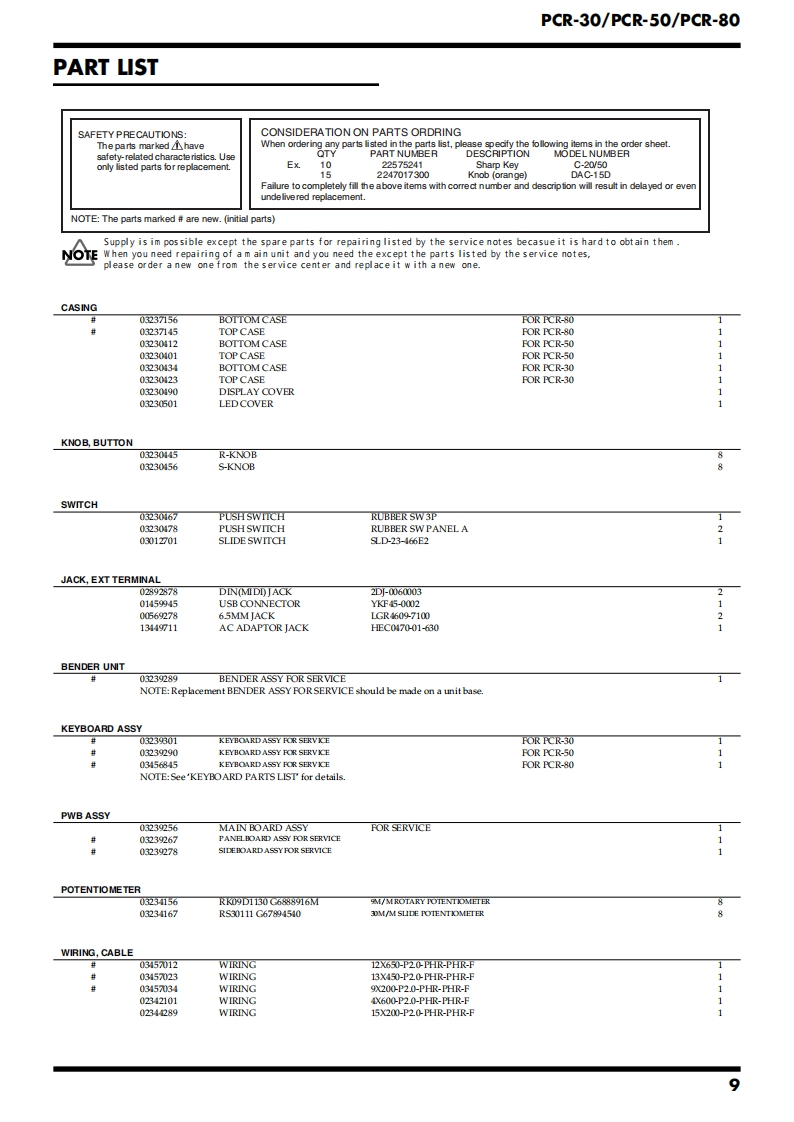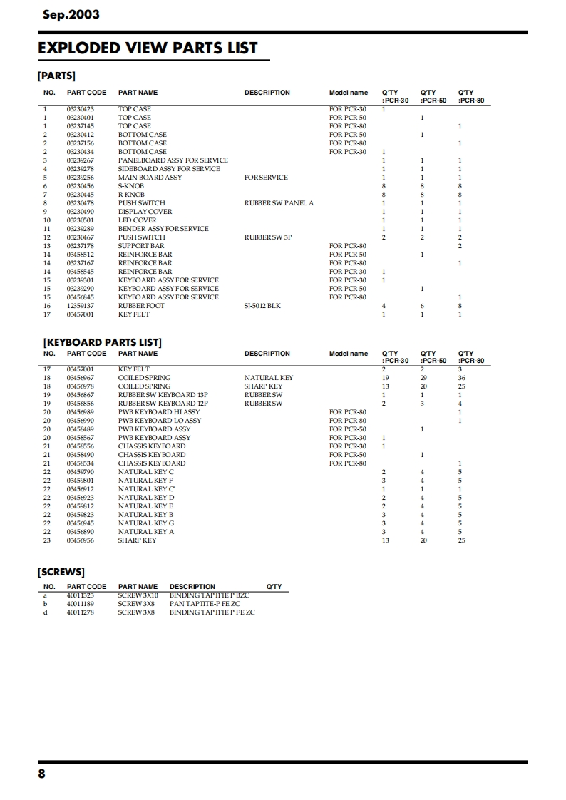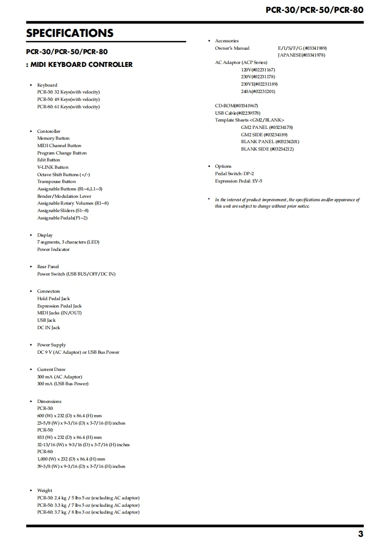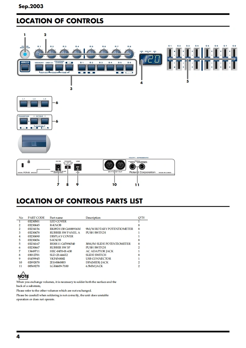 Sep.2003PCR-30/PCR-50/PCR-80MIDI KEYBOARDSERVICE NOTESCONTROLLERThird EditionPCR-30Issued by RJAPCR-50PCR-80TABLE OF CONTENTSSPECIFICATIONS.2EXPLODED VIEW..4EXPLODED VIEW PARTS LIST.............................6PART LIST......8IDENTIFYING VERSION NUMBER.10TEST MODE............10-EDIROL。。●9。。园特4-EDIROL-百。9901o9.8@帮-EDIROL-YBOARD CONTROLLFR回可单的ag日Copyright 2003 ROLAND CORPORATIONAll rights reserved.No part of this publication may be reproduced in any form without the written permissionof ROLAND CORPORATION.Roland17058130E2Printed in Japan(0400)(SC)