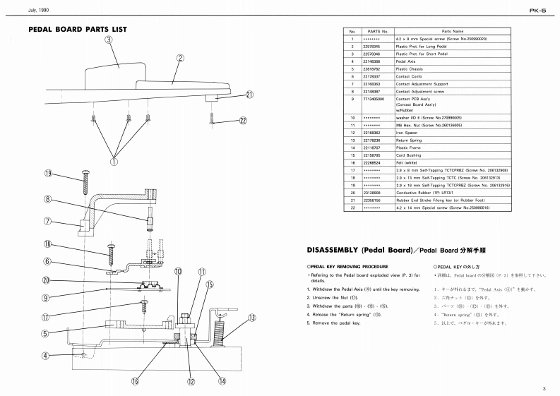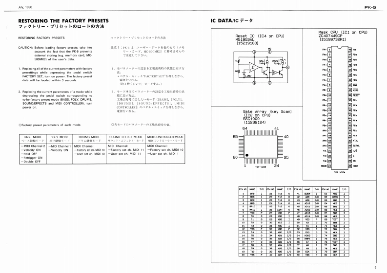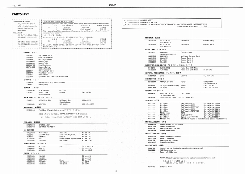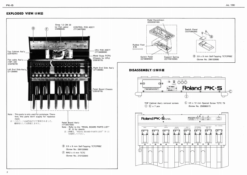 4.1990PK-6PK-5SERVICE NOTESFirst EditionDYNAMIC MIDI PEDALTABLE OF CONTENTS目次PageSPECRCATIONS仕框1SPECIFICATIONS/仕樣EXPLODED VIEW分相圆O9A8S既MeLY分解手塘POA从OARD PART5USTPEDAL BOARD-YU天OMIDI CHANNELiii11-“:1。话中aelCONTACT PCB ASSY ICONTACT BOARDICONTACT PCB A8BY OCONTACT BOAROI0O汽SOUCar AC Adaptor ACA seriesOnOUIT DAGRAM同4DCURKENT DRAWCONTACT PCB ASSY/CONTACT BOARDIICONTACT PCB ASBY/CONTACT BOARD)DOWE满0N8 UMPTI0N450mWPARTS LIST/6=7)又N5酒魔霍力BLOCK DIACRAM日32厘DBattery LifeAeprow.30 hours kalne typel:CPU PC8 ASSYCPU PCB ASSY口CUIT DWGRAM (CPU PCB A梦的i IGPU PCB ASSY)ODIMENSIONS144784M。221640¥433enchCONTROL PCB ASSYCONTROL PC8 ABSY425M60120HmORCUIT DUGRAM CONTROL PCR ASSYICONTROL PCn ASSYICWE0HT-…8b0ft7b1002ESTO啊NG THE FACTOHY PPE经Ts7r夕b-·)电7卜0日一卡为法IC DATAMIDI Cable 1.5mmc 3-35228Dwrar't Manual 20048193IEngliah/GarmaryFranch/algapinesel555P12114AI0r555P120638115028284RII4131501111TLHG4401115028g20HI川BABaterwComp/T CoverIN Sock铺M(1472G40Pedal Board Chaosis2281877价Rubber FootSwitch PanelRolandPK-523581542221G09200Right End Side Ass'y211494Ltft End Side Ass'Y121128494Roland PK-5CSKHCAA2元MA41312978390C22220321001M×象mm Block切obEc0470016305Cw○235EU01I113449711Ped山I Board ChassisM3 x 10 mm Cup head TCTC2218776Rubber Feat(or Spacer M3 ART SJ50121IScrew No.2151330104日29×8mm5aM-Tapping TCTC%B25cew40.20613204(C 35 x 12 mm Special acrew TCTC T9(Scnnw No.250990017)--Pedal Board Ass'y7T112160D2.9 x 6 mm Self-Tapping TCTCS0ewN0.20113290wRolandPrinted in Japan IAl-21 (CR)