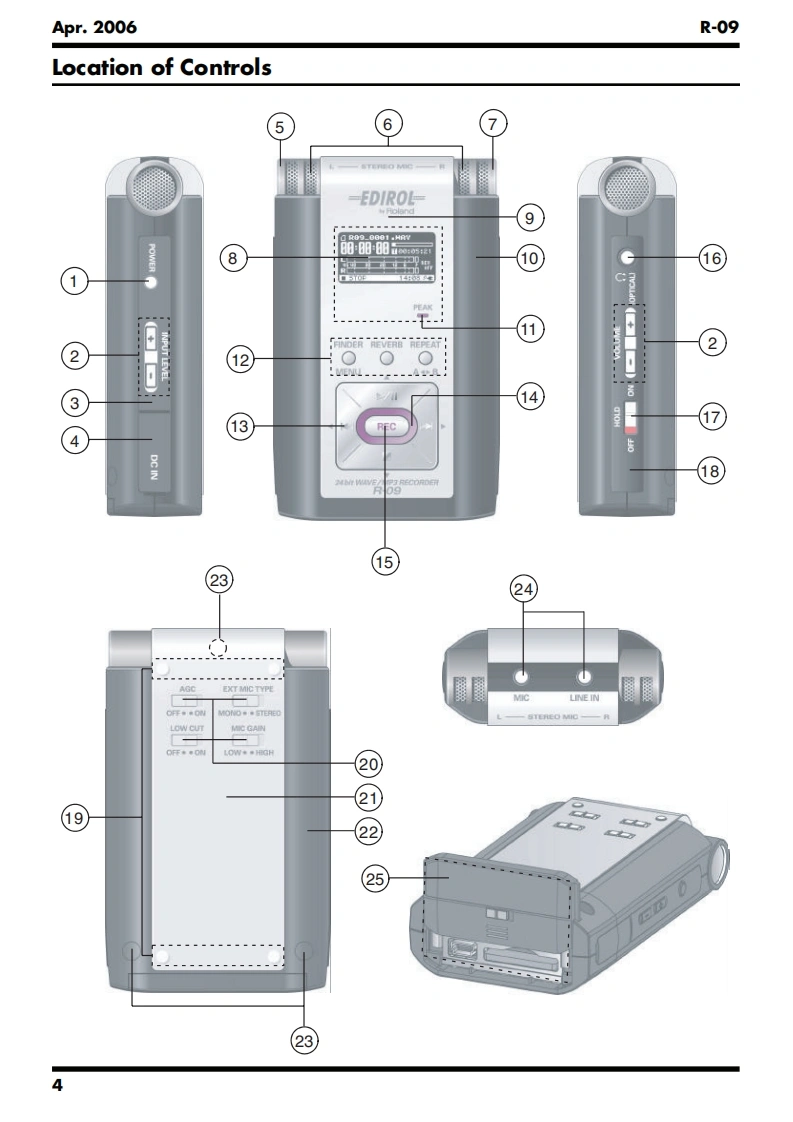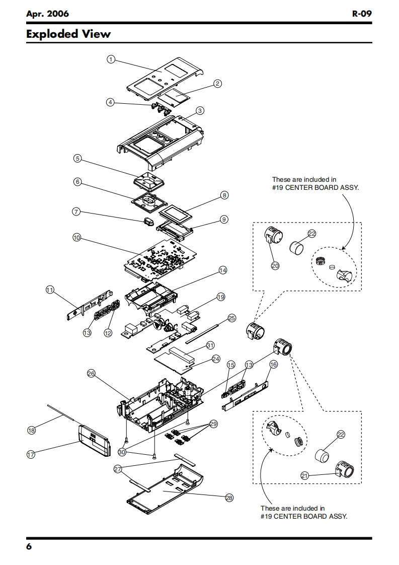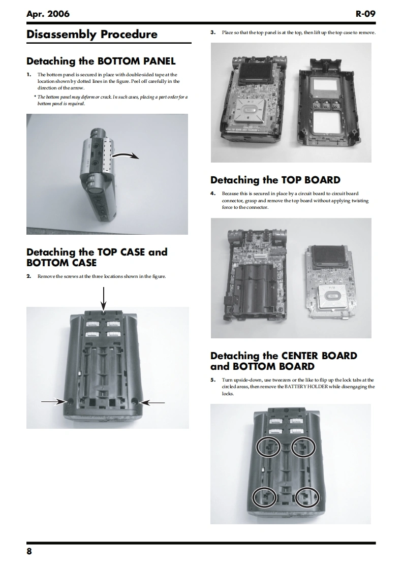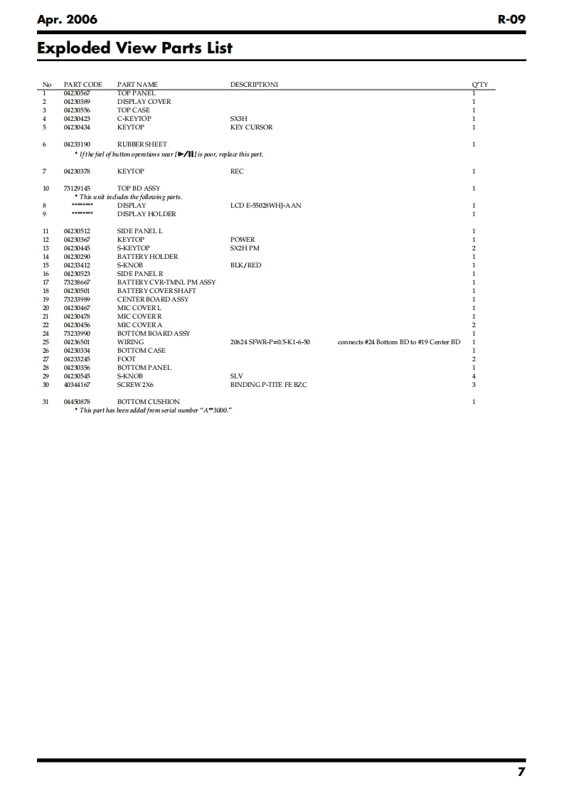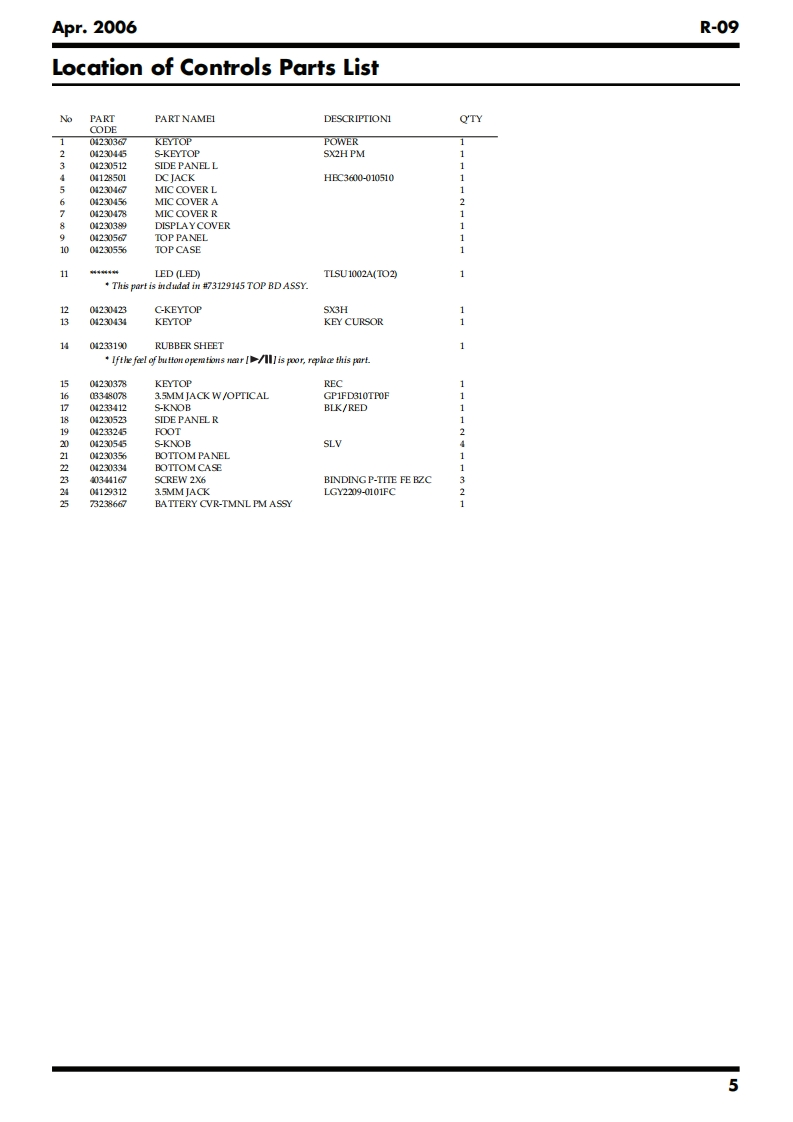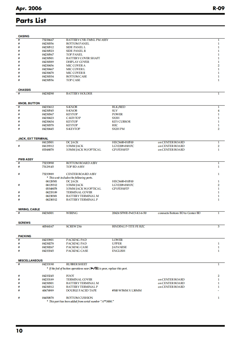 Apr.2006R-0924bit WAVE/MP3 RECORDERSERVICE NOTESR-09Issued by RJATable of ContentsSpecifications.....Circuit Board(TOP BOARD 1/2)...24Location of Controls....4.Circuit Board (TOP BOARD2/2).......5Location of Controls Parts List.....5.Circuit Board(CENTER BOARD 1/2)26Exploded View.….6Circuit Board(CENTER BOARD 2/2)27Exploded View Parts List...Circuit Diagram(TOP BOARD1/4)..……28Disassembly Procedure........8Circuit Diagram(TOP BOARD 2/4).30Parts List10Circuit Diagram(TOP BOARD 3/4).32Checking the Version Number.12Circuit Diagram (TOP BOARD 4/4)34Factory Reset Instructions.12Circuit Diagram (CENTER BOARD 1/2)..36System Software Updating Instructions.................12Circuit Diagram (CENTER BOARD 2/2).....38TestCircuit Diagram (BOTTOM BOARD)......40Block Diagram…….22Messages.........40STEREO MIC-EDIROLby RolandRO9_0001 .HAV800000o9:os:2STOP1408PEAKFINDER REVERB REPEATOMENUAB/REC24bit WAVE/MP3 RECORDER-09Copyright 2006 ROLAND CORPORATIONAll rights reserved.No part of this publication may be reproduced in any form without the writtenpermission of ROLAND CORPORATION.Roland17058420E0Printed in Japan (0400)(SC-KWS)