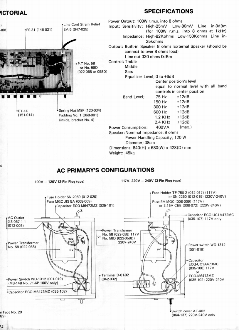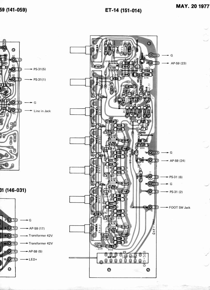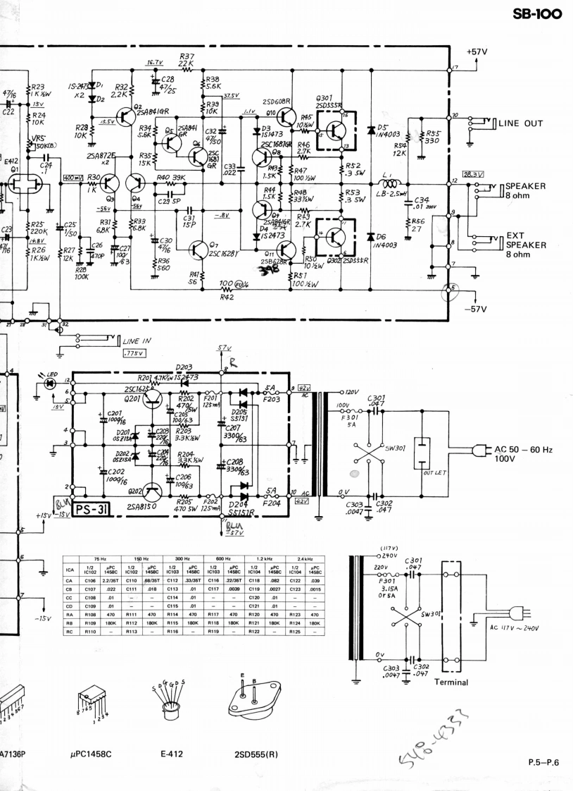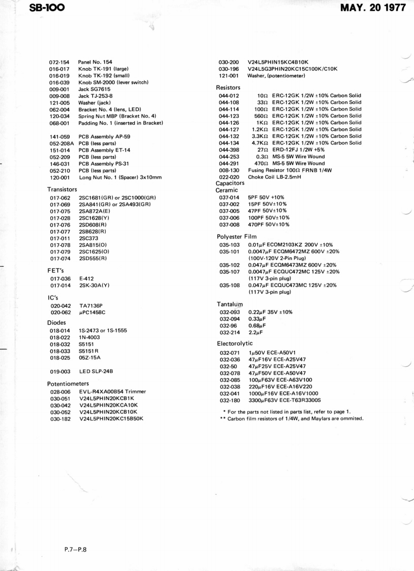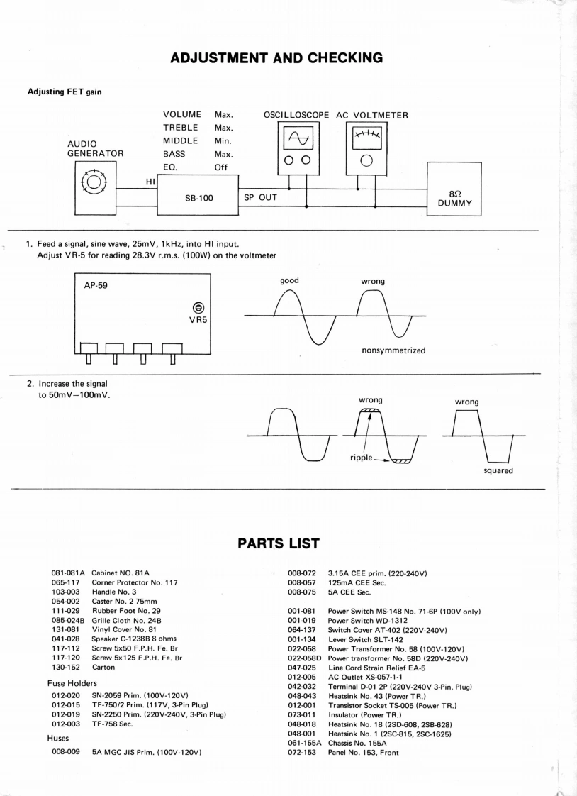 MAY.201977SB-100PARTS PICTOSB-100SERVICE NOTES,TR.2SD-555R(017-074)PARTS LOCATIONFirst EditionTR.Socket TS-005 (012-001Pot.V24L5G3PH1N20KC15C100K15C10K(030-196)Pot.V24L5PH1N20KC B10K(030-052)Pot.V24L5PH1N20KCB1K(030-051)Pot.V24L5PH1N20KCA10KShassis No.155A(030-042(061-155A)Knob TK-191(016-017)JackPot.V24L5PH1N20KCT-253-815B50K(030-182)】(009-008)Knob TK-192016-019)Jack SG7615Pot.V24L5PH1N15KC(009-001)4B10K(030-200)AP.59(141-059)86西56©06西西.SW.(See page 2)-LED SLP.24B(019-003)Bracket No.4 (lens)(062-004).Panel No.153(072-153)-Knob SM-2000(016-039SW.SLT-142(001-134).Grille Cloth No.24BDISASSEMBLY(085-024BTo dismount chassis assembly remove eightscrews indicated.05×50FRH Fe.BrSP.C-1238B(041-028)(117.112)SP.Cord LS-100(053-075)t5×125FPH Fe.BrCorner Protector No.117(117-120)(065-117)Line Cord Strain ReliefCabinet No.81AEA-5(047-025)(081-081A)(012tFuse Holder(See Page 3)Jack SG7615(009-001)Handle No.3AC OutletHeatsink No.43(108-003)XS057-1-11048-043)Powe(012-005)Panel No.154No.5(072-154)Powe(MSCapaCaster No.2 75Rubber Foot No(054-002)(111-029)RolandPrinted in Japan Apr.1982 E-2P.1-P.2