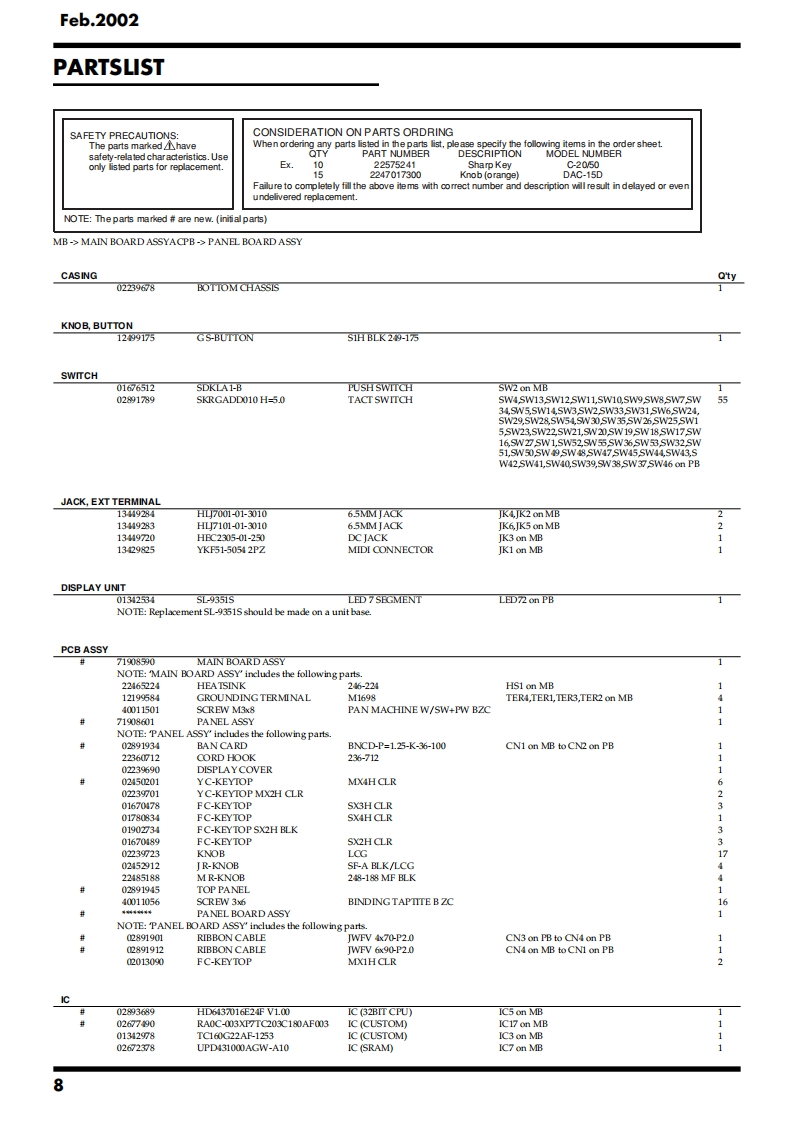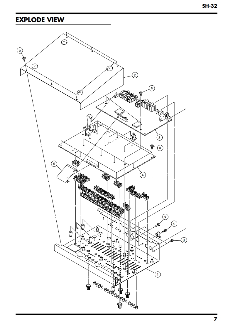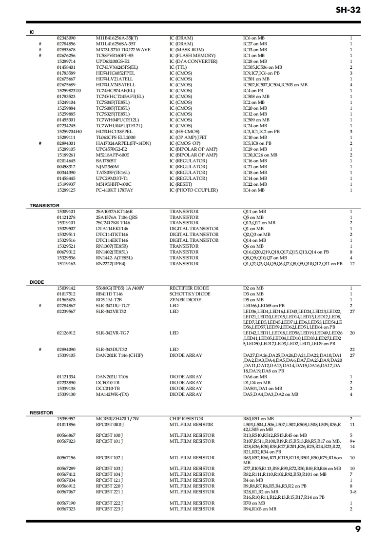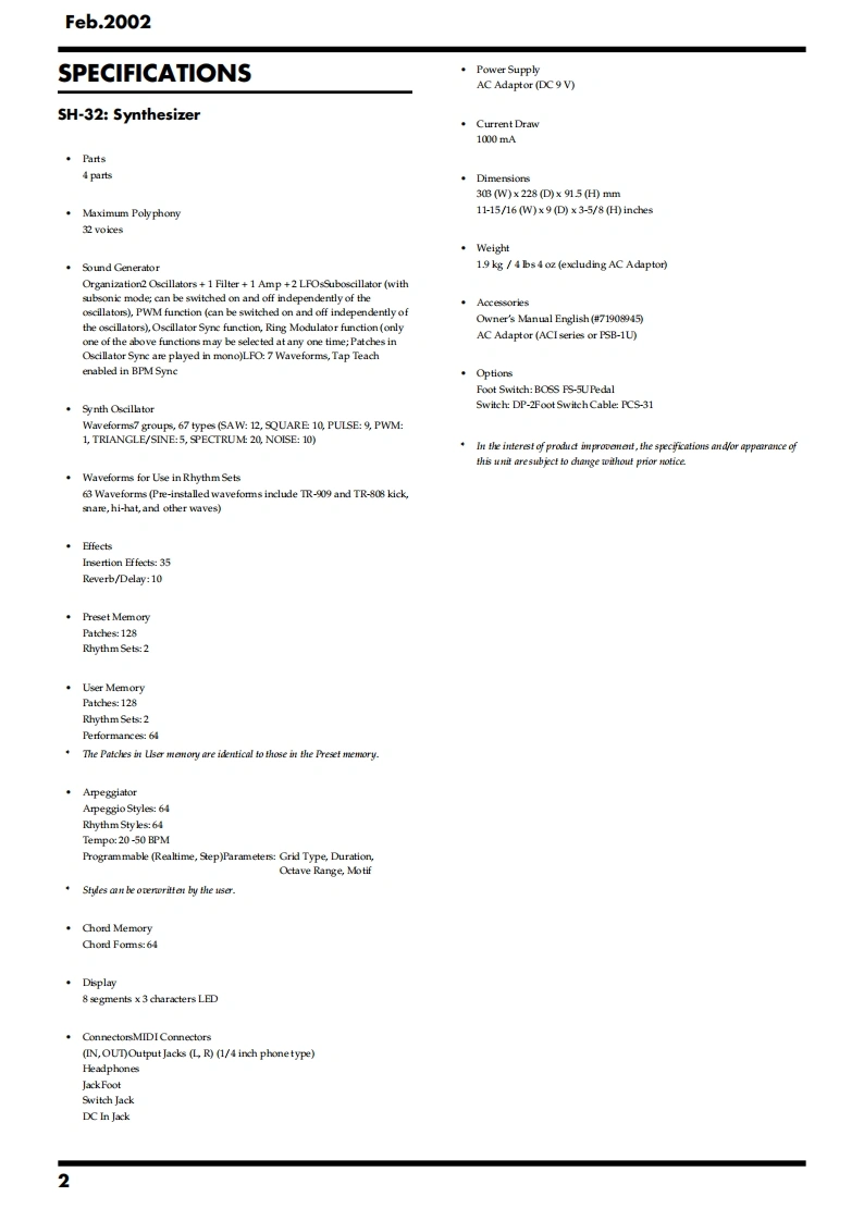 Feb.2002SH-32SH-32SERVICE NOTESIssued by RJASYnTHESIEERTABLE OF CONTENTSSPECIFICATIONS......2PROCEDURE FOR UPDATING THE SOFTWARE....13LOCATION OF CONTROLS PARTSLIST....TESTMODE..14LOCATION OF CONTROLS...............5.BLOCK DIAGRAM......16EXPLODED VIEW PARTSLIST6CIRCUIT BOARD (MAIN))18EXPLODE VIEW.7CIRCUIT DIAGRAM(MAIN 1/2).........20PARTSLIST.......8CIRCUIT DIAGRAM (MAIN 2/2)......22IDENTIFYING VERSION NUMBER............12CIRCUIT BOARD (PANEL)..................24SAVING USER DATA RELOADING SAVED DATA....12CIRCUIT DIAGRAM(PANEL).....28RESTORING THE FACTORY SETTINGS..........12ERROR MESSAGES..30LIMOND-DUEPUT-R0SC1&2FILTERNTENSITYNS-FXOUTPUTCUTOFFosc 2U SPECTRUNAMPOCTAVE SUB OSC●REW/DELAYLF01&21/RND88843ARPEGGIATORVALUETAPOSC 1 PAFTosc 2H国WD步42TsRolandSYmTHESIEER SH-32Copyright 2002 ROLAND CORPORATIONAll rights reserved.No part of this publication may be reproduced in any form without the written permissionof ROLAND CORPORATION.Roland17058033E0Printed in Japan(0800)(NB)