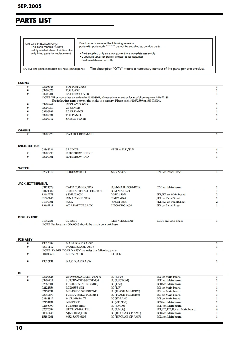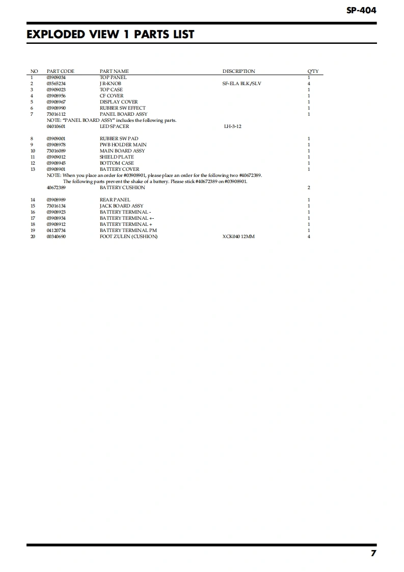 SEP.2005SP-404SP-404SERVICE NOTESIssued by RJATABLE OF CONTENTSCAUTIONARY NOTES2USERS DATA SAVE AND LOAD.14SPECIFICATIONS3Instructions for System Initialize14LOCATΠON OF CONTROLS..4SYSTEM UPDATE INSTRUCTIONS..........15LOCATION OF CONTROLS PARTS LIST......5TEST MODE..........16EXPLODED VIEW 1...............6BLOCK DIAGRAM.........18EXPLODED VIEW 1 PARTS LISTCIRCUIT BOARD (MAIN BOARD)....EXPLODED VIEW 2......7.208CIRCUIT DIAGRAM (MAIN BOARD)..EXPLODED VIEW2 PARTS LIST9CIRCUIT BOARD (PANEL BOARD,JACK BOARD).......24PARTS LIST.10CIRCUIT DIAGRAM (PANEL BOARD,JACK BOARD)...26CHECKING THE VERSION NUMBER..14ERROR MESSAGES8L-LNE OUT-R L-LE IN-RNOCIINOWE共CWGNSP-404VOLUMECTRL 1CTRL 3/MF0+提RolandBPM/VALUPATTERN SEOUENCER图网GATE LOOPHOLDUPADMEMORY CARDMC LEVELCopyright 2005 ROLAND CORPORATIONAll rights reserved.No part of this publication may be reproduced in any form without the written permissionof ROLAND CORPORATION.Roland17058345E0Printed in Japan(0430)(AS)