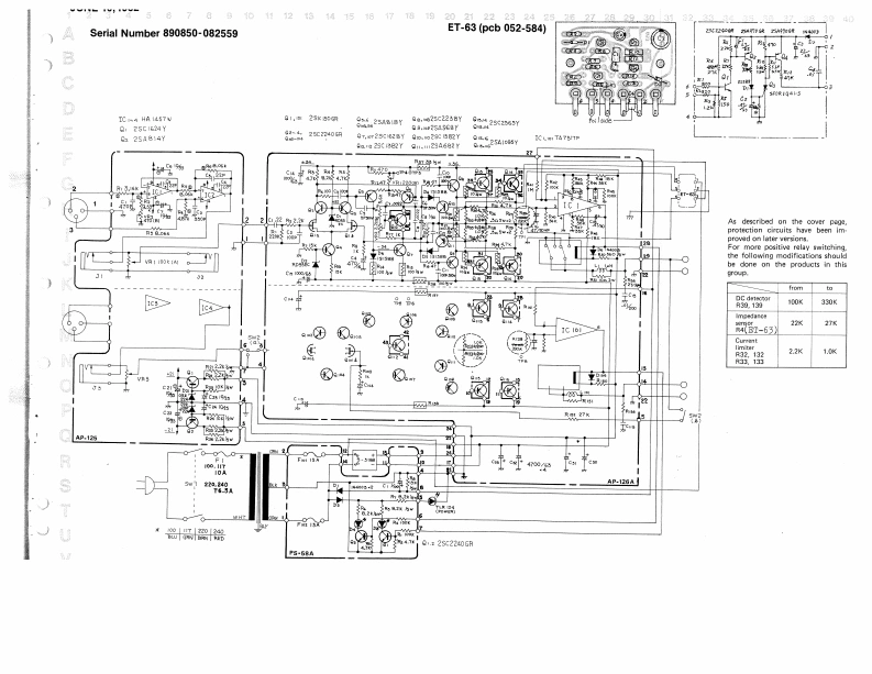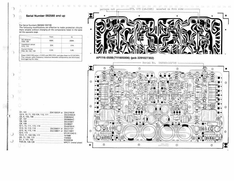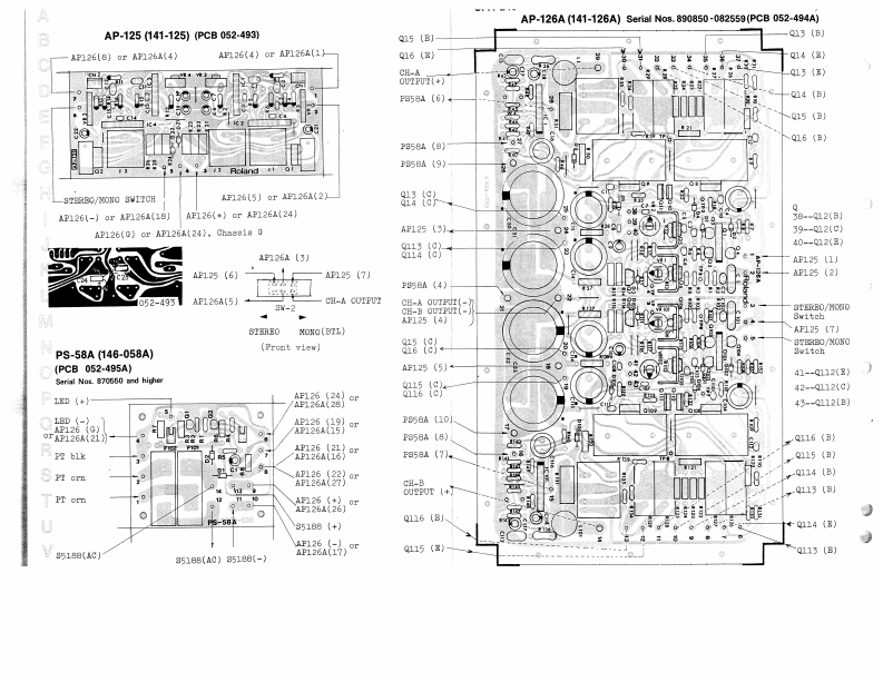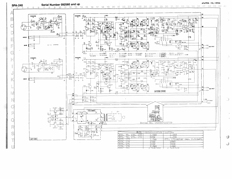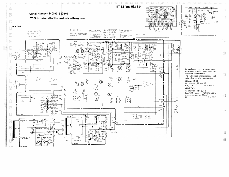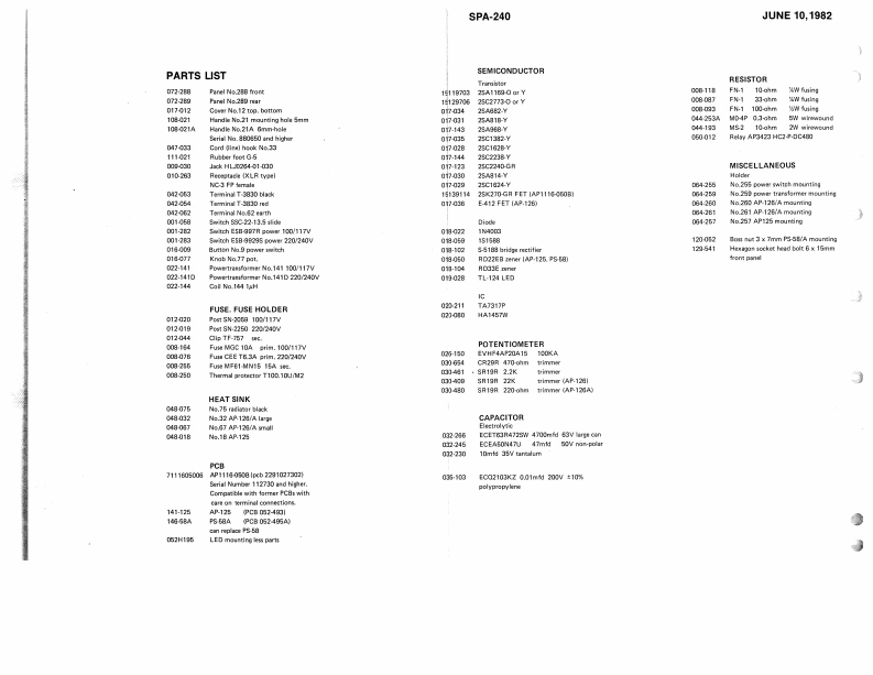 SPA-240SERVICE NOTESIMPROVEMENTS COMPONENTS CHANGESSecond EditionPROTECTION CIRCUITSSPECIFICATIONSThis issue makes the first editiom obsolete.The protection circuits incorporated in the SPA 240 of various versions lexopt aarly modell have undargone design changes to have more raliable parformance.The changes are mainly concentrated an DC Levelinput levalDectorand Low Impedance Sersor.+4dm1.23WTHD:bomor thun605转德d+4dm1.FeU情rCyg04et-m地,±9BOUTPUT DC LEVEL DETECTORUntalanced0时wct市0 Cbias at speoler terminal (radio wares of hig中rgg,hen indu3ed,sity ampified:sam时imsnput inped山rcaPowtr bandwidthe20业=0地to the extent to become asymmetrical waveform which canstitutes DC).And opan-tircuits speaker eircuit已d由星5对:Damping factor:befler than 7by energizing a nalay upon detecting DC exceeding predetermined leal,Change:Threshould-from 1.85V to 4V allowance for torelance.sN广A"waigheed:input shortedOutputbetlar Ihan 110dB3pm,0604t0160LOW OUTPUT IMPEDANCE SENSORSpeaket,monodio162Aose开h样g网ercrcuit wit价the relay when it becames less than4ghT际Pawer co0210WChange:Bias souree for the first transistor of this stoge -from pesitiv supphy to pround to make theOutput paw智0e一2江k田cirouit immune from an DC supphy1o410月301r0+IOW HOITEMPERATURE SENSORMerras on heat sink and activates relay when owerheated.No change.CURRENT LIMITERRegulates output ourrent.Suppresses input signel levl at power amplifler stage in propotion as speskerimpedan住dcr网Change:Loosen torelanes to extend dynamic range.Nat all of changes took place in porallel with,but with some modifications on diferent part.Theproductiond are prouped into four sections in this Servioe Notes.GroupSerial Number1840100004923890850062559092560.102729112730Ofb No is the latest and the remainder of vensions should be modifieds eesry.Modificationprocedures are on rulated poges as a reference for updatingRemowsl of top cover provides accestibility for amost all servicingPOWER TRANSISTORSBecause of dscontinuance at the manufacturer.Roland has changed power transistrs.SPA-340BLOCK DIAGRAMfrom25A100528A11825C256529c2773in replacing power transis时o作,the followin0 must be observed in Eght of tone chara试sri时ic.Use NPN and PNP transisters of the same hfe range IY ar Ol in a chonnel..Do not mixuse diffarant brand in a channel even they hove the same suffix IY orRolandrinted in与pan831