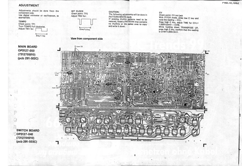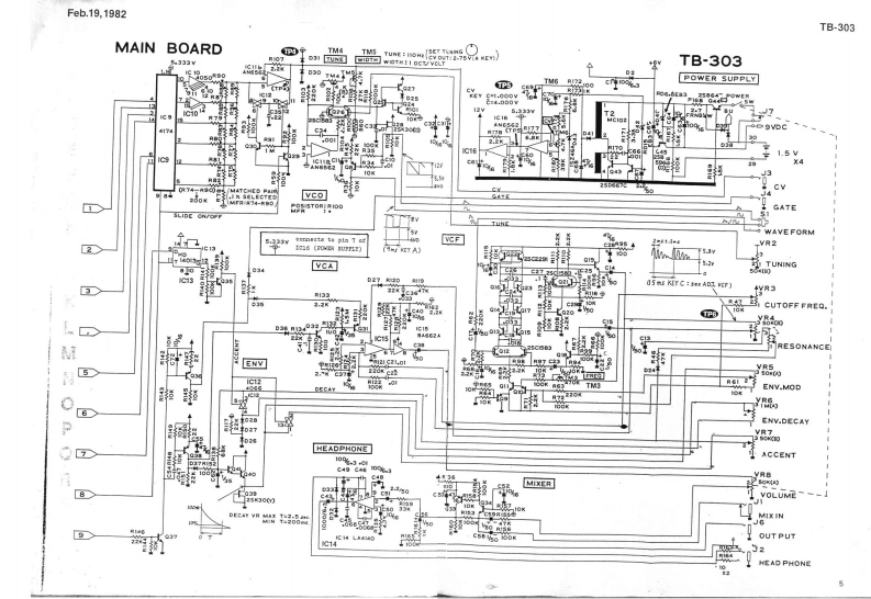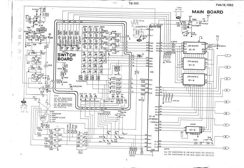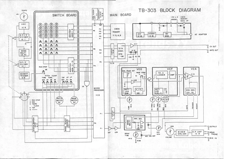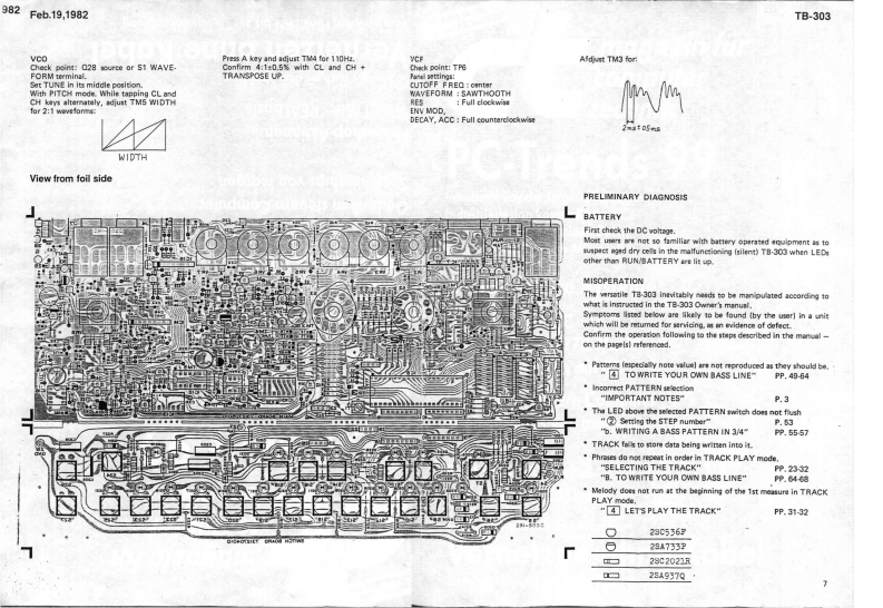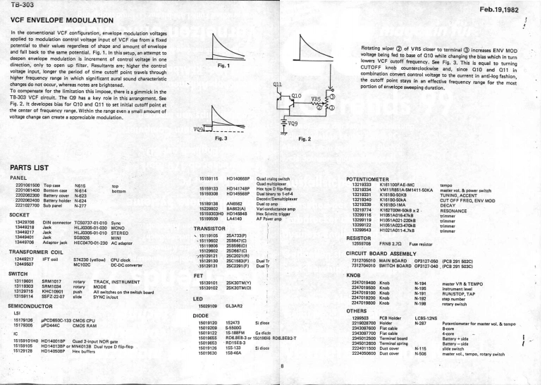 Feb.19,1982TB-303TB-303 SERVICE NOTESFirst Edition04ny4wN4742公f20uSPECIFICATIONST#n#e94-4Y2346912500PATTERN MEMORY CAPACITYCONNECTIONS64:8 IPATTEANI x 2 IPATT.SECTIONI x 4Output:Impedanca 10kIPATT.GROUP I.Il M]Contants:Pitch,Vale.Accant.SiideHeadphen:Impedance30MINIMUM STEPGate Dut:OFF:OV:ON:+12v园CV Out:+IV to +5V [1 volt/eetlSTEPymeasureSYNC In:DIN cornectorMIX In:Impedane单t00xn·◆1o164p52.3or4 metarip+1 to 15 ghaps (2,3,4 or 5 materlGain:UnityPOWER3 celaves (PATTERN)WTRANSPOSE6V:1.5V bettery x 44 octaves [TRACK)w/Key shift9V:AC adeptorTRACK MEMORY CAPACITY90A0120m464 meases/TRACK Total 256 measures (64 x 7Dimersions:300[W)x 146(DI x 55[HI mmTRACKslWeight:1.0 kaContents:Patter Crder.T开ANS0SE.D.C号Van64ry0J1z70501113p6610网TUNING Control:approx,:700 cents Iperfect行边】TEMPO Control:(-40 to 3001cEn钟M14G6t00READ"PRELIMINAAY DIAGNOSIS"ON PAGE7BEFORE STARTING TROUBLESHOOTINGLE开Gw34移112197740Por.K18180-60A (1218d1Pt1话131A32i9P6,长线18080h0I1J2引51tDTep ca N412tt5301041852五4201920eSCREWS-3x 10mm B:,Fe,Cr,Binding.Self taepingsc月Ews⑤-④3x18mmBi.Fa,NL,Binding.Salf tapping提器BOTTOM CASE REMOVAL SCREWS:--uL-03053442热地4提6142t0614¥*55乙126013h114转Roland01340Printed in Japan AH2-1tLa出60101061144时17升8Nw4nw+Tcs0701G58134970