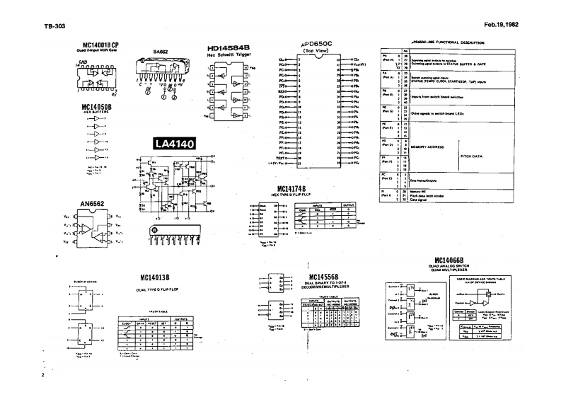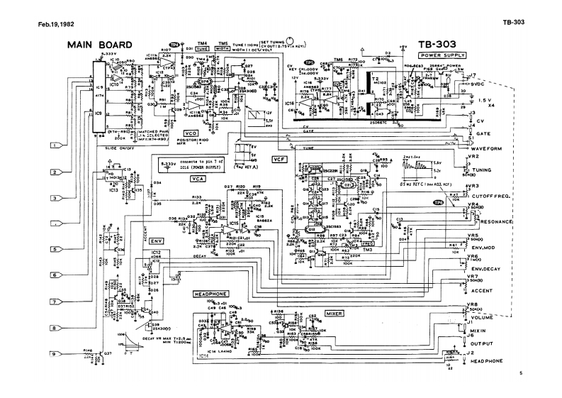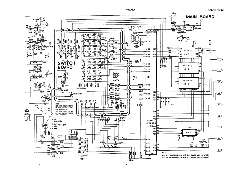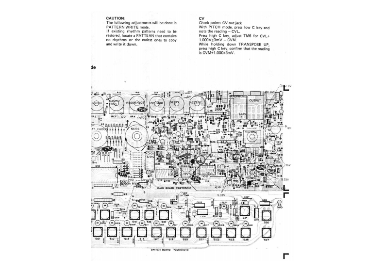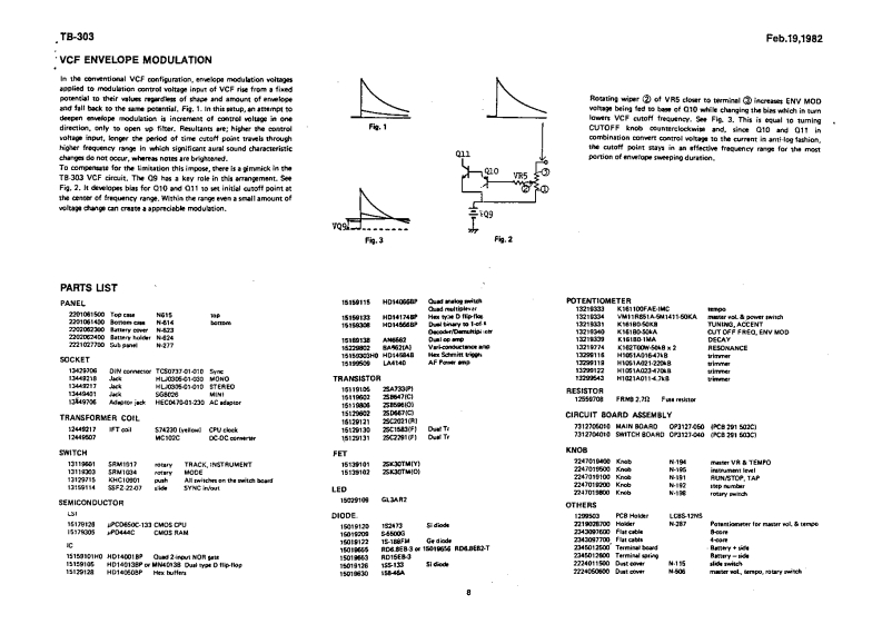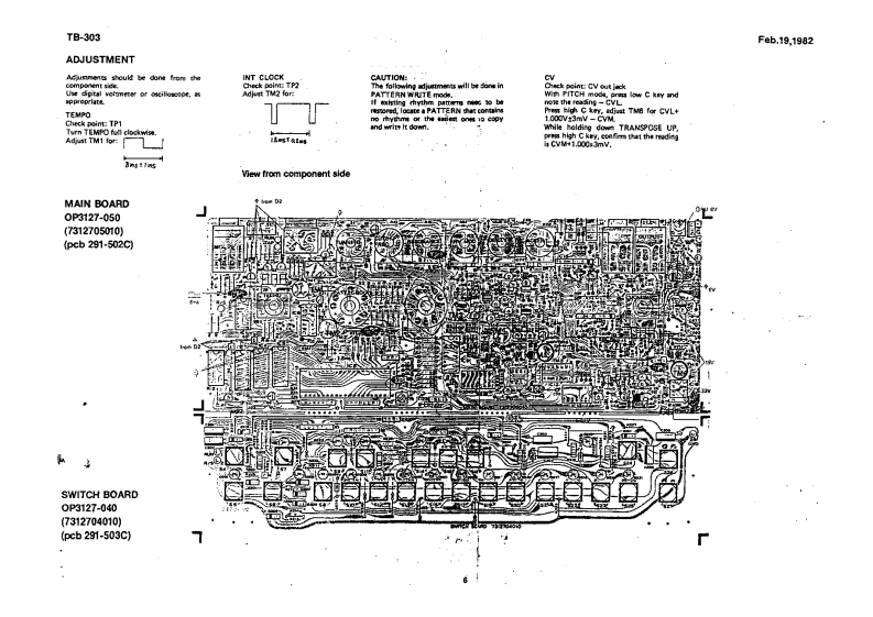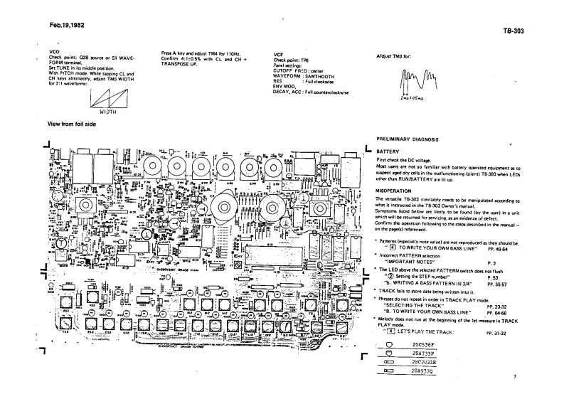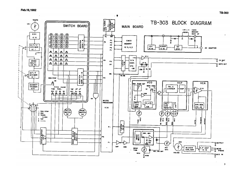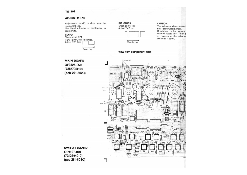 Feb.19,1982TB-303TB-303 SERVICE NOTES=nnaM242N2*490First Edition44满24019弹SPECIFICATIONSe N-123 48012000-PATTEAN MEMORY CAPACITYCONNECTIONS64:8 (PATTEANx 2 [PATT.SECTION)x 4IPATT.GAOUP I,H.Il.IV)Headphone:Impedancs t030Contents:Pitch.Vale.A红L,5I为Gate Ou:OFF:QV:ON:+12V线UM STE字Cy Out:+1V to +5v 11 valuoct)同-湿SYNC In:DIN connectorSTEPs/mexuireMIX l:Impedance 500kn-2+11D1642,304melGain:UnityPOWER3ocaees (PATTERNI w/TRANSPOSEGV:1.5v bottery x 44octmes (TRACK}wiKey shitt9V:AC agacoor30m40120n4TRACK MEMORY CAPACITYDimersions:3000Wl x 1461D!x 55(H)mm,ebe*1wyn为0e201日r5/TRACK To3256mau尼H1】Weight:1.0 kgCoomte Pautern Oider.TRANSPOSE.DC.5TUNING Coneol:Fpr@¥.:00 cevns ip时K“dhlTEMPO Comtrol:40 to 3000HEAD -PRELIMINARY DIAGNOSIS"ON PAGE 7BEFORE STAPTING TROUBLESHOOTINGP#,E11oAI3时t超a4M特10w43SCEW5①④3g10mm,Ft.C,Bdig.St1ongSCEs⑤-03×18mm,FkL,din.Se11 appingBOTTOM CASE REMOVAL SCREWS:.vu.u.ul y的”n41422061400ew.184E241TC3072D00530Rolandhini园in Japan AH214Lcg1g10门34th升